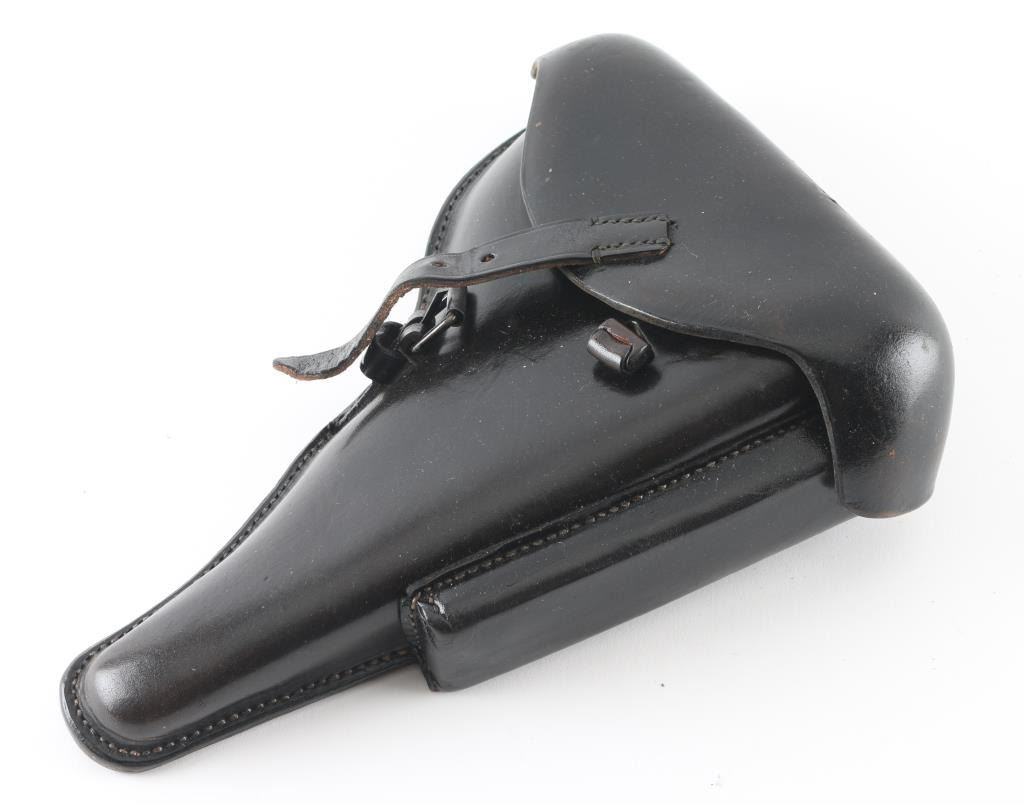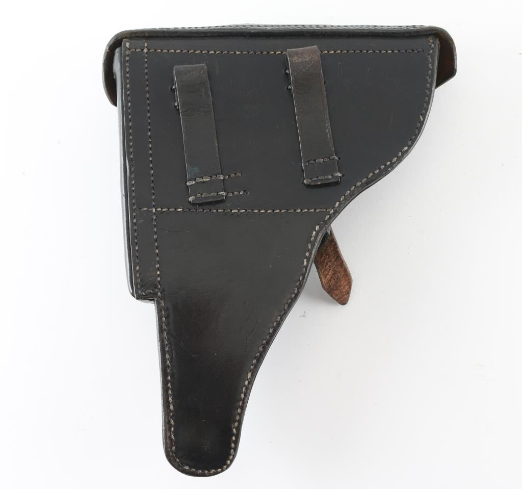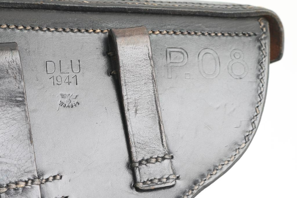 Third Reich era German Military holster for the P-08 Luger Pistol. Hard shell. Black leather construction. Large "P.08" stamped on back, makers code dul 1941 and waffenamt, Eagle/WaW641. Intact, very good condition.
