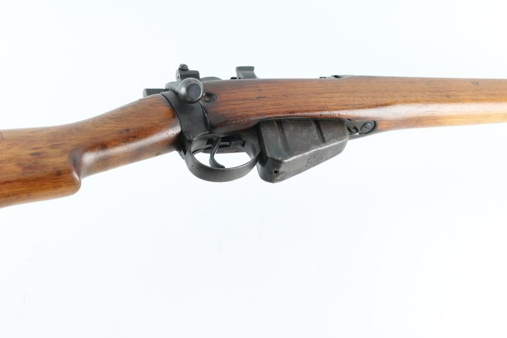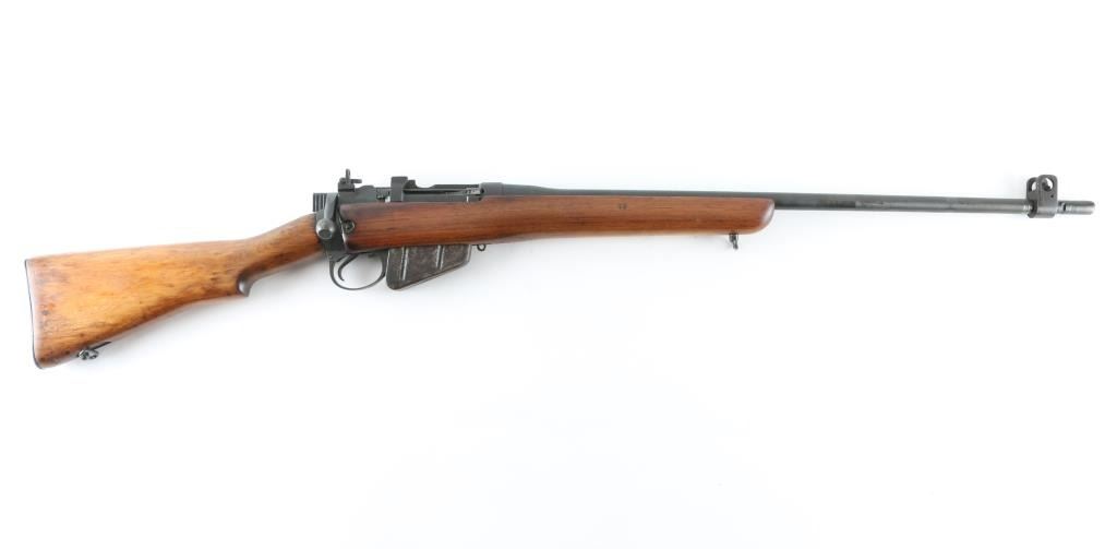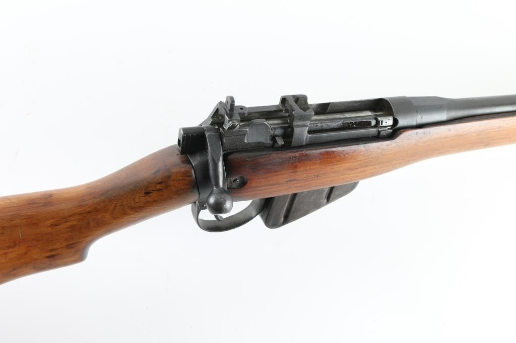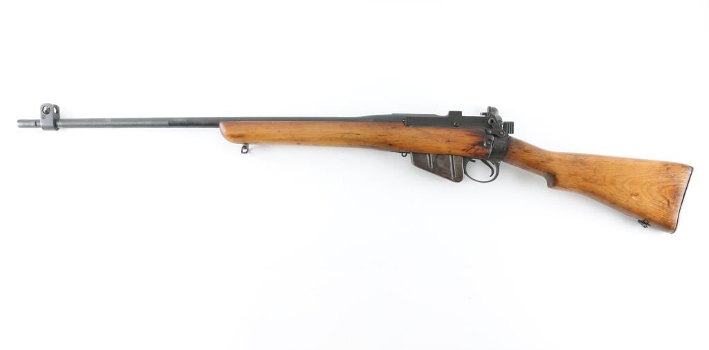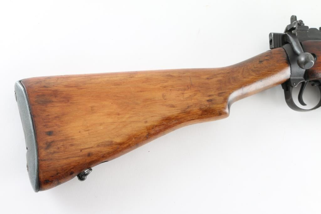 Sporterized WW2 British Infantry rifle. Made at Maltby arsenal in England in 1943. Receiver and 25” barrel are blued . Military flip peep rear sight . protected front blade sight. The military butt stock in place, handguard removed, and forearm modified to sporter configuration. Commercial sling swivels attached. The bore is good with rifling present,. The metal finish is very good with minor edge wear, magazine id mostly in the white. Wood is very good, and has been re-finished. Action is crisp/tight. NRA Condition-Very good/Sporterized. C&R firearm