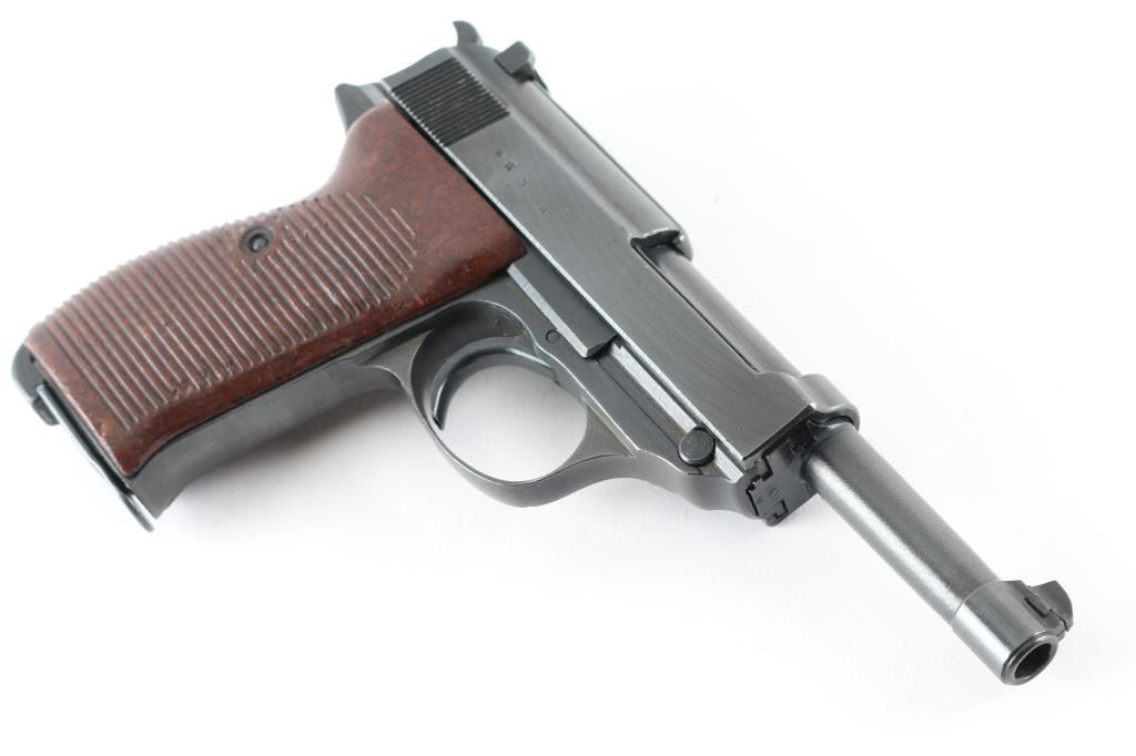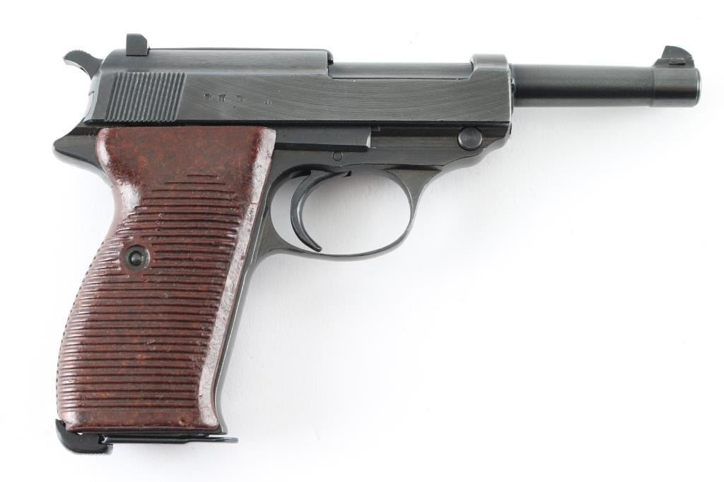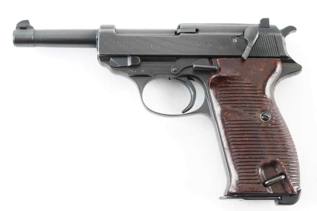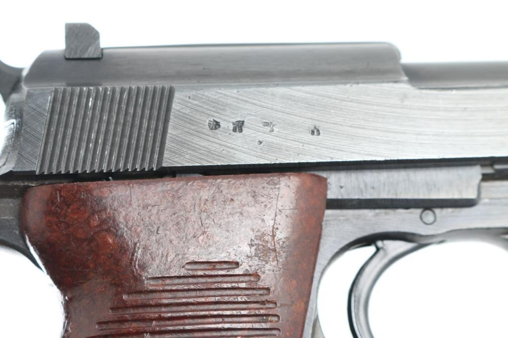 Pistol. Semi-Automatic. 8 rd Magazine. Third Reich era military issued sidearm. 4.9" barrel. Short recoil, hinged locking piece assisted breechblock. Produced from June 1942 to April 1945 at the Grottau, Czechoslovakia factory. Matching serial numbers including the locking block. Waffenamts/eagle 88. Has been dip blued, possibly a Russian capture. The right slide rail is stamped "TG Imp WPB-Fl". "cyq" is stamped on the slide, and barrel lug. Bore is very good/bright with strong rifling with some very minor pitting. Bakelite Walther grips very good. Blued finish is about 98%with some scratches. Original Walther magazine stamped "jvd" NRA Condition-Very Good/Dip Blued C&R firearm
