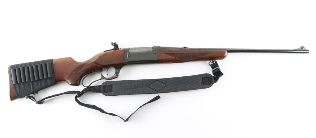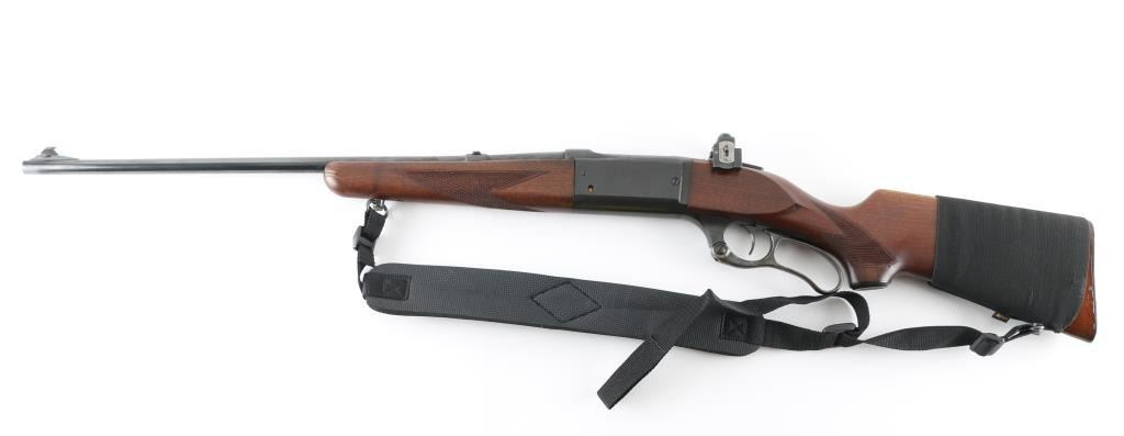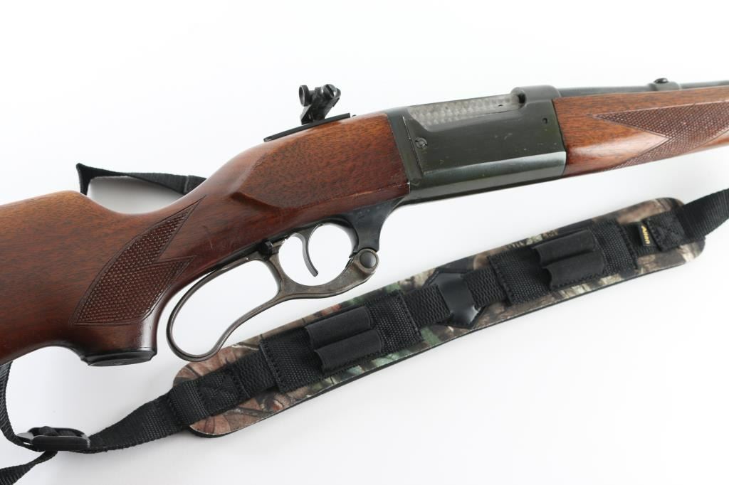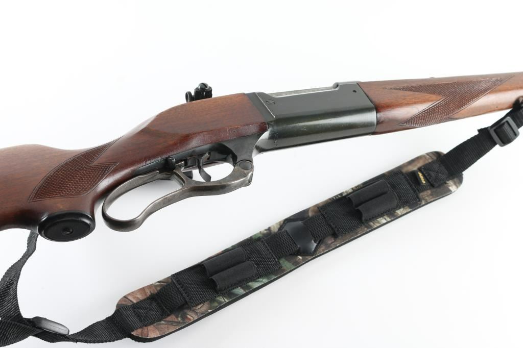 Lever-Action rifle chambered for .308 WIN cartridges, circa1956. It has a rotary magazine, 22" round tapered barrel with ramped post/bead front and a fully adjustable Lyman rear sight. It has a cocking indicator on top of receiver and an early unique brass cartridge counter visible in a window on the forward left receiver. The bolt is jeweled and while worn still looks good. The lever is color case hardened and some color is still visible. The wood stocks are checkered at the wrist and on the forearm with a black textured grip cap and serrated metal butt plate. The metal finish shows some indication that it may have been reblued due to what appears to be some surface pitting under the bluing. There are a few small spots of surface rust on the barrel. Wood stocks look good with minor signs of handling and some slight loss of finish in spots. Bore looks very good, dusty. Comes with a padded sling and swivels. Condition is NRA Good *C&R Firearm*