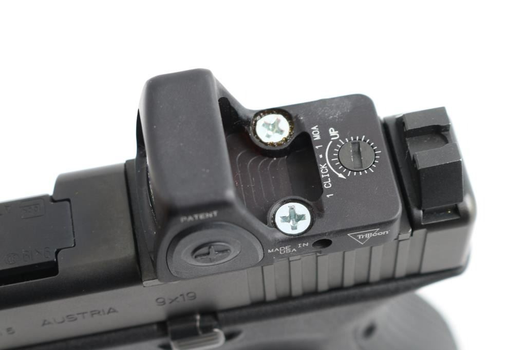 'Modular Optic System' Austrian semiautomatic pistol, imported by Glock Inc, Smyrna GA. Features approx 4" barrel, dovetail mounted two dot rear night sight, front sight removed, optics cut in top of slide with a Trijicon RM09 RMR red dot sight mounted (tests good for operation), striker fired, manual safety in trigger, replaceable backstrap inserts with different size & shape, ambi slide stop, accessory rail on dust cover. All black finish. Bore is excellent condition. Overall external condition is like new, with minor handling marks, some edge losses to slide stop. Includes original "Red Label" factory black plastic hinged carry case, manual, (1) 15 round magazine, mag loader, four different backstrap inserts. Condition is NRA Excellent *** Modern Firearm ***