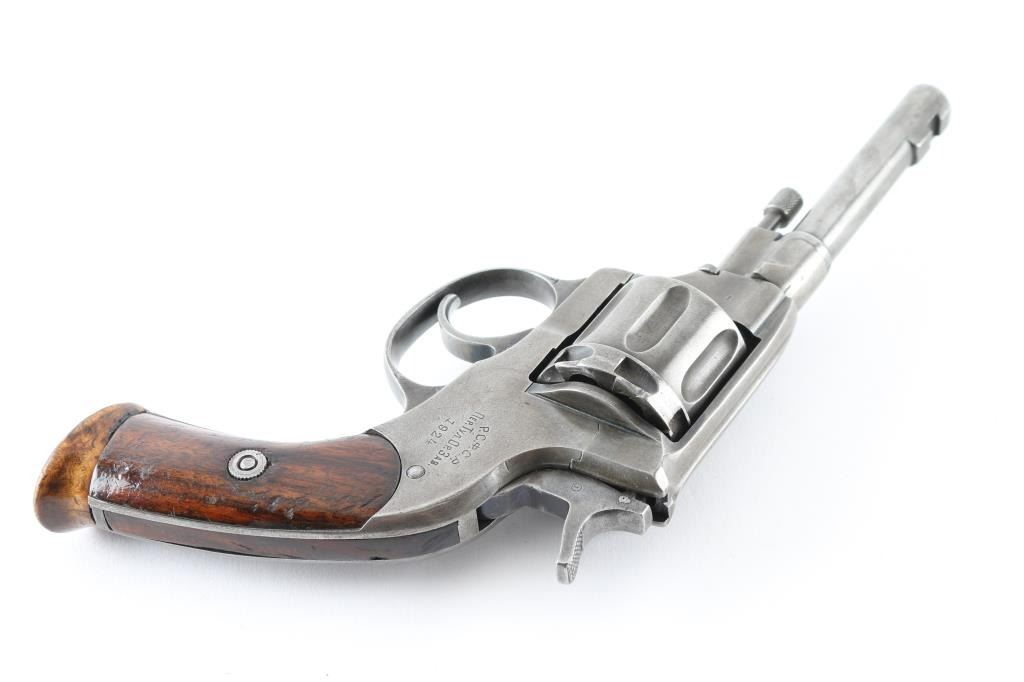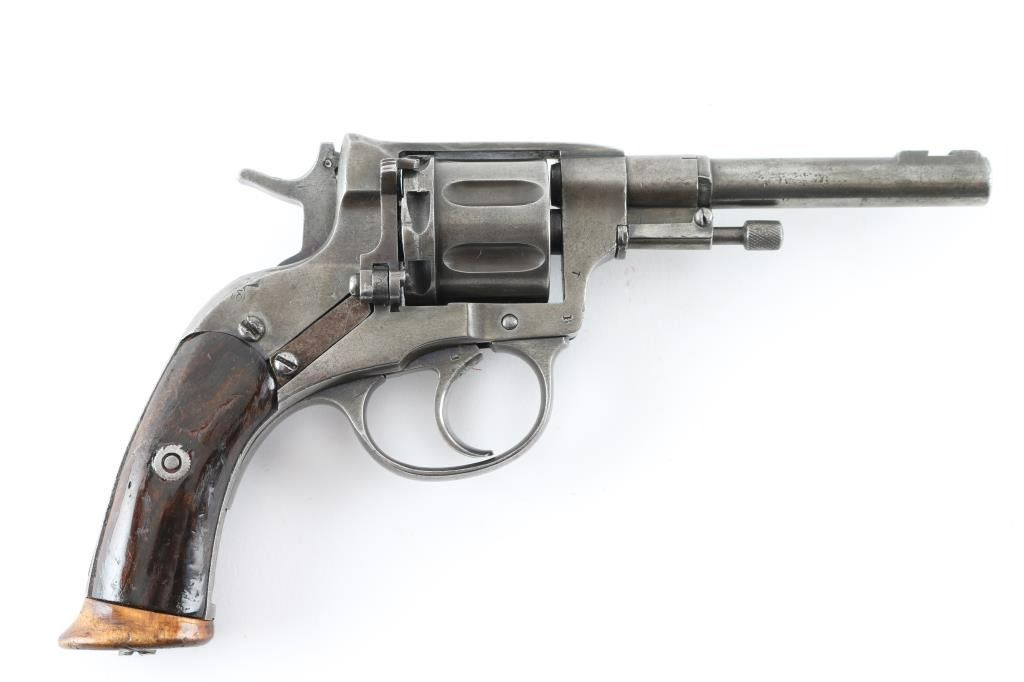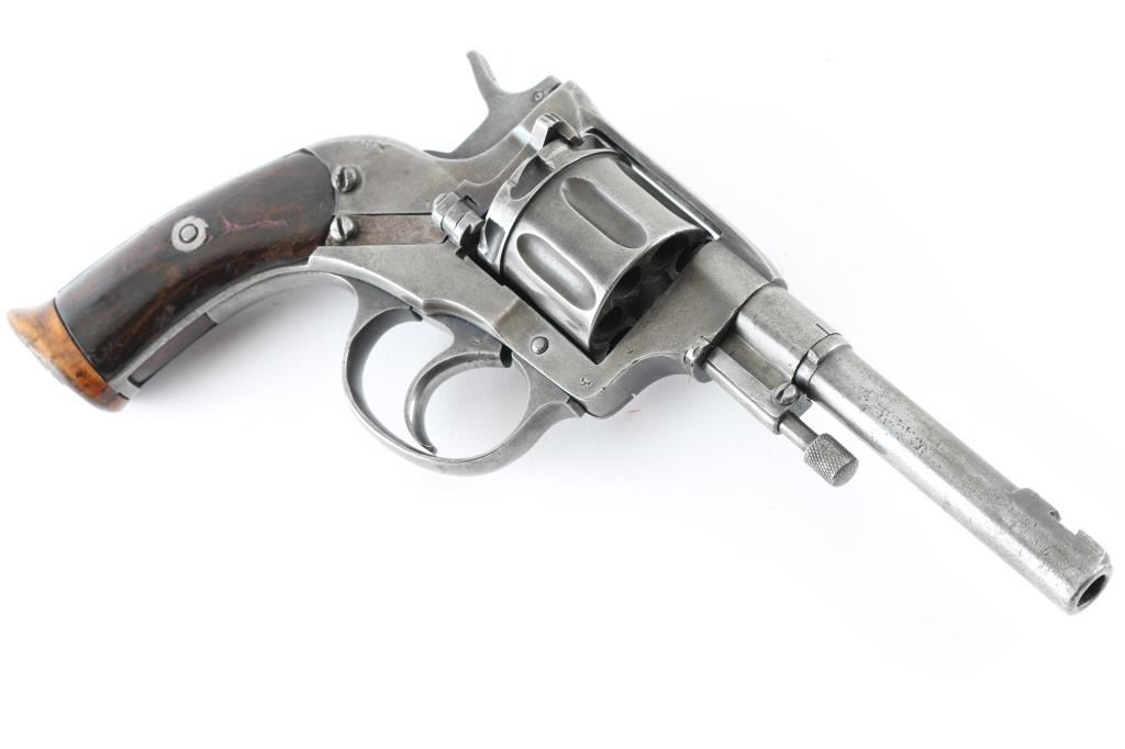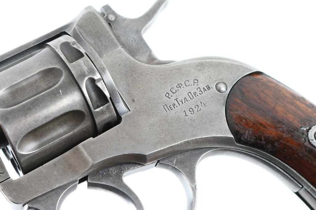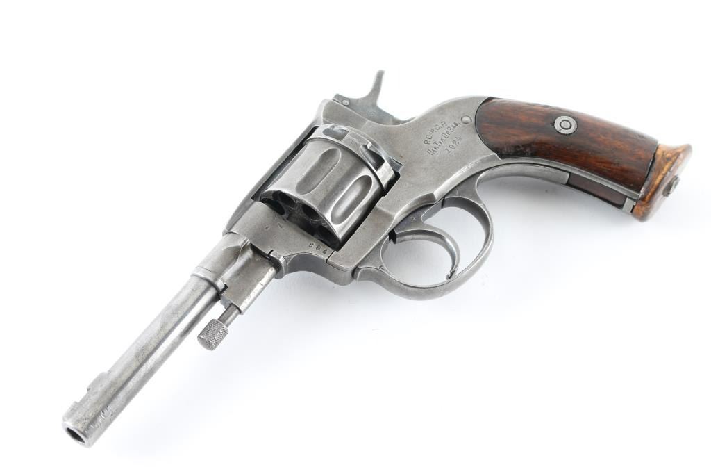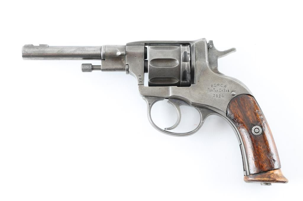 Russian military "gas seal" revolver dated 1924. Features blued finish, smooth wood grips, 4.4" barrel, fixed sights, double/single action. Bore and chambers are good condition, a bit dark, some slight roughness. Retains 75% coverage of a smooth medium gray color finish, possible cold blue, with some signs of cleaned pits or patina under the finish, showing edge losses. Grips are good+ condition, possibly custom made, with added butt piece for slightly longer grip length. Action operates properly in single action, a bit rough in double action, with good lock-up. Ejector rod not retained completely, can slip out during use. Missing front sight from dovetail. No import marks observed, marking general crisp and sharp. Condition is NRA Good (as modified) *** C&R Firearm ***