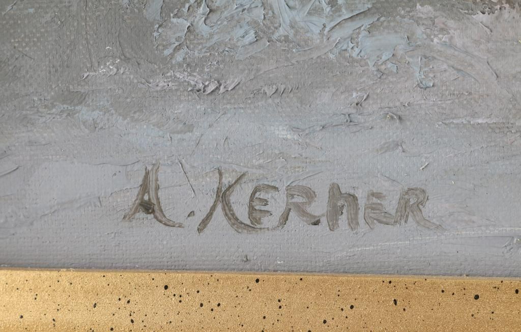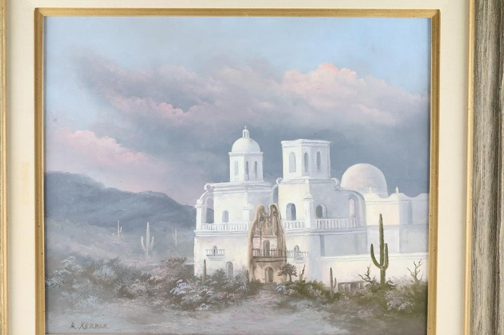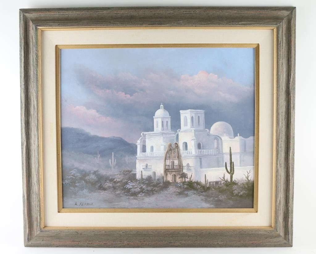 By A Kerner, signed lower right hand corner, depicting Mexican church at sunset, measuring 24x20 framed in matted in barn wood.