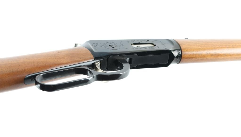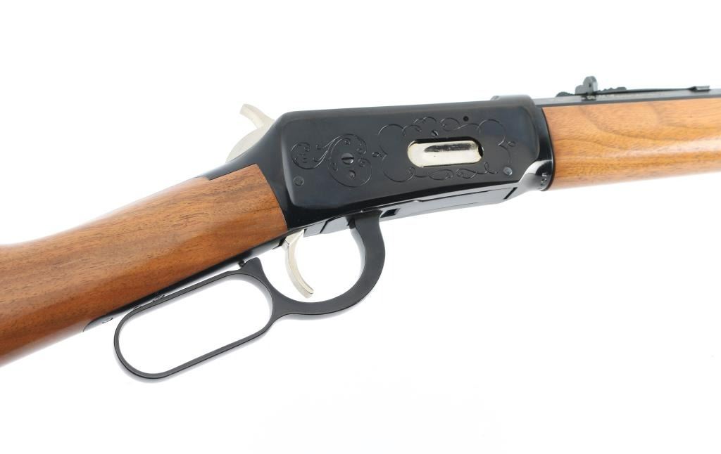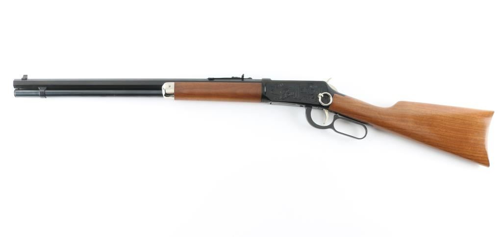SN: WC94789 Limited edition commemorative lever action repeating carbine celebrating American Old West figure W. F. Cody aka ‘Buffalo Bill’. Chambered in .30-30 Winchester and manufactured circa 1968 with only 112,923 (counting both rifle and carbine variants) reported to have been produced. Buffalo Bill served in the Union Army during the American Civil War, served as a scout for the U.S. Army during the Indian Wars, was an exceptional bison hunter and was one of the most famous showmen of the 19th century. Configuration: blued & lustrous black finish with nickel plated accents, 20" octagonal barrel, full-length magazine tube, dovetailed blade front sight with bead top, elevation adjustable rear sporting sight, simple roll stamped engraving on the receiver, saddle ring, smooth trigger with beveled edges, serrated hammer spur, grip safety, smooth walnut forend with metal cap and straight grip shoulder stock with inlayed Buffalo Bill Commemorative coin on the right side & smooth metal buttplate. Rifle retains approximately 98% original finish showing handling marks. Action is smooth, the bore is pristine and the wood stocks are fine with only minor blemishes. Condition is near NRA Excellent *** C&R Firearm ***