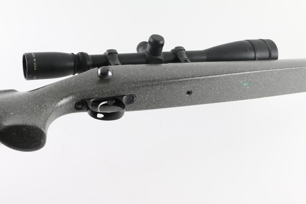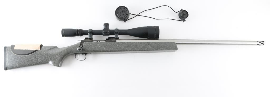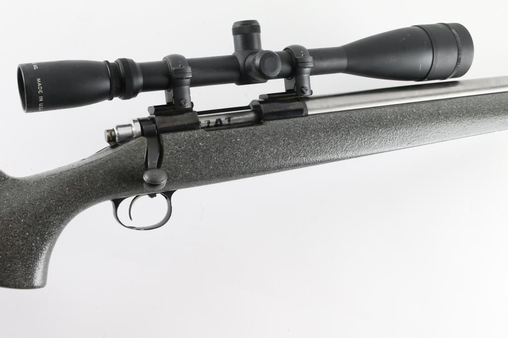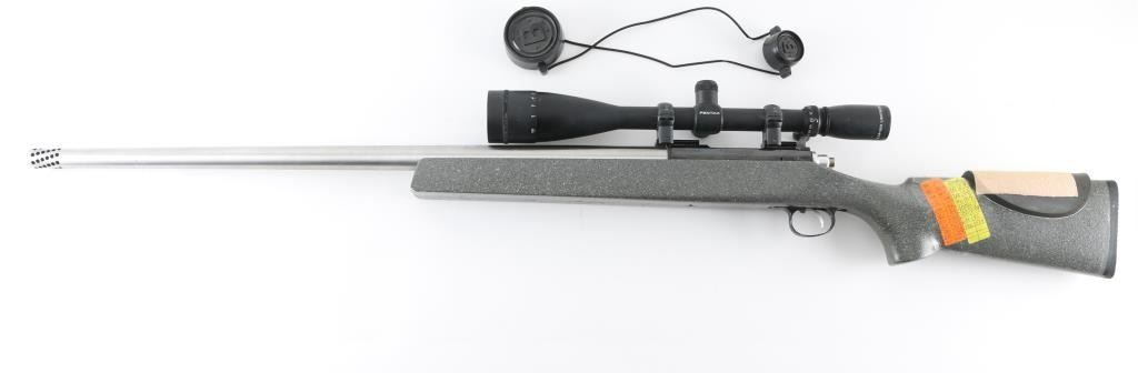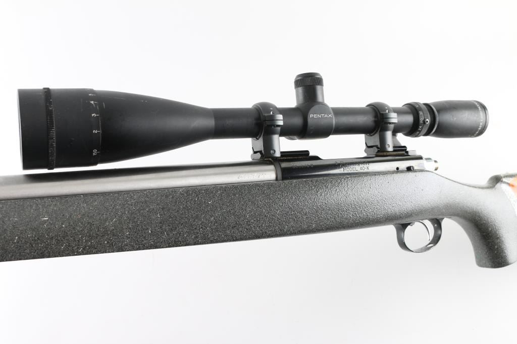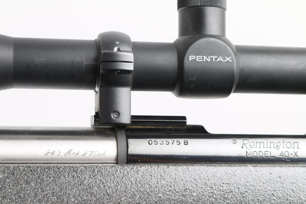 Remington model 40X custom bolt-action single-shot target rifle chambered in .243 Ackley improved cal. 28" stainless steel bull barrel with integral ported muzzle break. Barrel marked "BMR Co." on the left side. Blued receiver. Wire trigger. Gray textured synthetic stock has padding added to the comb, solid rubber recoil pad. Mounted with a Pentax 8.5x 32 scope with adjustable objective. clear optics. Action is smooth/tight. Bore appears very Good. Stock is very good, has shooting data tables taped to the left stock. Stainless is very good with minor scratches, blue has minor scratches, and there is surface rust where the scope base meets the receiver. NRA Condition-Near Very Good. Modern firearm
