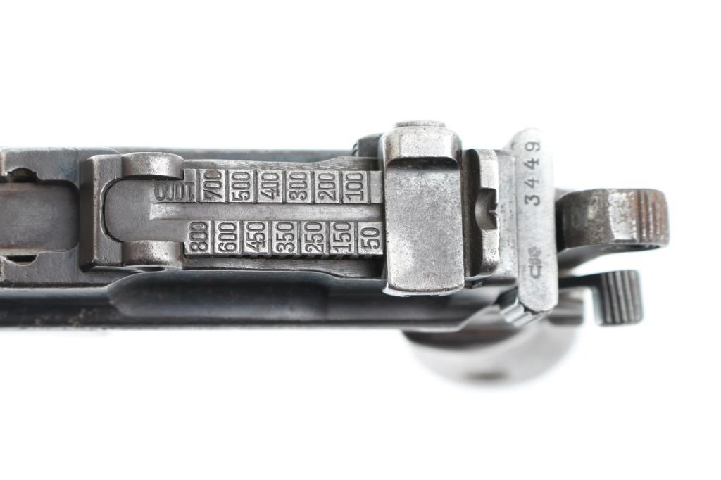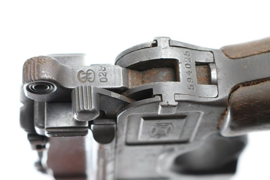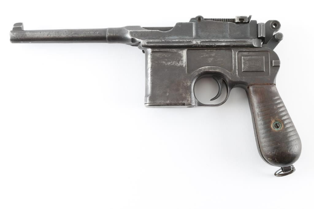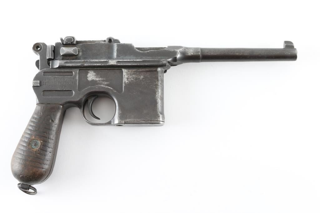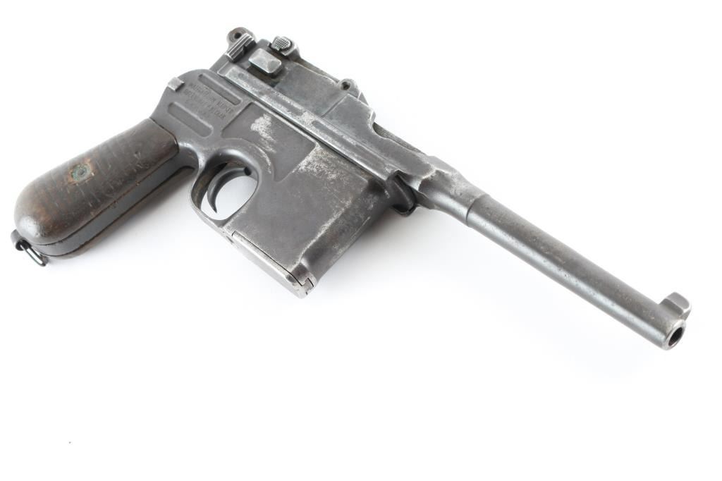 'Broomhandle' German semiautomatic pistol, that has seen use by Chinese forces, features blued finish, grooved wood grips, 5" barrel, blade front & tangent rear sights, fixed 10 round magazine, manual safety ("NS" type), lanyard ring at butt. Bore is fair condition, thin rifling visible, noted ring a few inches from muzzle. Metal surfaces are mostly a thin patina brown color, with large cleaned areas showing bare metal, edge losses throughout, patina and some light pitting throughout. Most markings are crisp, including Waffenfabrik Mauser Oberndorf a Neckar "D.R.P. u.A.P." on right side of frame. "861972" on slide is a bit thin. Mauser banner on left frame, and Mauser address on barrel. There are at least 3 Chinese characters on the left magazine well. (Faint) Parts mismatched. Grips fair condition with erosion to grooves. Condition is NRA Fair++ *** C&R Firearm ***