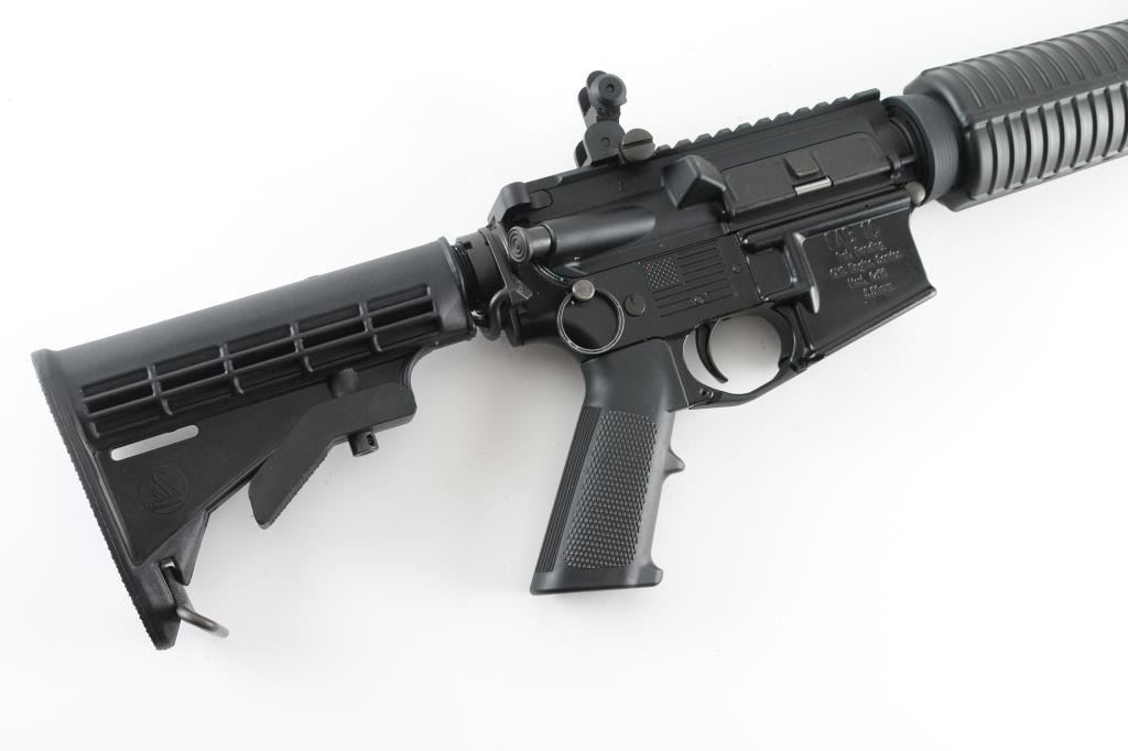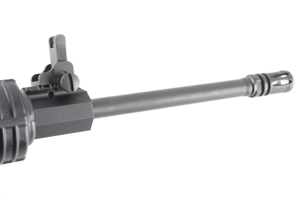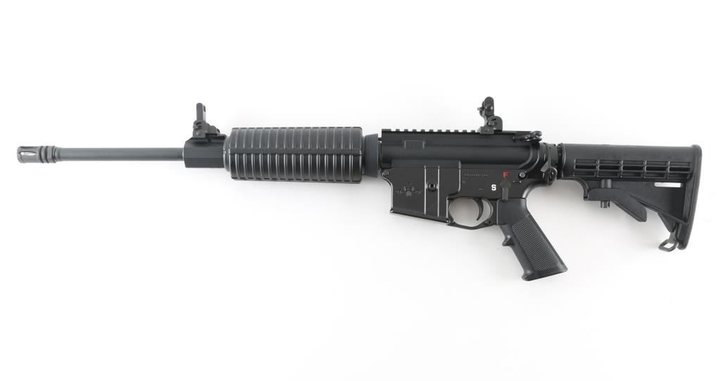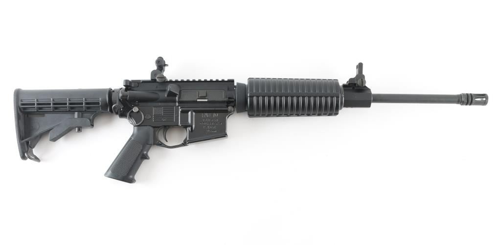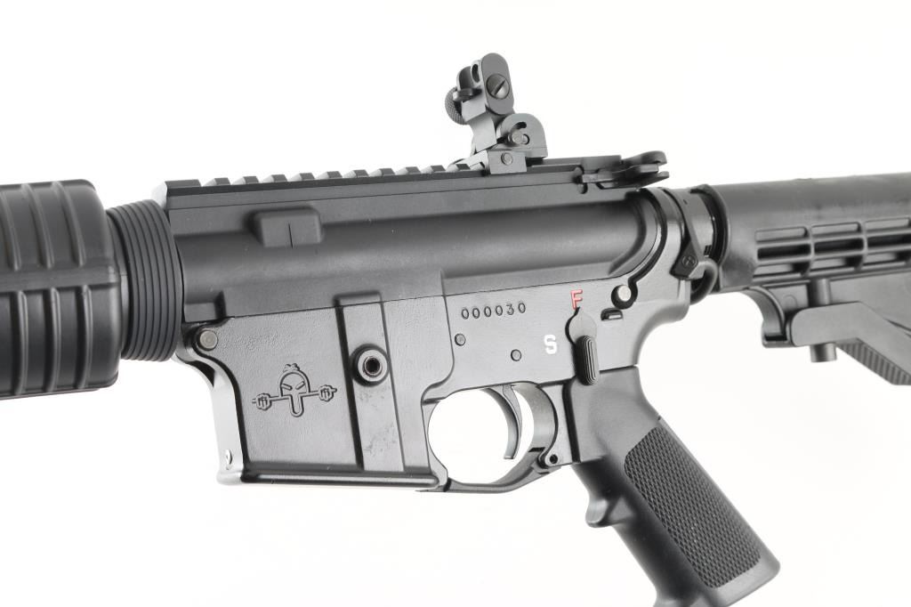 Fixed magazine semiautomatic rifle based on the AR15 rifle design. The magazine well is not cut all the way thru, and no cuts made for the magazine release parts, making the use of a standard detachable magazine impossible without extensive modification. A 10 round capacity magazine has been fixed into the mag well with a rivet, and the rifle must be "opened" to load or unload. The take down pin has an oversized head with large split ring installed to assist in opening. Features matte black anodized & parkerized finish, black polymer furniture (round carbine handguards, A2 grip, Bushmaster marked collapsing carbine stock), 16" barrel (marked "DPMS 5.56 1-9"), A2 flash hider, flat top upper receiver (attributed to Pyramid Arms) and gas block both with Picatinny rail, detachable folding YHM (Yankee Hill) sights with L flip two aperture rear peep and fiber optic insert front double post, sling bar at rear of receiver for single point sling, manual safety, ejection port cover (displays Punisher logos when open, forward assist button, 6 position carbine receiver extension. No provision for last round bolt hold open button. Large engraved American Flag on right side of lower receiver, "Kilroy" graphic on left side. Bore is very good. Overall condition is close to 98% with few handling marks. Condition is NRA Excellent *** Modern Firearm ***