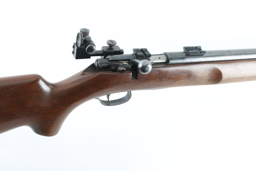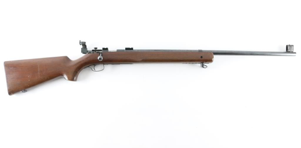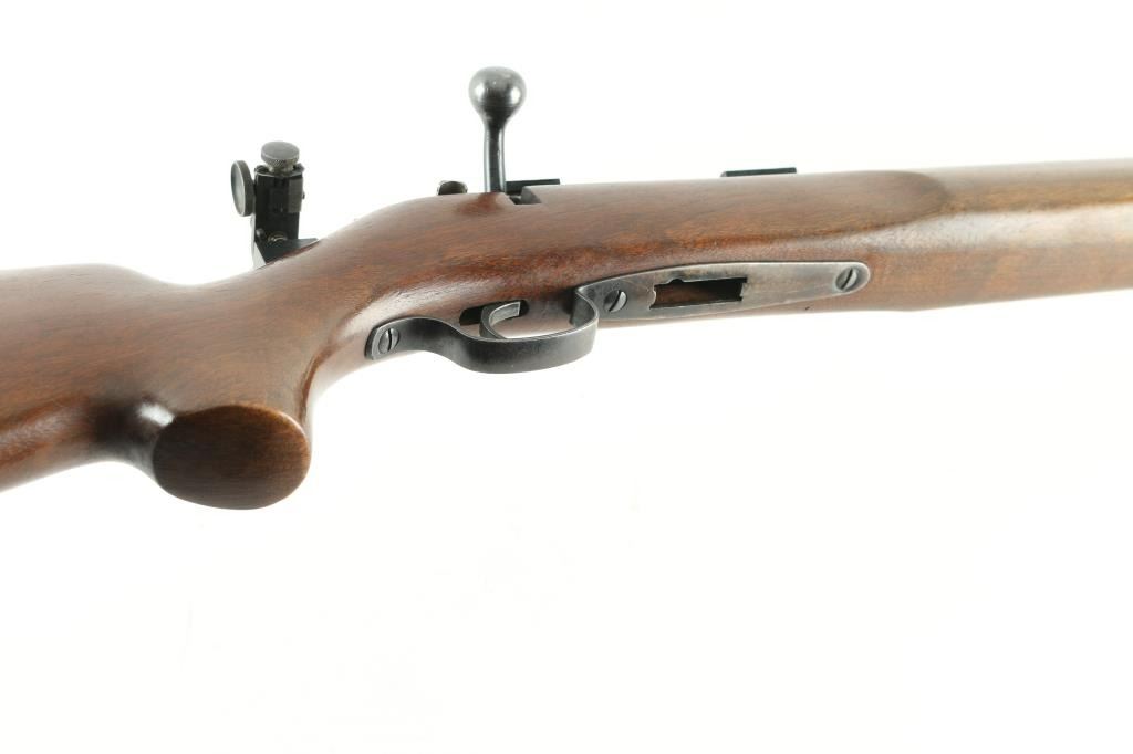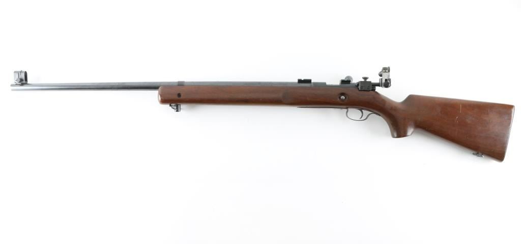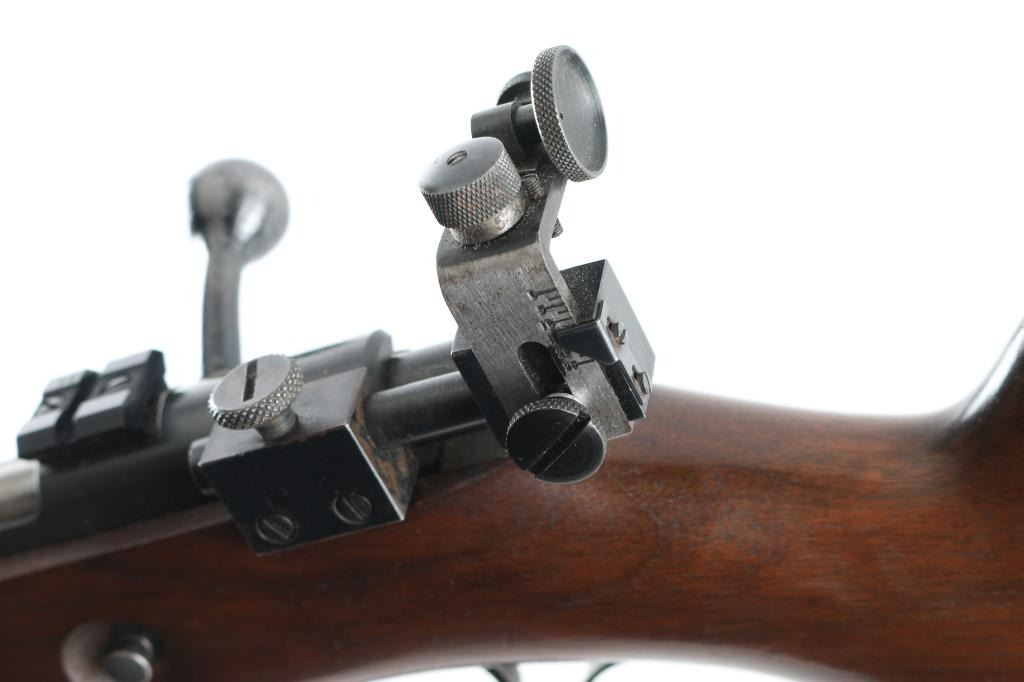 Rifle. Bolt-Action. Manufactured 1948. 28" round barrel, with raised globe front, and receiver mounted rear adjustable peep sights. Has scope base. Right mounted thumb safety. One-piece hardwood, pistol-grip stock, with checkered steel buttplate, and sling swivels. six position plate for front sling swivel adjustment. Bore appears very good, but dirty. Action is smooth/tight. Blued metal finish is about 90%, with slight scratches/rubs, handling loss to the triggerguard. Wood is very good, with minor scratches/rubs. No magazine. NRA Condition-Very Good. C&R Firearm.