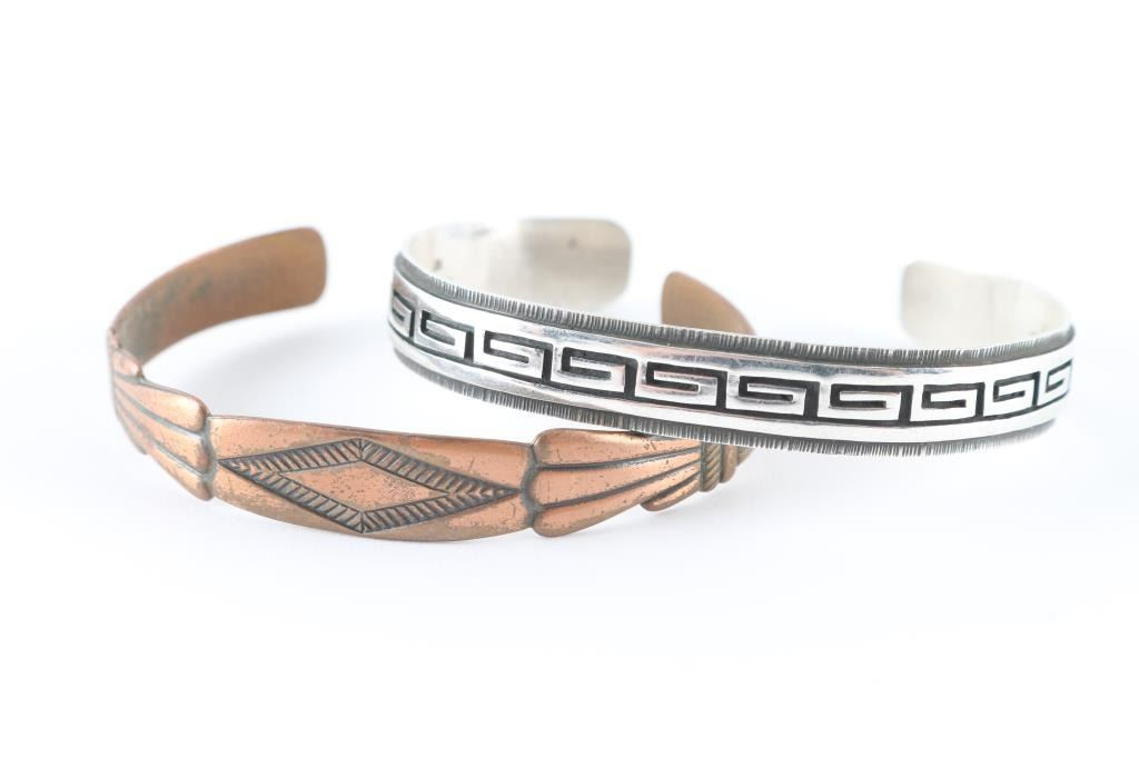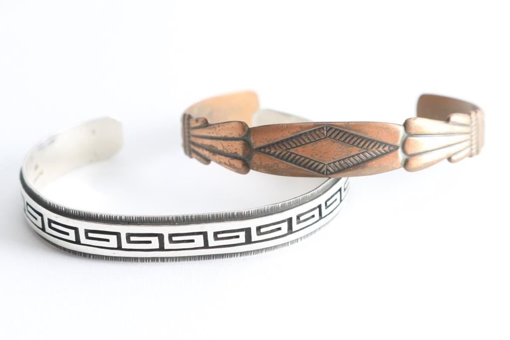 One sterling Hopi bracelet with stair step design, and one copper bracelet with geometric design.