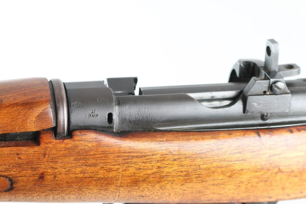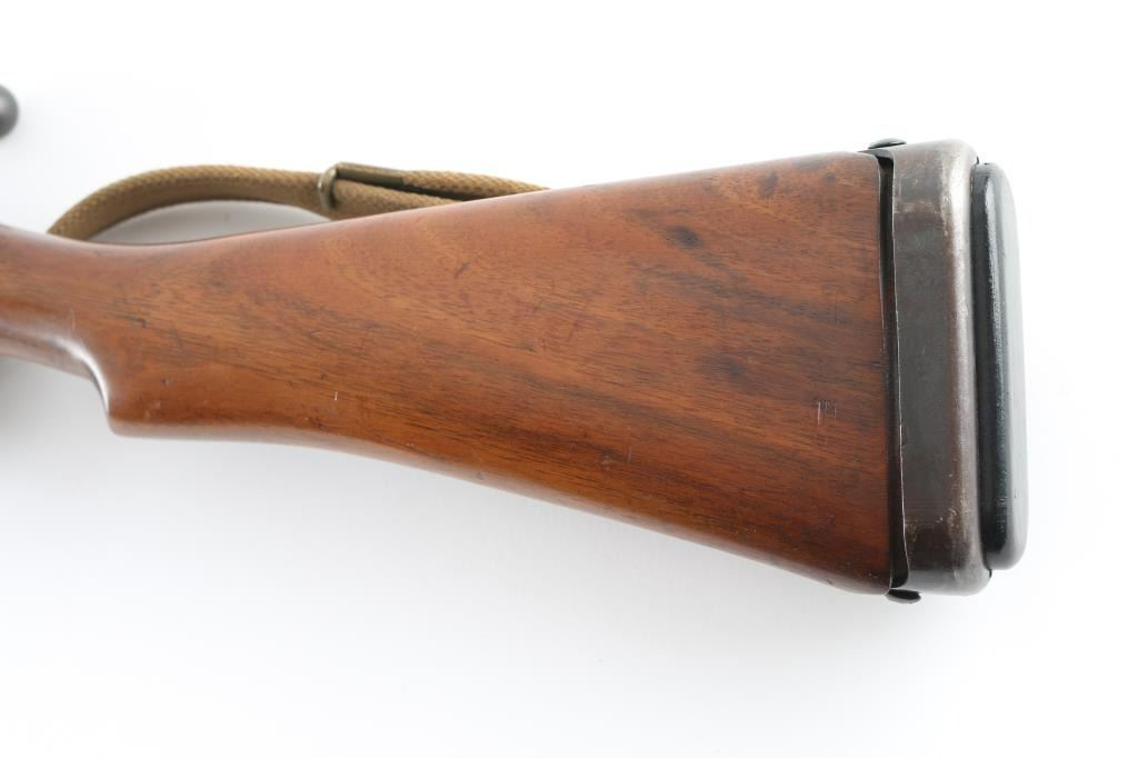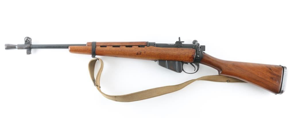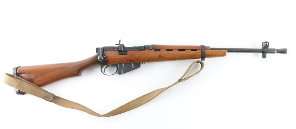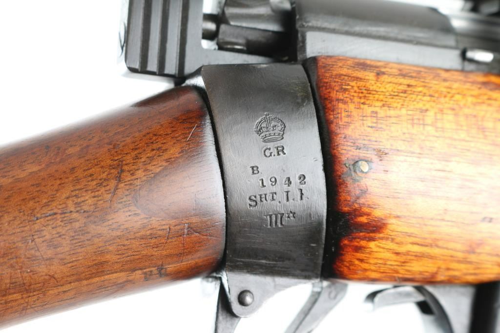 British military bolt action rifle dated 1942. Modified to resemble a No 5 "Jungle Carbine" by Golden State Arms, Pasadena CA. Features blued finish, wood 2 piece stock with straight grip and short forend, wood handguard, 18" barrel, combination front sight base & flash hider & bayonet lug unit pinned to barrel, protected blade front sight, 2 position L flip rear sight added to charger bridge, sling swivels, padded rubber pad in steel buttplate, manual safety, detachable 10 round magazine. Rear sight does not incorporate detent positions, is free to rotate. Stock is sanded & oil (tung oil?) finished, several plugs installed, ventilation cuts in forend wood. Bore is fair to good condition, a bit dark & frosted, with strong rifling visible throughout. Retains 70& finish, with edge losses and scuffs, thinning and browning on flash hider unit. Wood is good condition overall. Buttplate is loose and poorly fitted. Includes khaki web British Commonwealth type sling. Condition is NRA Good (as modified) *** C&R Firearm ***