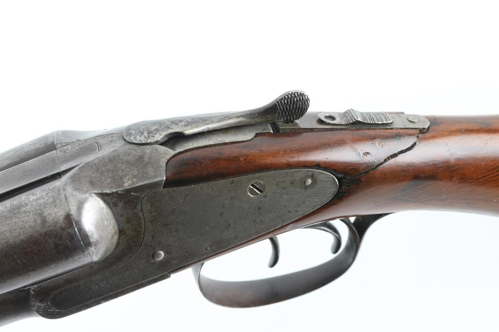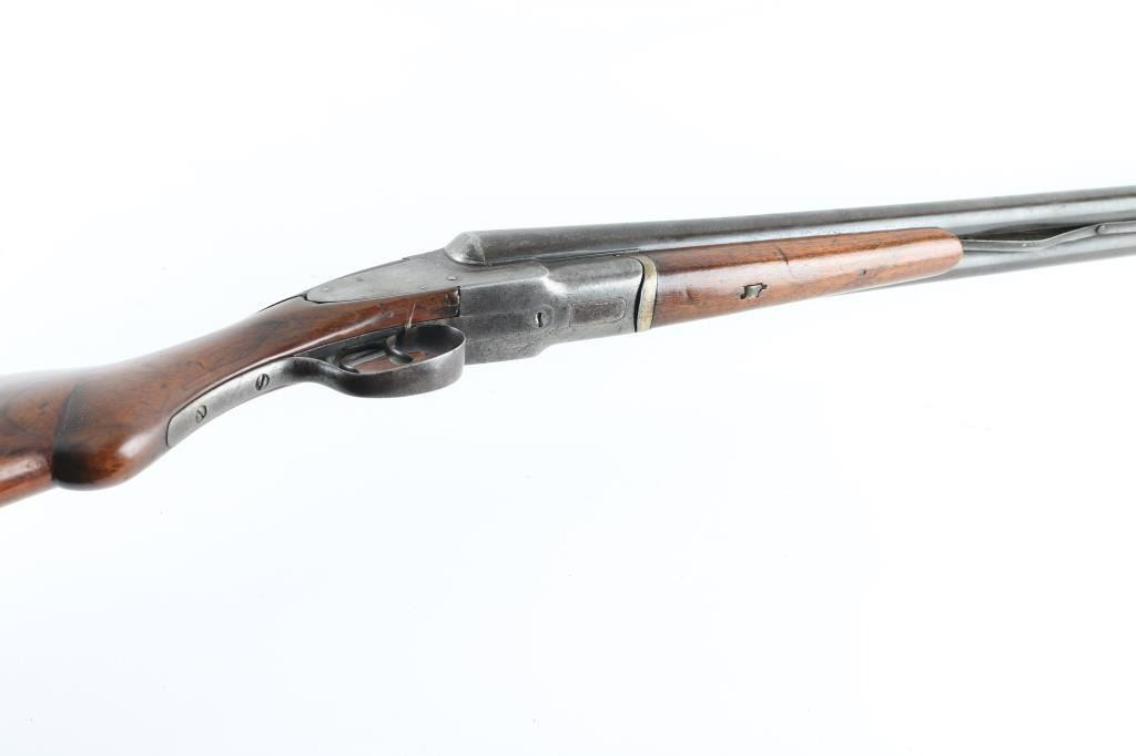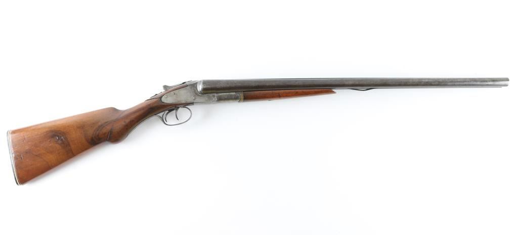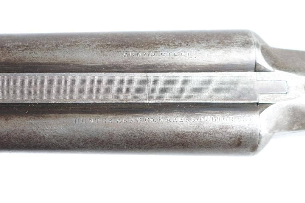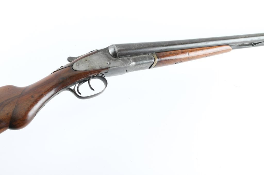 Vintage side by side double barrel side lock internal hammer shotgun manufactured circa 1898-1913. Features 26" barrels marked "ARMOR STEEL", choked IC/IC, small brass bead front sight, extractors, sliding tang safety, double triggers, smooth wood forend & semi-pistol gripped shoulder stock, plastic buttplate. Bores are good or better condition, need cleaning. Metal surfaces are a mix of dull gray or silver, with much patina brown, patina in many places. Wood is good at forend, poor at stock with upper tangs broken off and repaired. Some remaining cross hatching at wrist appears to be shallow checkering, now mostly eroded by sanding and slight reshaping. Buttplate is a expedient replacement from flat plastic material, shaped to fit. Barrels show several small dents, bottom rib lifted free and bent, showing between the barrels, some sort of fastener added. Forend hanger has odd fit. Upper tang shows a small gap mid-tang, has been cut into two pieces. Several screw heads have damaged slots. Condition is NRA Poor *** C&R Firearms ***