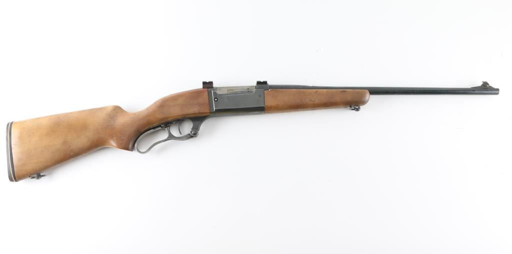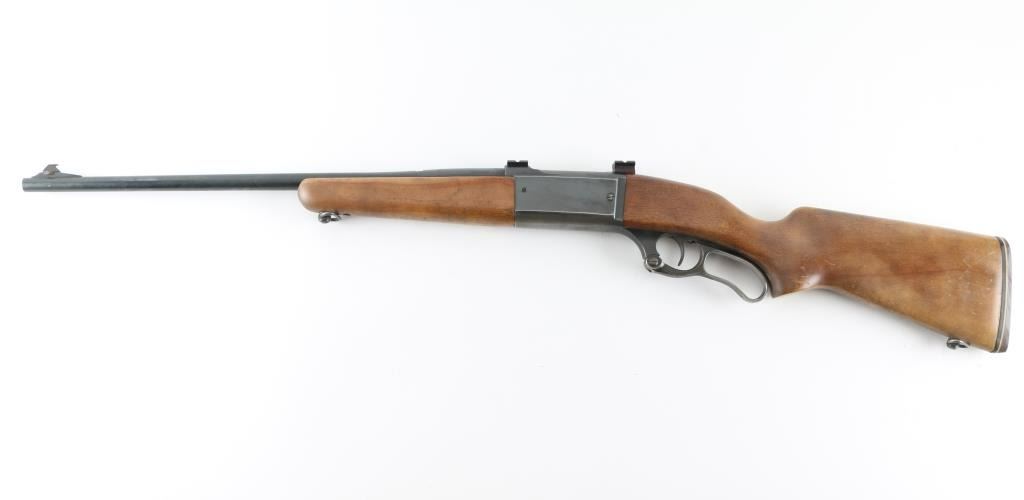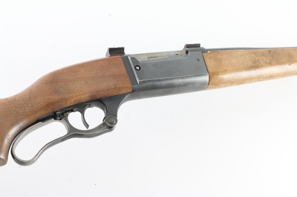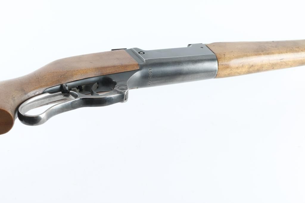 Lever action rifle manufactured circa 1962. Features blued finish, case color finger lever, smooth wood forend & curved grip shoulder stock, thin rubber buttpad, 20" barrel, blade front sight, no rear sight (empty dovetail mid-barrel), sling swivels, fixed rotary magazine, safety/lever lock behind trigger, cocking indicator, two piece Weaver scope base affixed to top of receiver. Bore is very good condition. Retains 70% finish with edge losses, thinning and graying on bottom of receiver, patina on barrel. Finger lever retains some faded case color, mostly a dull silver color. Wood is very good condition with dents & scratches. Condition is NRA Good++ *** C&R Firearm ***