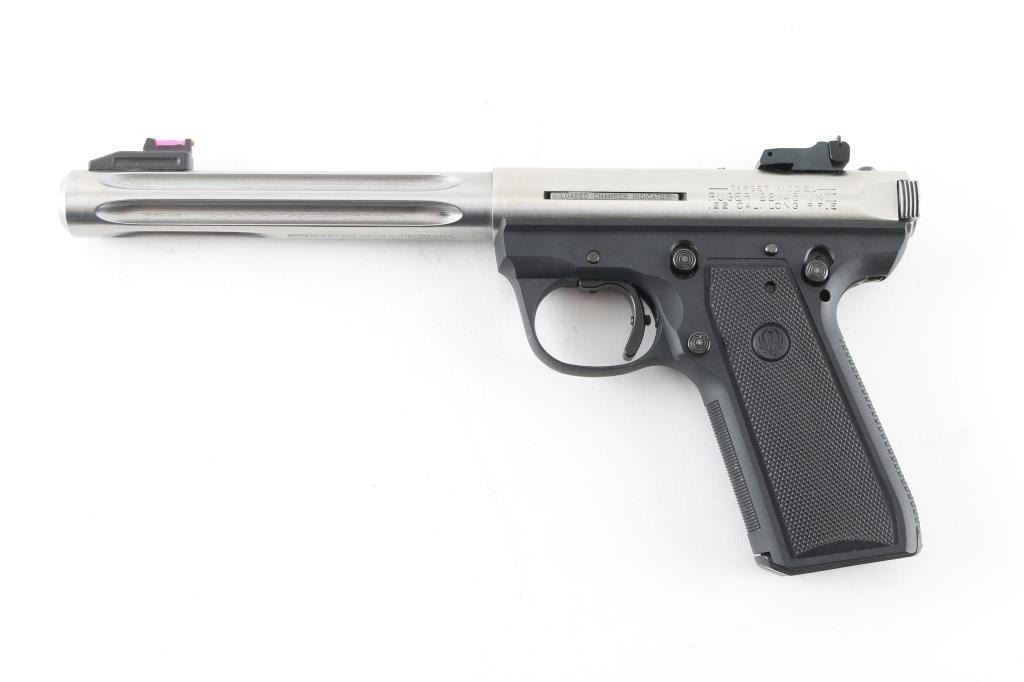 "Target Model" Stainless steel blowback-operated single action semi-automatic rimfire pistol chambered in .22 Long Rifle. Features a stainless steel finish, with black polymer frame. 7" fluted bull barrel, red fiber optic front sight, fully-adjustable rear sight, smooth, adjustable trigger, loaded chamber indicator, concealed hammer, manual safety on the left side of the frame, bolt catch lever on the left side of the frame, serrated charging knobs on the rear of the bolt, push button magazine release, factory 10 round magazine. Pistol exhibits only minor handling marks with no major wear observed. Action is smooth, the bore is pristine, and the polymer is fine. Condition is NRA Excellent Modern Firearm