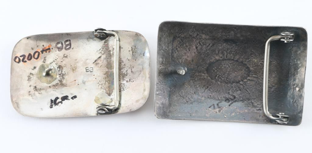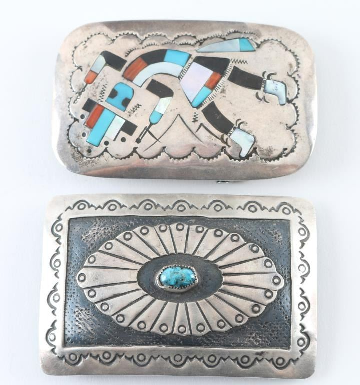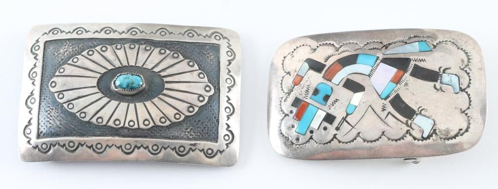 (1.) Navajo Sterling sliver belt buckle with turquoise stone measuring 3x2. (2.) Hopi belt buckle with inlaid Kachina design same measurement , both in good condition.