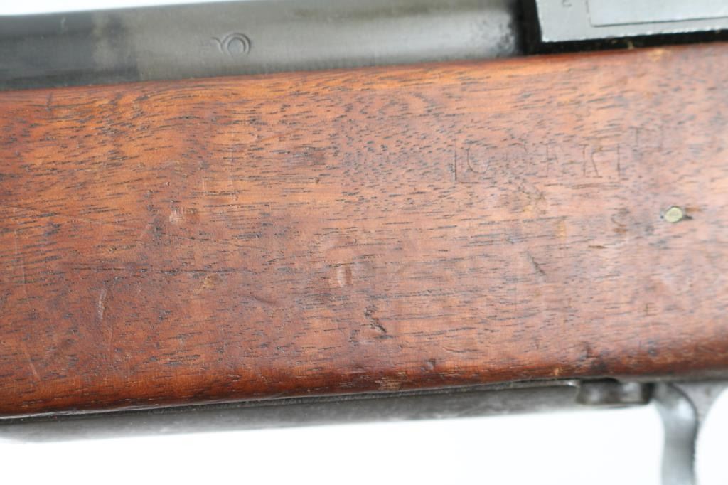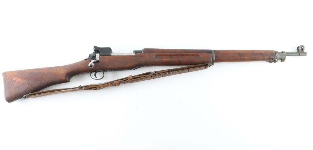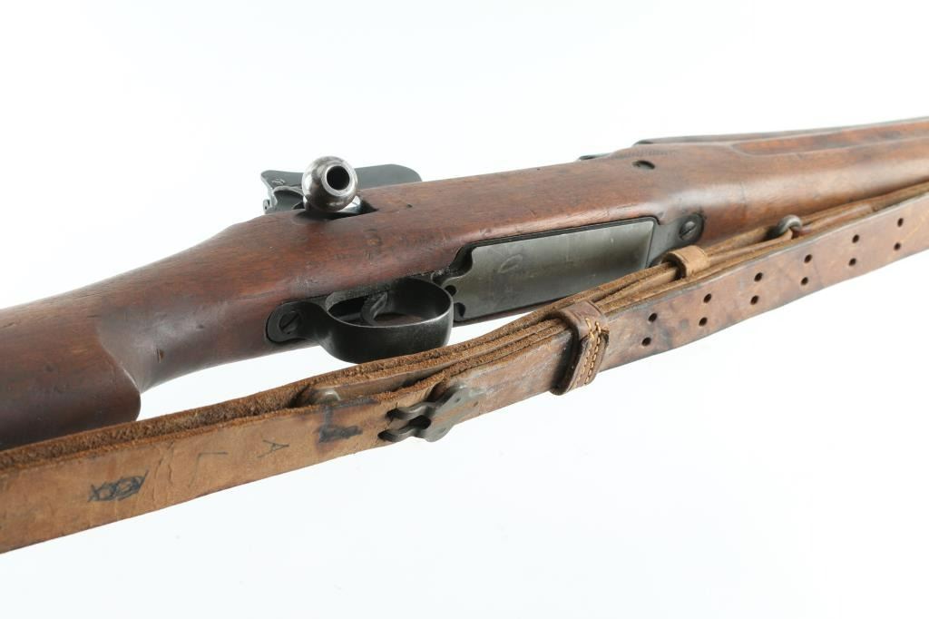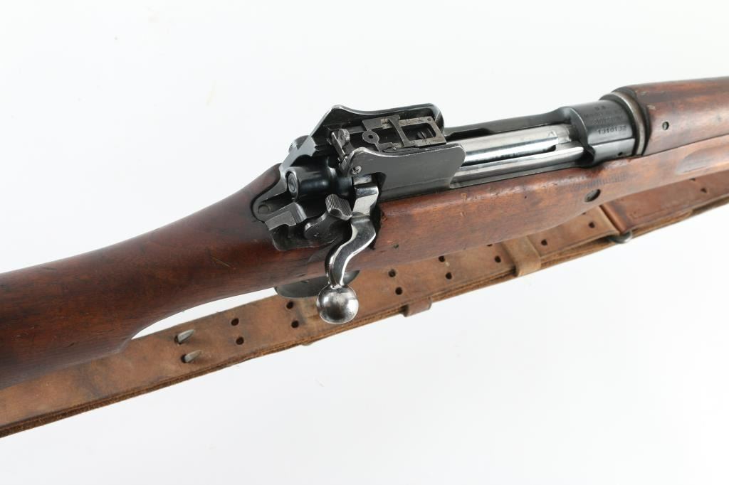 American military bolt action rifle manufactured for use in WWI. Features dog-leg bolt handle, protected blade front sight, folding ladder rear sight with peep apertures, approx 26 inch barrel, manual safety, sling swivels, storage compartment in butt, blued/parkerized finish on metal parts, Chrome bolt, wood stock and handguard. Finish on metal parts is good with edge wear, handling loss on the receiver, buttplate is the white, There is surface rust on the sling swivels, and stacking swivel. Wood is good with the usual scratches/dings. Bore appears good, but dirty. Barrel is marked "E" over flaming bomb, over "1-18". Flaming bomb stamp on left side of receiver. Faint cartouche on right stock.. Includes leather sling. NRA condition-Good to very good. C&R firearm.