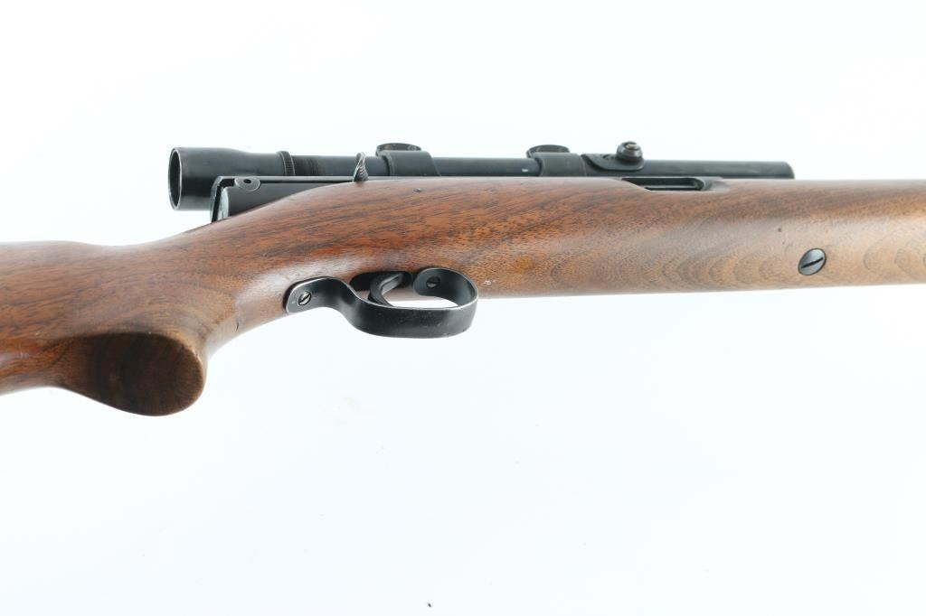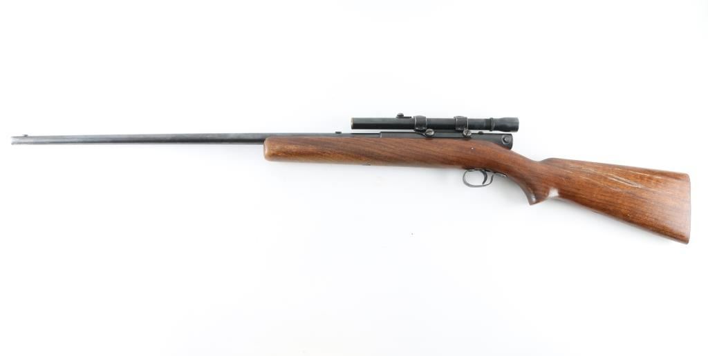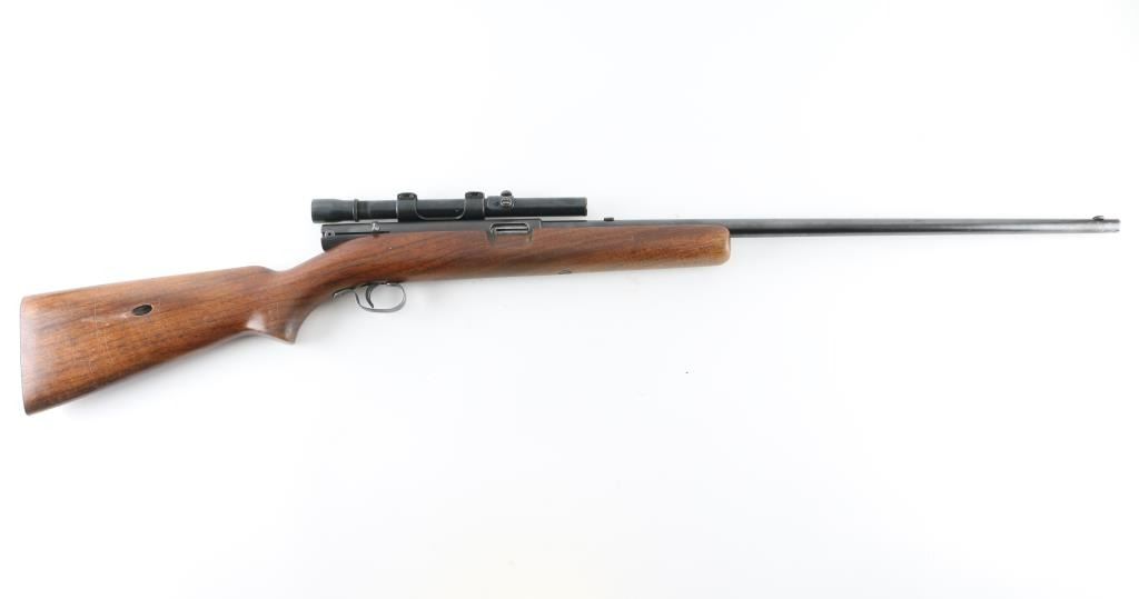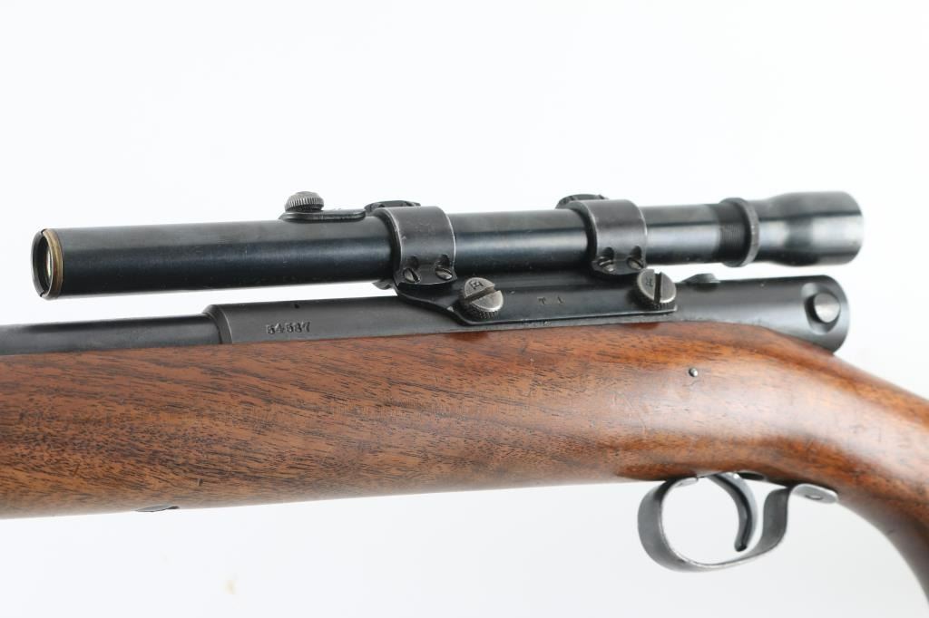Pre-war semiautomatic rimfire rifle manufactured circa 1940. Features blued finish, wood stock, magazine tube in butt, 24" barrel, manual safety on top of receiver. Bore is very good condition. Bore is very good /bright. Retains 85% blue, with bare metal on sharp edges, some minor scratches on receiver and barrel. No sights, mounted with a period vintage Weaver J 2.5 crosshair scope, clear optics Stock is good condition with minor scratches and handling loss. There is some finish loss to the left butt from cleaning fluid running down it. Easily fixed. Condition is NRA Good + C&R Firearm