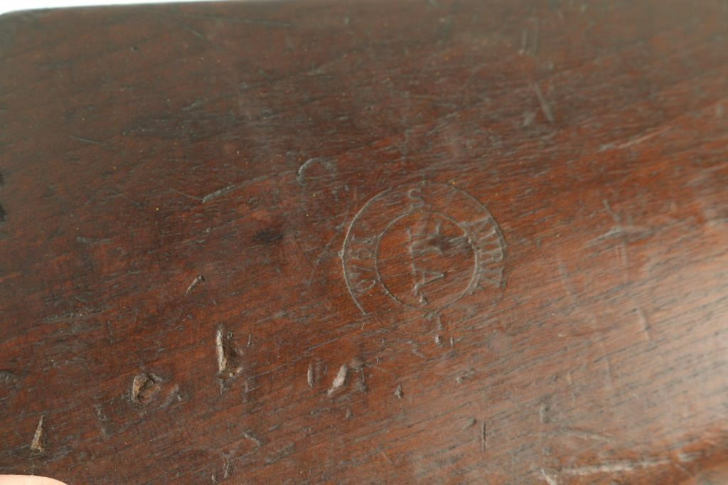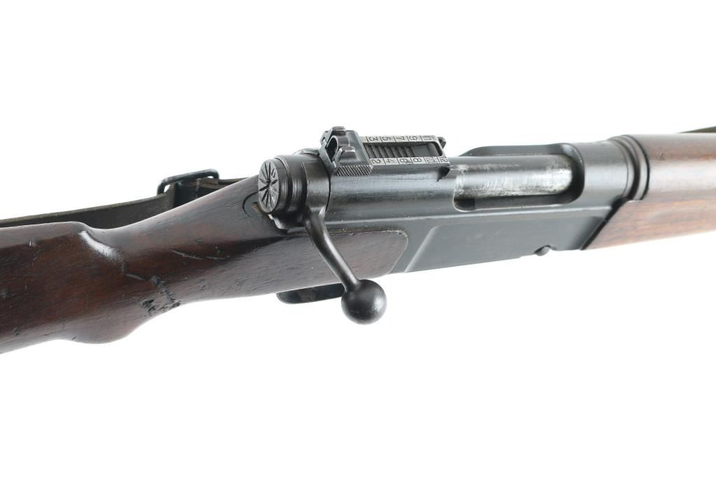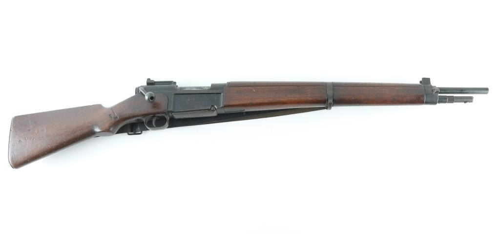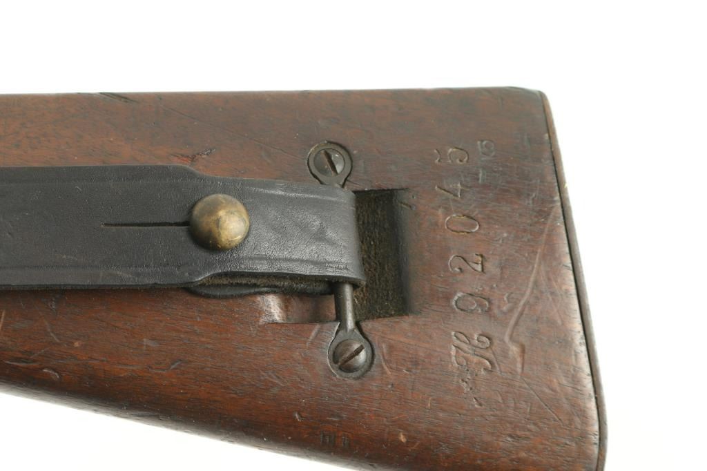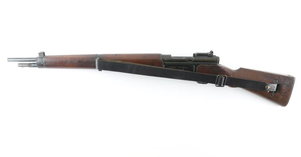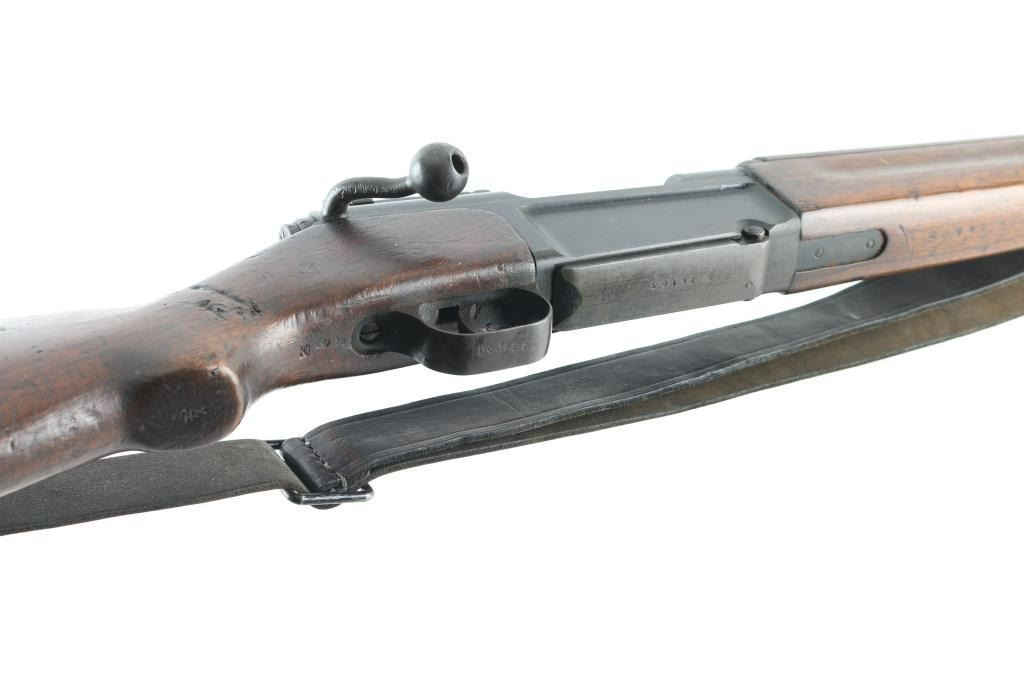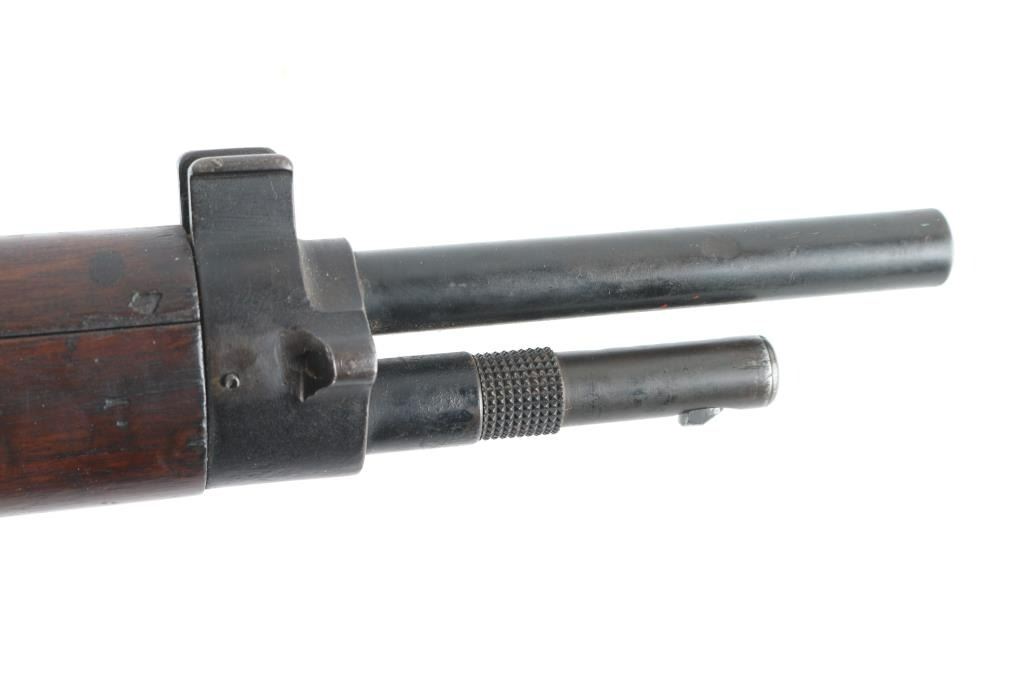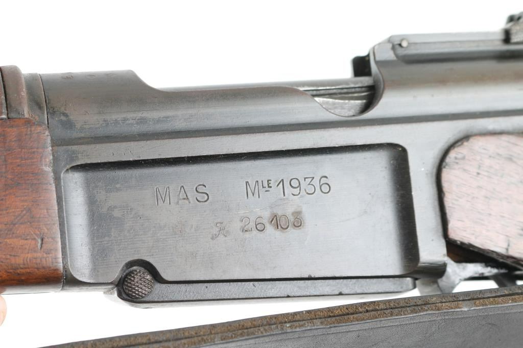 Scarce pre-war French military carbine style rifle. Has all the pre-war features. Manufacture d'Armes de Saint-Etienne (MAS) 22.63 barrel, dog leg bolt. Lebel-type cruciform bayonet inserted into a guard tube under the barrel. Left side of slab receiver marked "MAS Mle 1936". Matching serial numbers on receiver, triggerguard, floorplate, bayonet, and upper stock. Mismatched SN on lower stock. "MA 1940" cartouche on right buttstock. Bore is good with strong rifling. Action is smooth/tight. Metal finish is about 60% with edge wear and handling loss. Buttplate has rust/pitting. Sling attached. WW2 bring-back as there are no import stamps. A rare rifle. NRA Condition-Near Very Good. C&R Firearm.