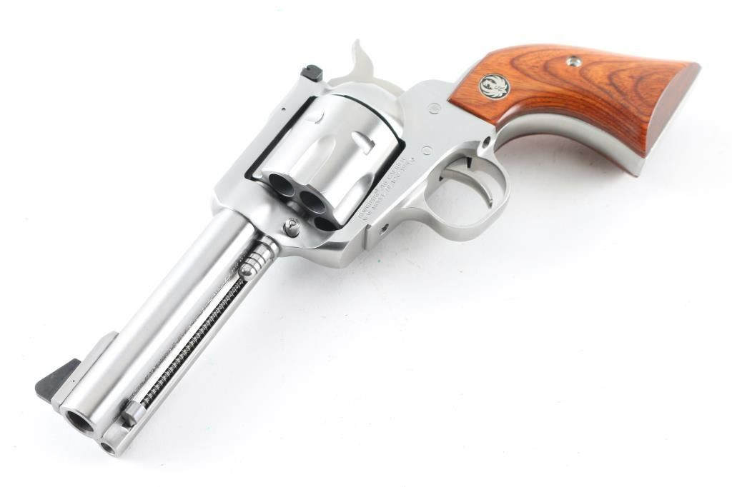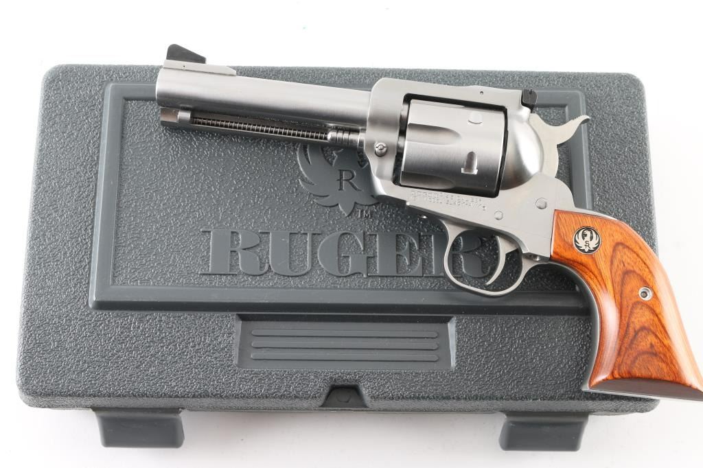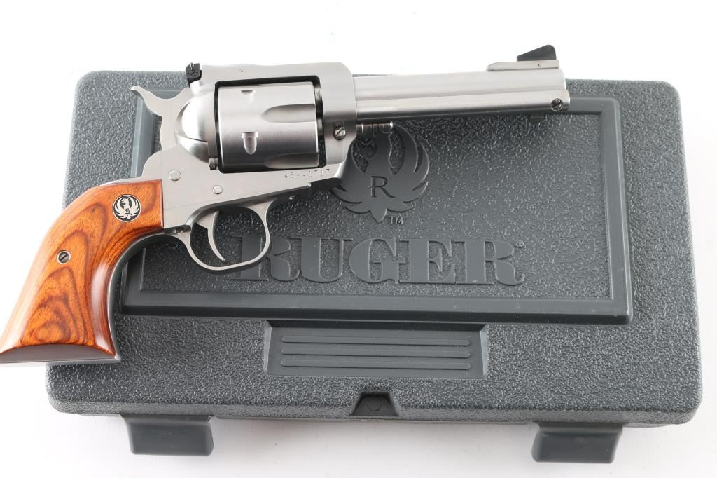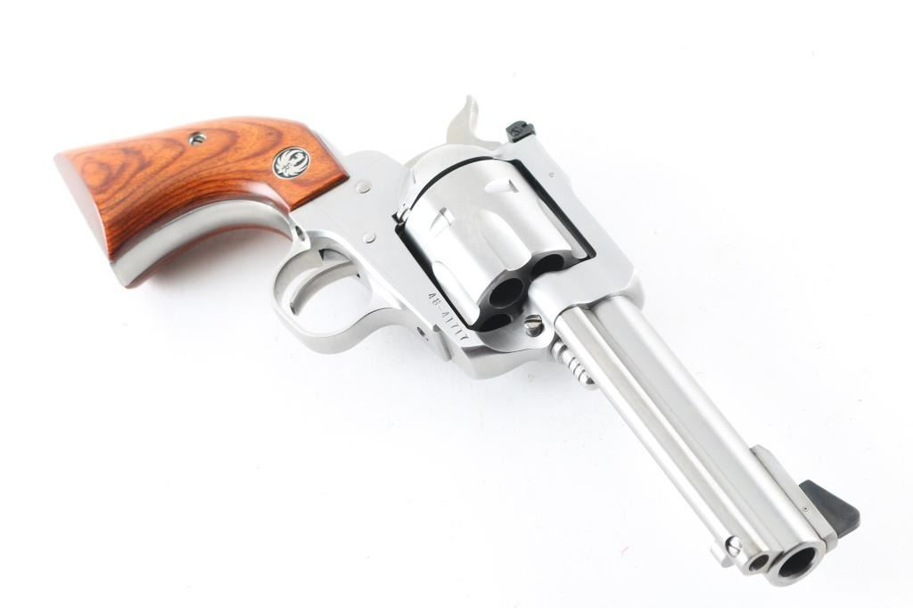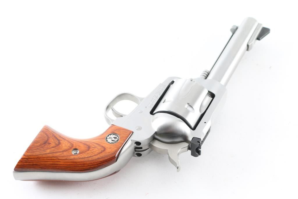 SN:48-41717 American made Single Action, 6 shot, revolver chambered for .45 Colt ammunition, circa 2009. It features a 4.75" stainless steel barrel and frame with a satin finish, a raised black blade front sight, black adjustable rear sight, smooth trigger, serrated hammer spur and two piece wood grips with Ruger medallions. Metal finish looks great with almost no signs of use or handling. There is a diagonal squiggly line on one of the cylinders about an 1/8" long. It is not a scratch but in the metal. Grips look great. Bore looks great, bright. Comes with original grey plastic Ruger case and owners manual. Condition is NRA Excellent *Modern Firearm*