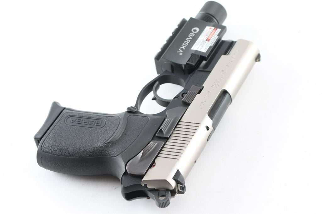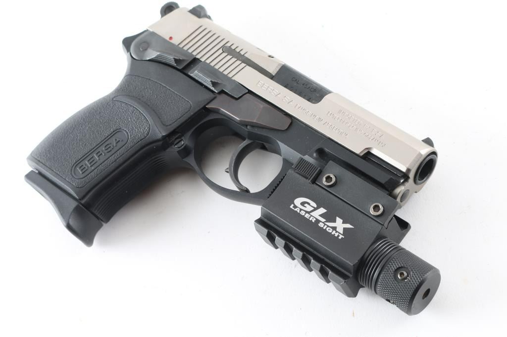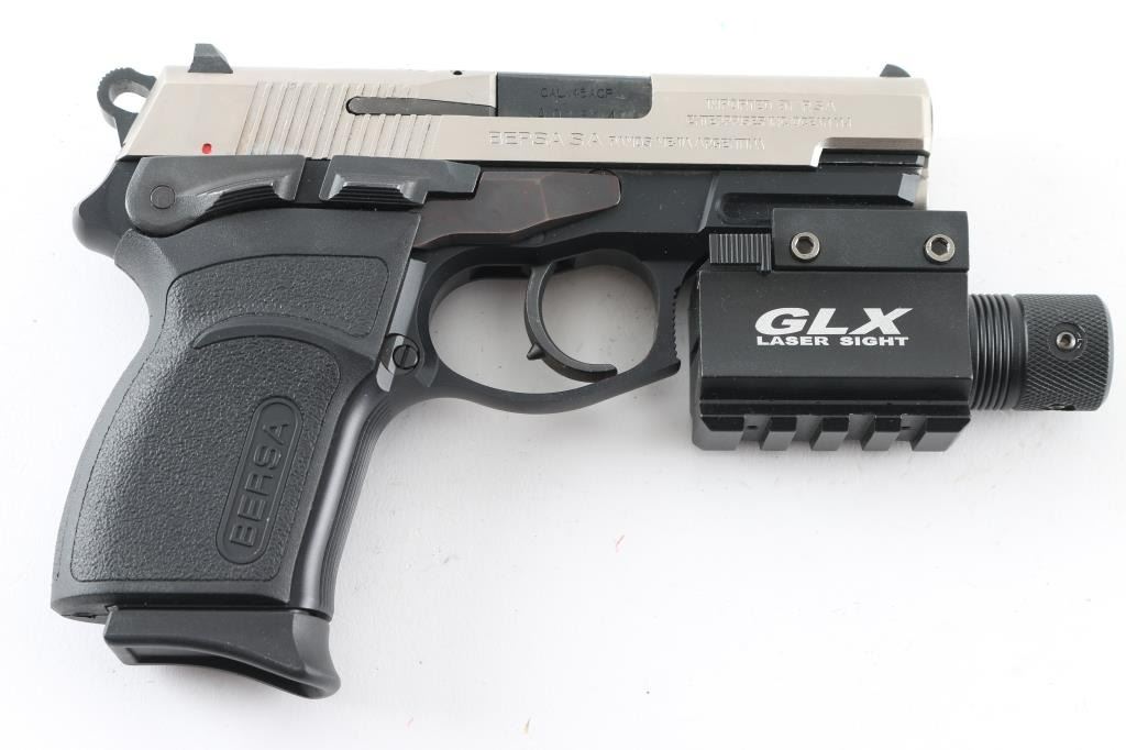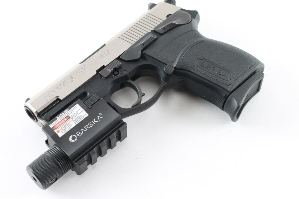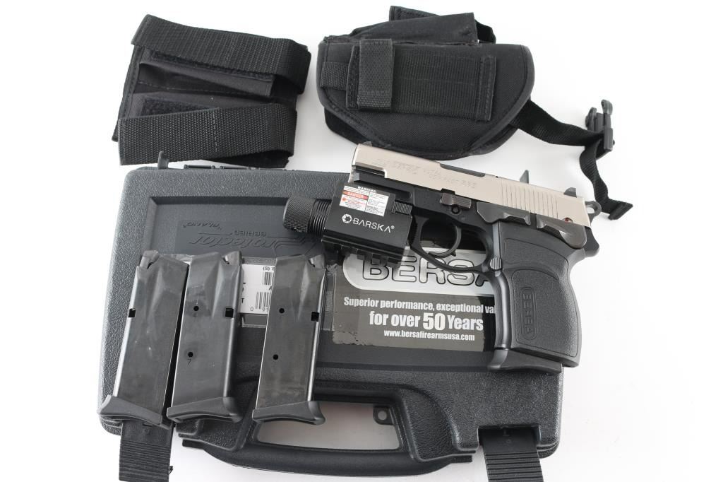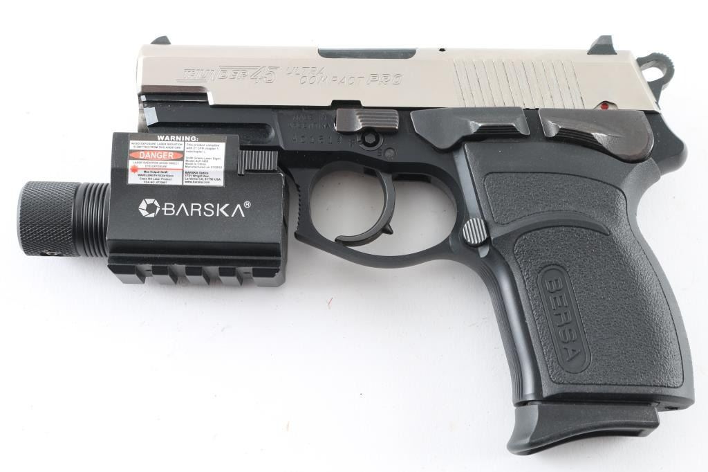 SN: A01614 Made in Argentina the Thunder 45 Ultra Compact Pro is a hammer fired, DA/SA , Duo-Tone, semi-auto pistol chambered for .45 ACP ammunition. It features a 3.5" barrel, a nickel finish steel slide with a fixed white dot front sight, a dovetailed notch rear sight with white outline and an ambidextrous slide stop and thumb safety/decocker. The black alloy frame has an integral accessory rail, Bersa textured polymer grips, serrated front strap and an internal locking system. The trigger is smooth and the round hammer spur is serrated. The metal finish looks great. Grips look great. Bore looks good but dull, needs cleaned. Comes with a Barska green laser (it works) that has an accessory rail on the bottom. It also comes with a black plastic after market case, owners manual, keys for internal lock, nylon holster with mag holder, extra mag pouch and 4 factory magazines. Condition is NRA Excellent *Modern Firearm*