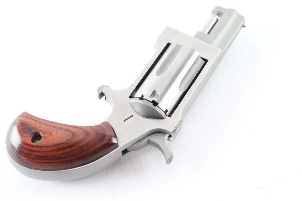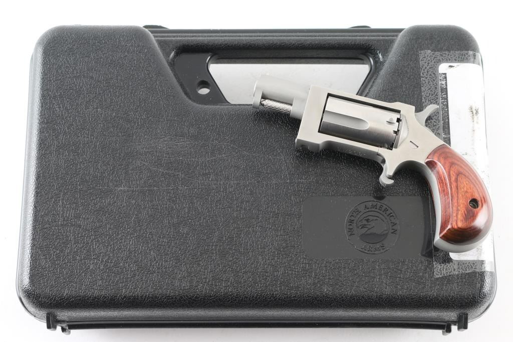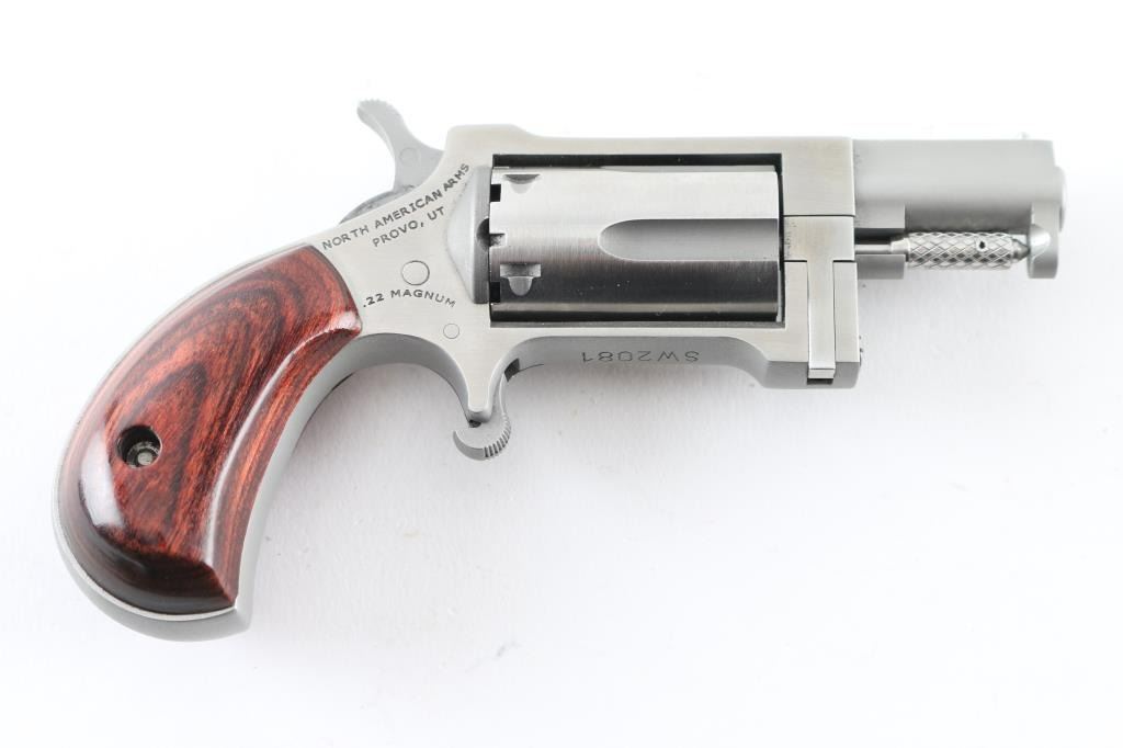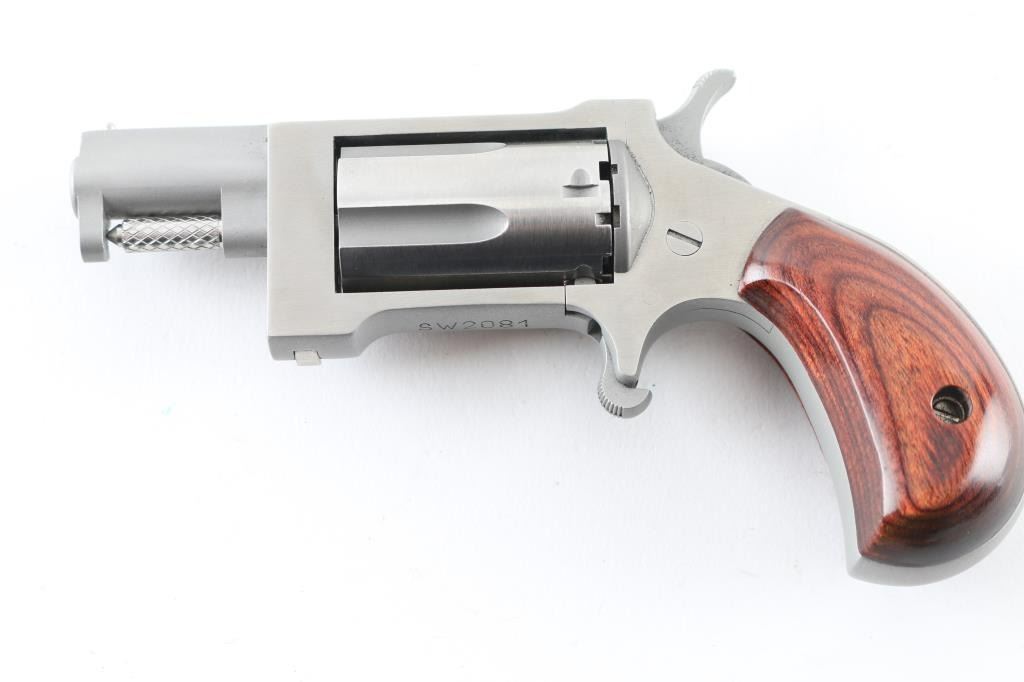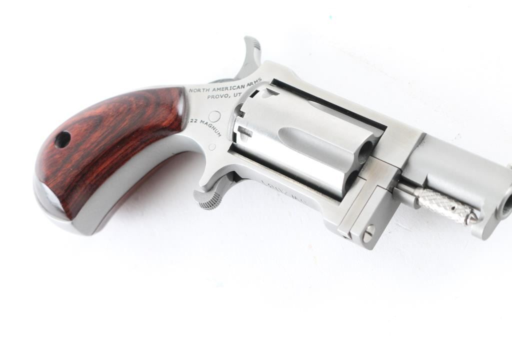 SN:SW2081 American made stainless steel single action miniature revolver chambered in .22 Magnum. Features a matte finish with polished cylinder and flats, 1 3/8" barrel, polished bead front sight, fluted five-shot swing out cylinder, serrated spur trigger, serrated hammer spur, and two-piece smooth laminated rosewood grips. Metal finish looks great. Grips look great. Bore looks good but needs cleaned. Comes with original black plastic factory case, owners manual and NAA logo pad lock. Condition is NRA Excellent *Modern Firearm*