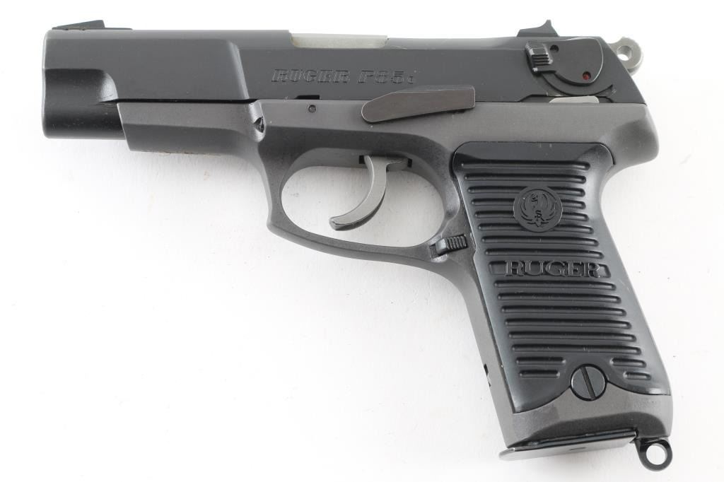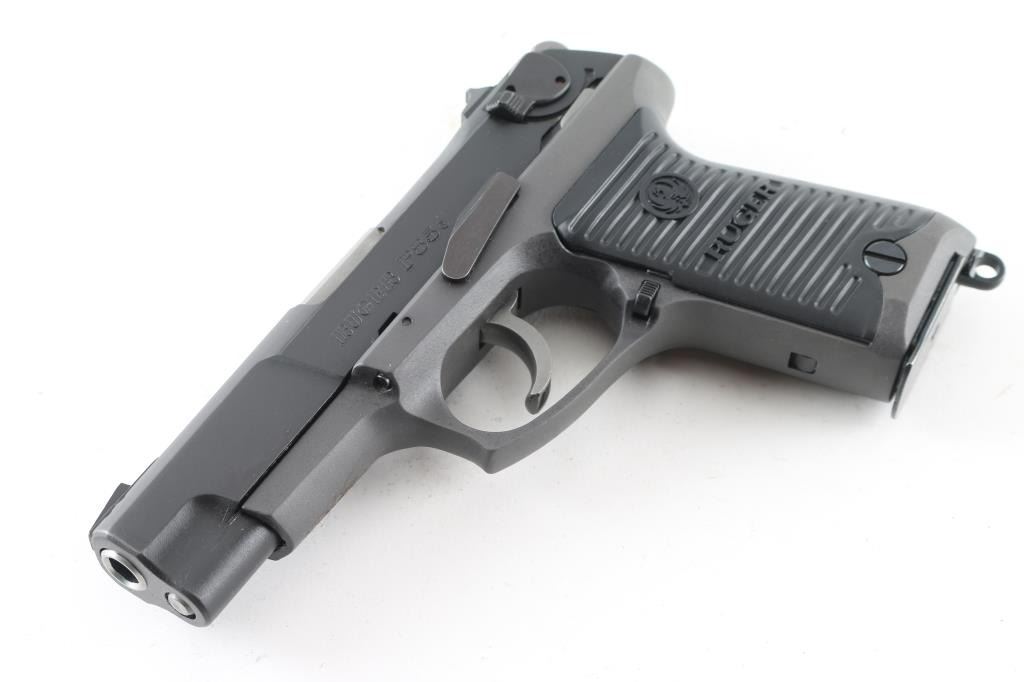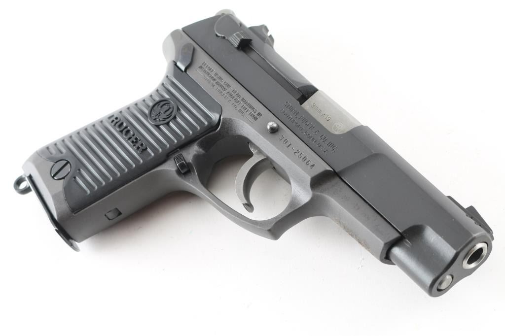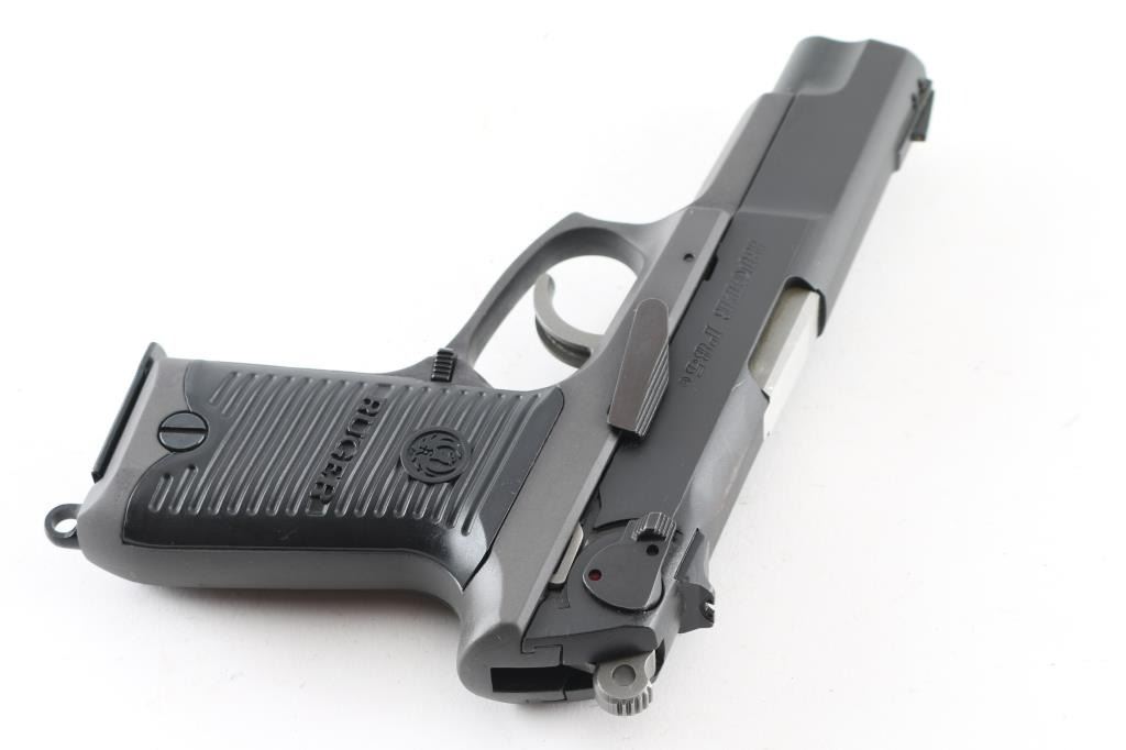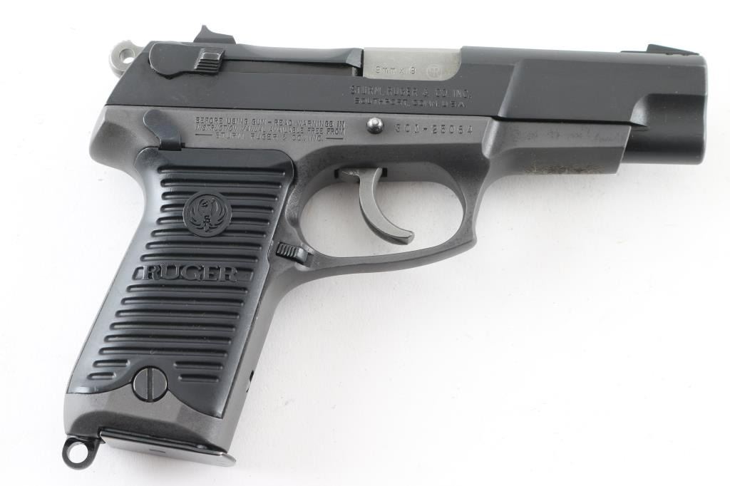 American made, double-action semi automatic pistol chambered in 9x19mm, circa 1989. Features a matte black finished steel slide, 4.25" barrel, three-dot sights, ambidextrous safety/decocker, wide smooth trigger, serrated round hammer spur, grey finished alloy frame, ambidextrous push button magazine release, lanyard loop and Ruger two-piece grooved black synthetic grips. The metal finish looks good with minor signs of handling. Grips look like new. Bore looks great, bright. This gun was stored with way too much oil and needs to be taken apart and cleaned. Comes with original black plastic factory case, owners manual and two magazines. Condition is NRA Very Good *Modern Firearm*