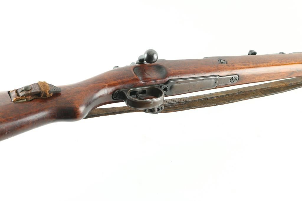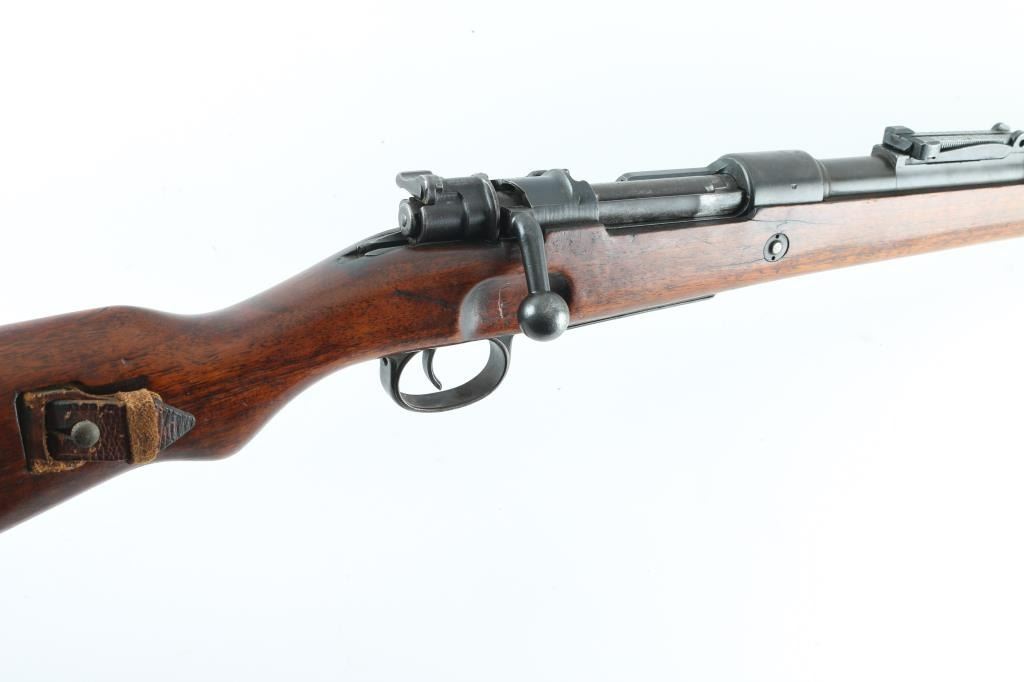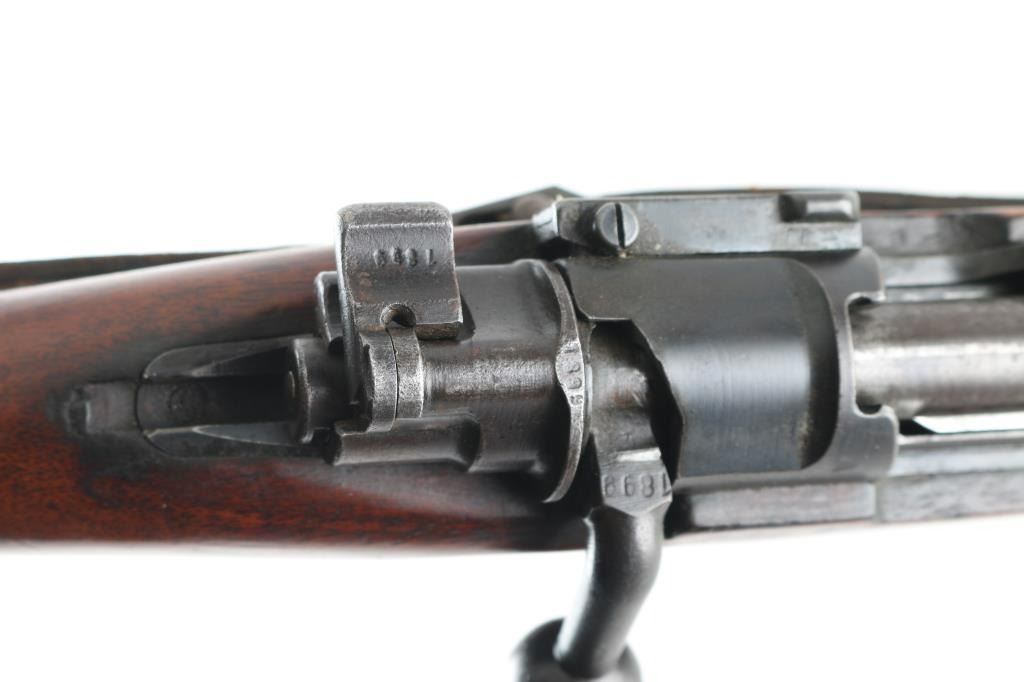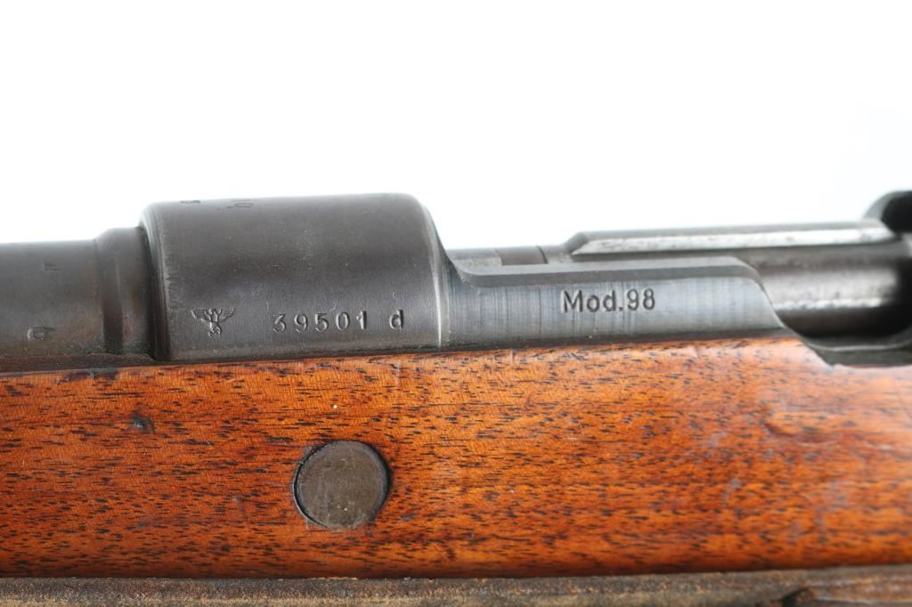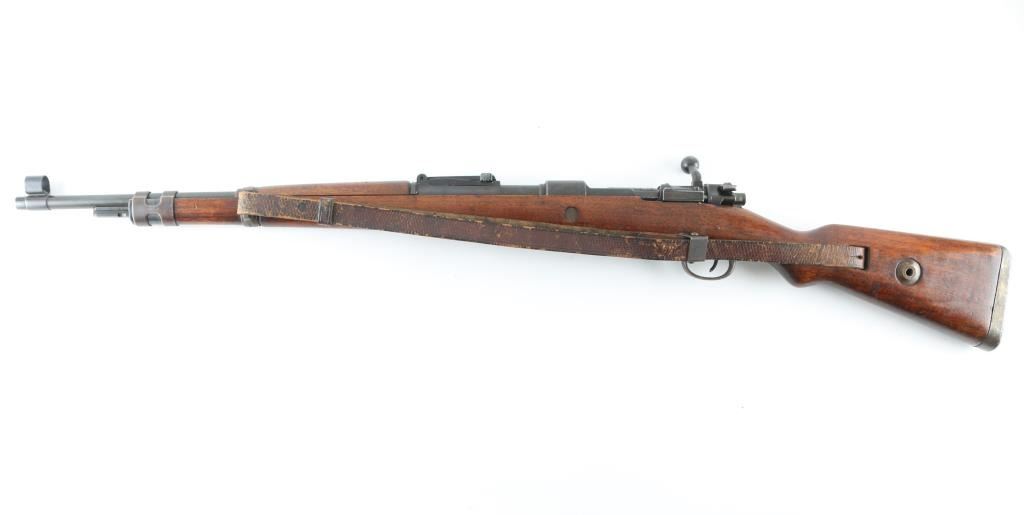 Rifle, Bolt action. German military issue. WW2 era. 1944 dated receiver. byf code. (Mauser, Oberndorf) Blued finish. Wood stock, and handguard. 23.62" barrel. Bore appears very good. Cupped steel butt plate stamped brg with waffenamts. Hooded front sight. Missing cleaning rod. Mismatched serial numbers.. About 80% of finish remaining, with small scratches/rubs present. Edge wear, handling loss. Wood is good shape, with small dings/dents present. Mauser floorplate. Waffenamts present. Mismatched bolt, front barrel band, and floorplate. Correct issue sling attached. Action is smooth/tight. NRA Condition-Very Good. C&R Firearm.