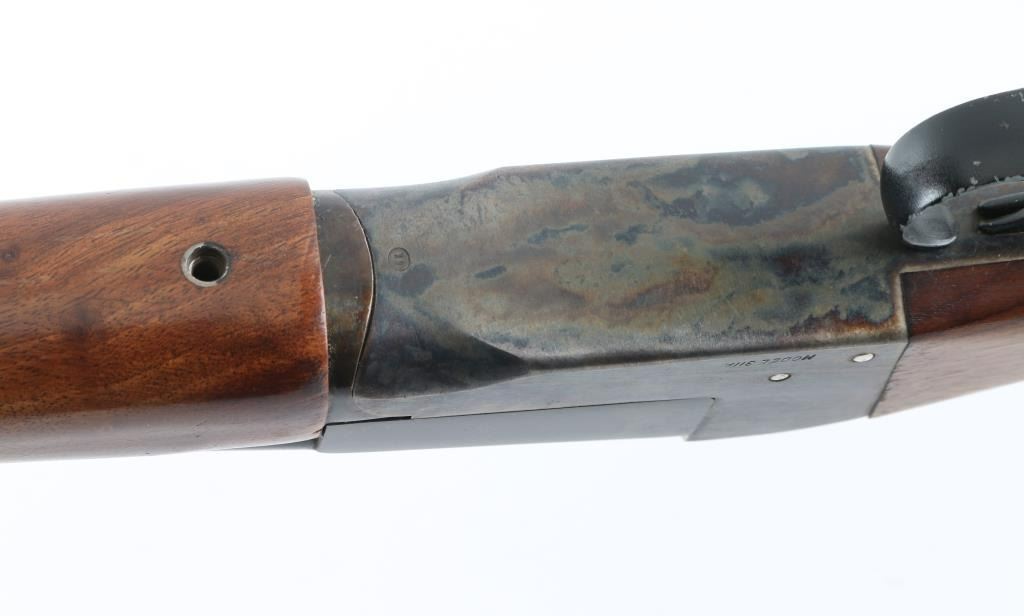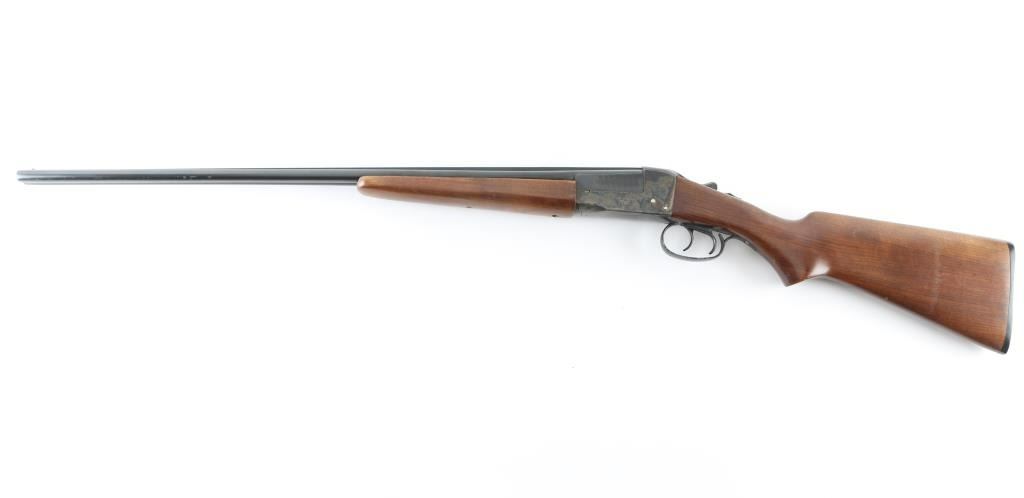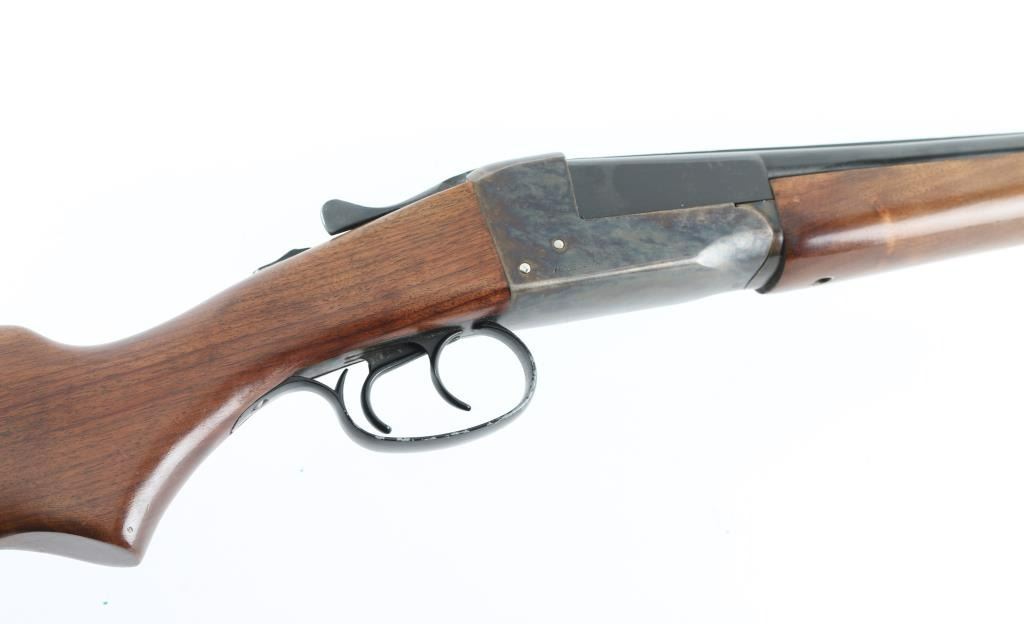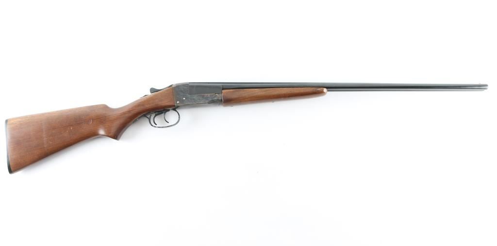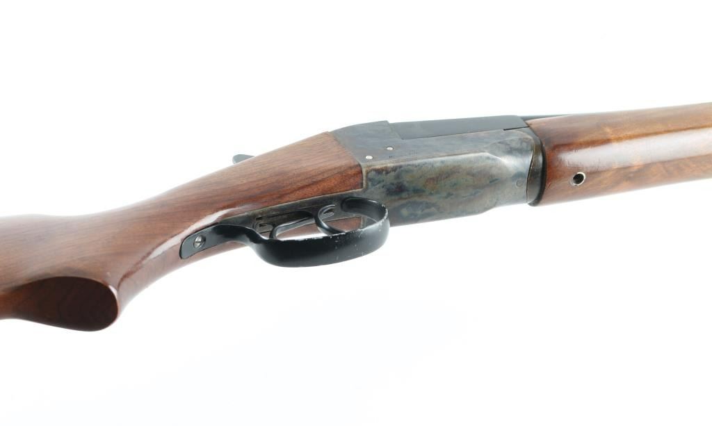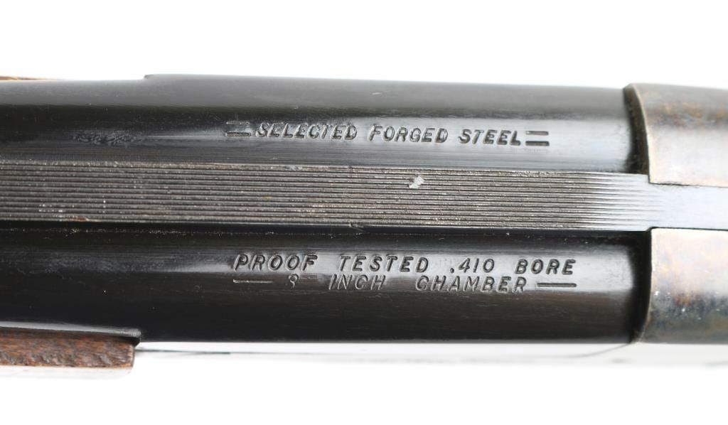 Double barrel side by side shotgun chambered for 410 bore 3" shells. Features blued barrels, case color receiver, smooth wood beavertail forend & semi-pistol gripped stock, 26" barrels with fixed chokes (both measure as Imp Mod), steel bead front sight, tang safety (automatically moves to safe on opening), top lever, double triggers, extractor, 14" length of pull to forward trigger, plastic buttplate. Bores are bright & shiny, cast an odd reflection as if possibly slightly bent. Retains 85% finish, with spots of patina or minor pitting on barrel, edge losses to painted triggerguard. Case colors are very good with bright mottled colors. Wood is very good with handling marks. Missing rear forend screw. Overall appearance is very good. Condition is NRA Fair (see above description) *** C&R Firearm ***