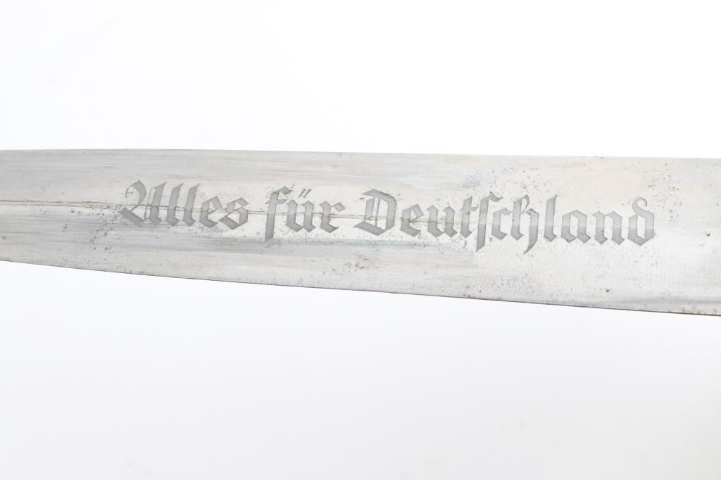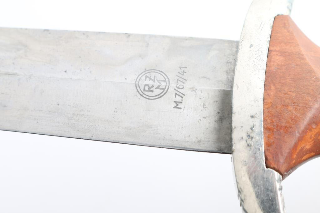 1941 production M33 NSKK (Motor Corps) Blade marked "RZM" in double circle with M7/67/41. (Gottlieb Hammesfahr) Hanger marked RZM M5/71 OLC. Blade, grip are very good, There is minor flaking to the cross guards. Scabbard fittings are very good. Black paint is about 70% with chips.