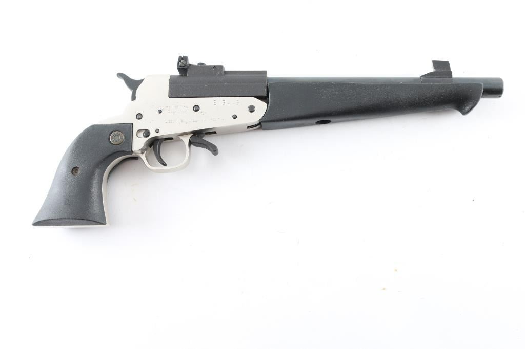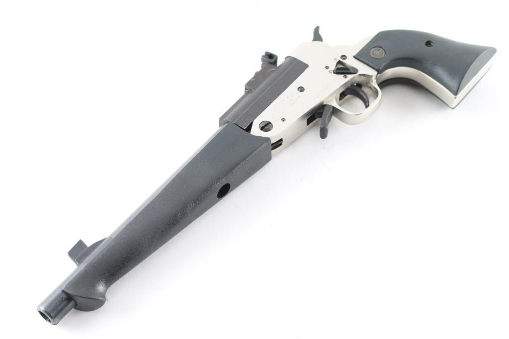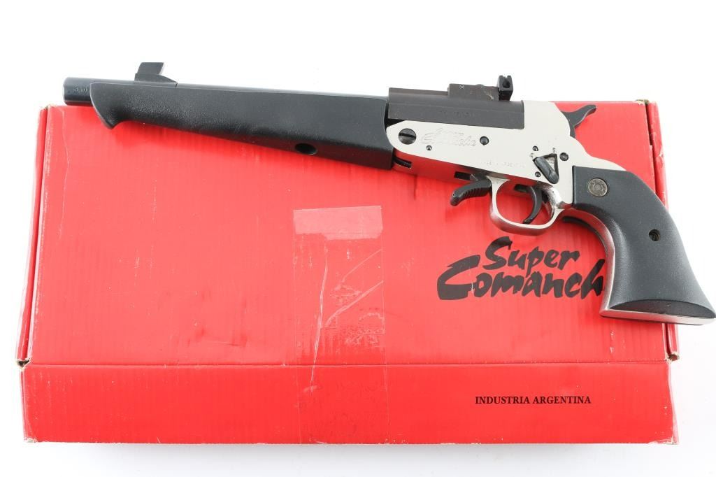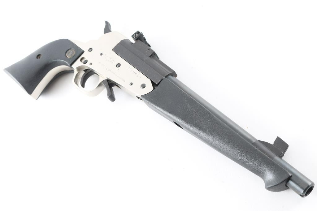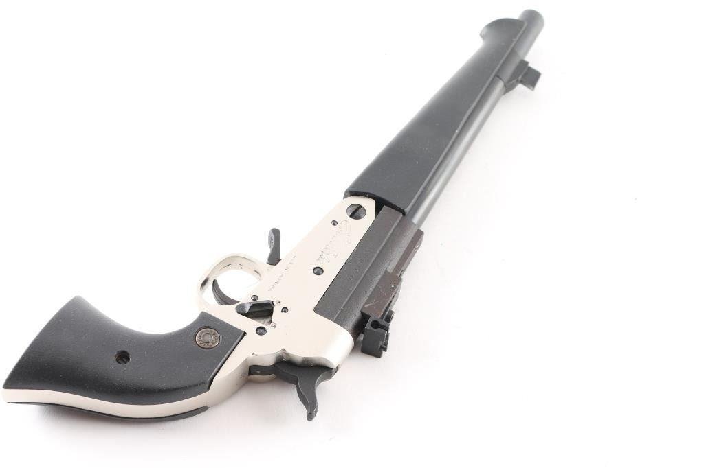 SN:219449 Argentinean made single action break-top pistol chambered for .45 Long Colt and 3".410 gauge shells. Features a blued finish on the 10" threaded barrel with a large front sight. The adjustable rear sight sits on a matte black receiver. The black thumb safety switch, serrated hammer spur, smooth trigger and under lever all sit in a satin nickel finish frame with black neoprene two piece grips & forend. Includes original factory box, .45 Colt & .410 chokes with removal tool. Metal finish looks good. Grips are fine. Bore looks very good, a little dusty but bright. Condition is NRA Excellent *Modern Firearm*