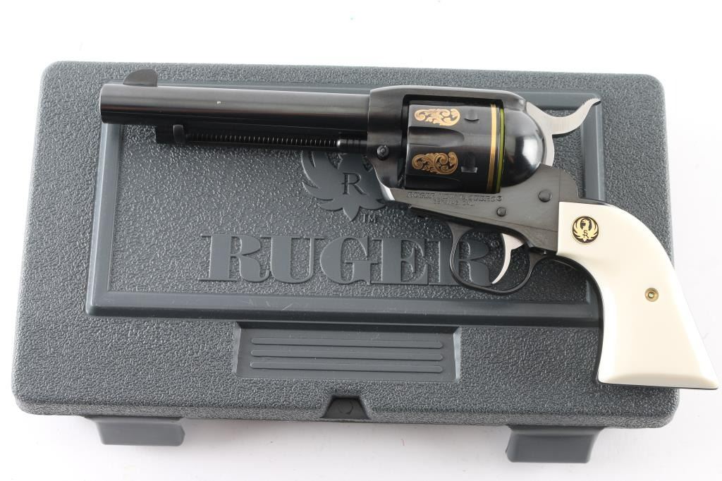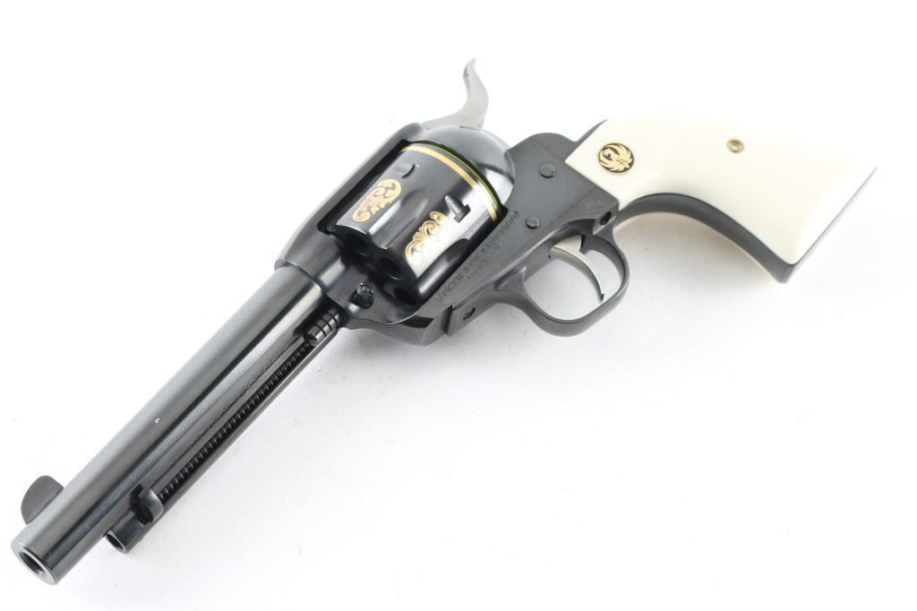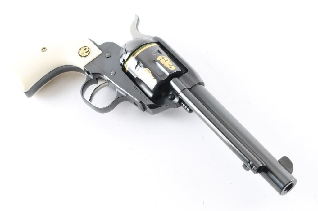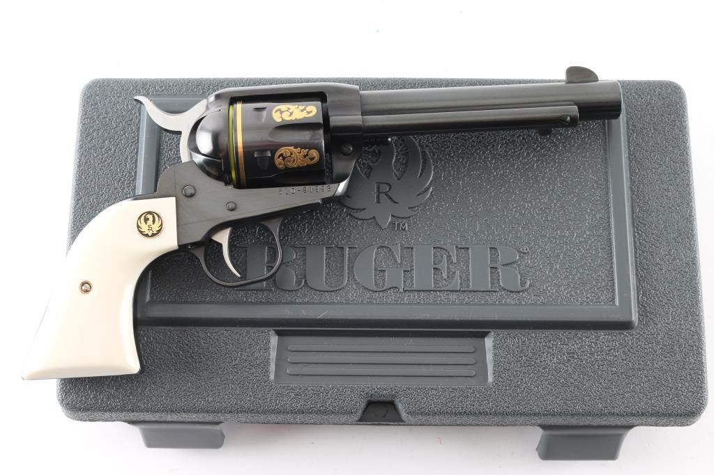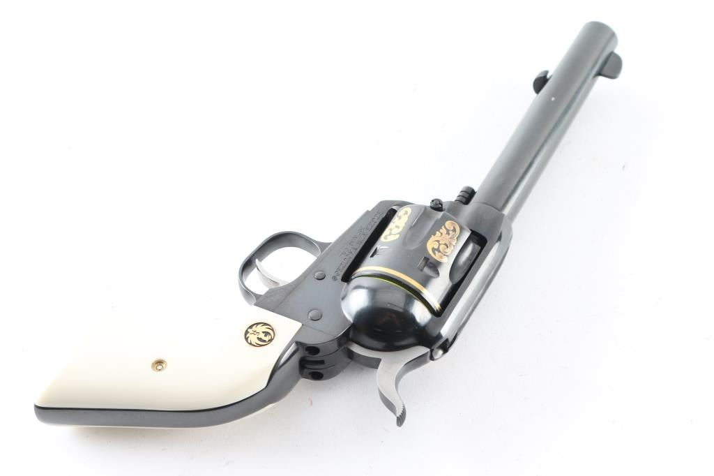 Made in America, circa 2010, this Talo Exclusive from Ruger is a Single Action, 6 shot revolver chambered for .357 Magnum ammunition. It features a blued finish with gold inlay cylinder and faux ivory grips with Ruger medallions. It has a blade front sight, integral rear sight, serrated blued hammer spur with chrome sides and smooth chrome trigger. Metal finish looks very good with one tiny spot (pin head) of loss of finish on the left side of the barrel. Grips look great. Bore looks very good, bright but needs cleaned. Gold inlay looks great. Comes with original grey plastic Ruger case and owners manual. Condition is NRA Very Good+ *Modern Firearm*