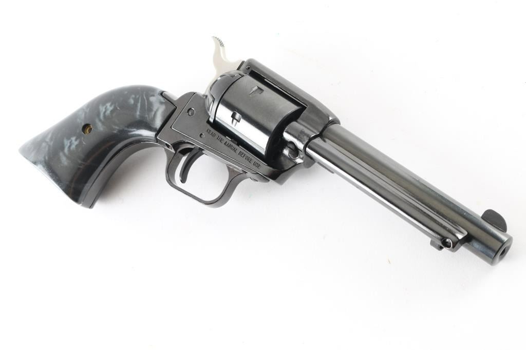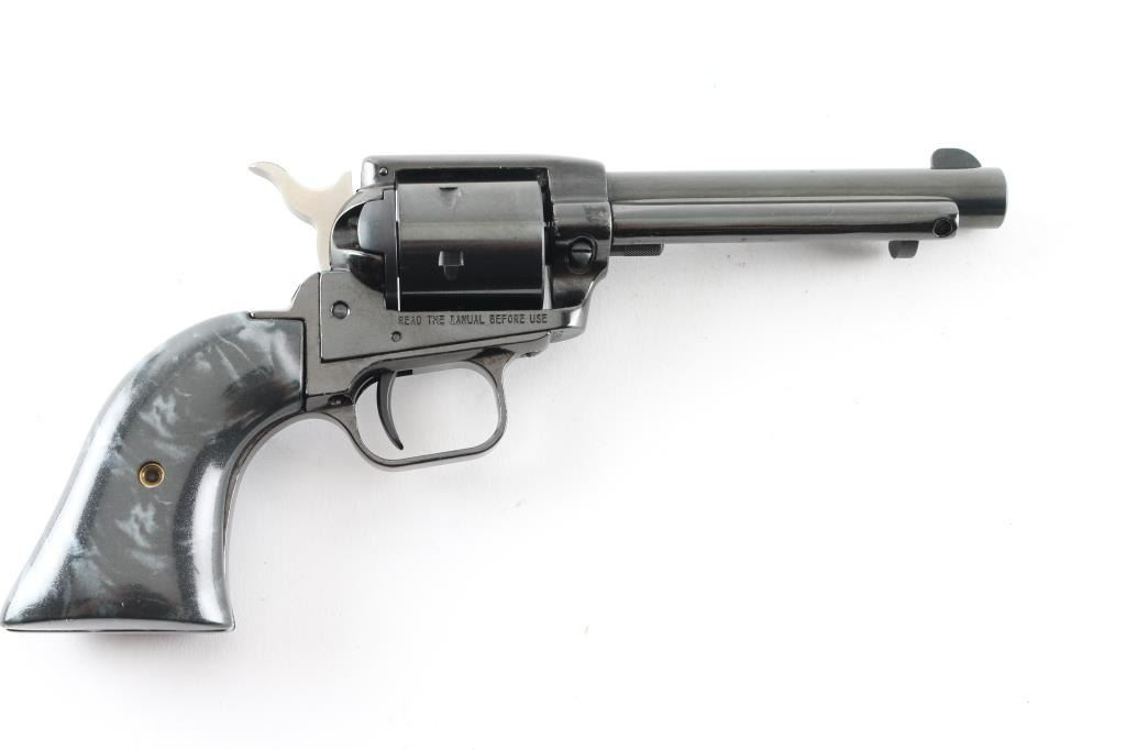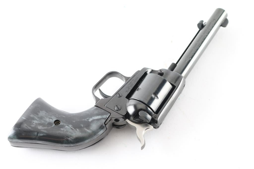American made Single Action 6-Shot Revolver chambered for .22 caliber ammuntion and comes with both the fluted .22LR cylinder and the plain .22 Magnum cylinder. It features a 4.75" black barrel with frame, grip frame and trigger to match. It sports a blade front sight, integral rear sight, safety on the left side of the chrome hammer with knurled spur and two piece plastic grey and black grips. Metal finish looks good with a scuff on the bottom of the grip frame and a tiny ding mid-way down the barrel on the right..Grips look good. Bore looks bright with a small amount of residue. Comes with original factory cardboard box, owners manual and both cylinders. Condition is NRA Very Good+ *Modern Firearm*