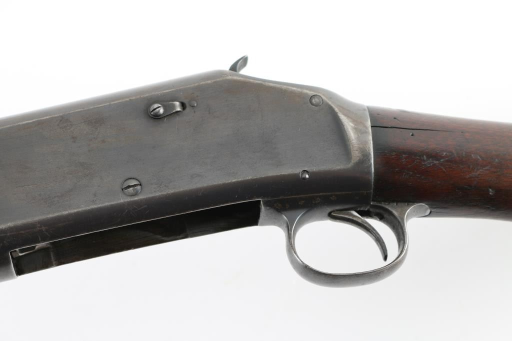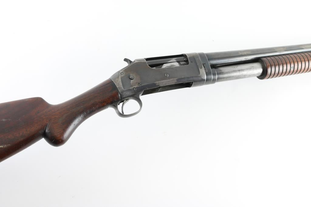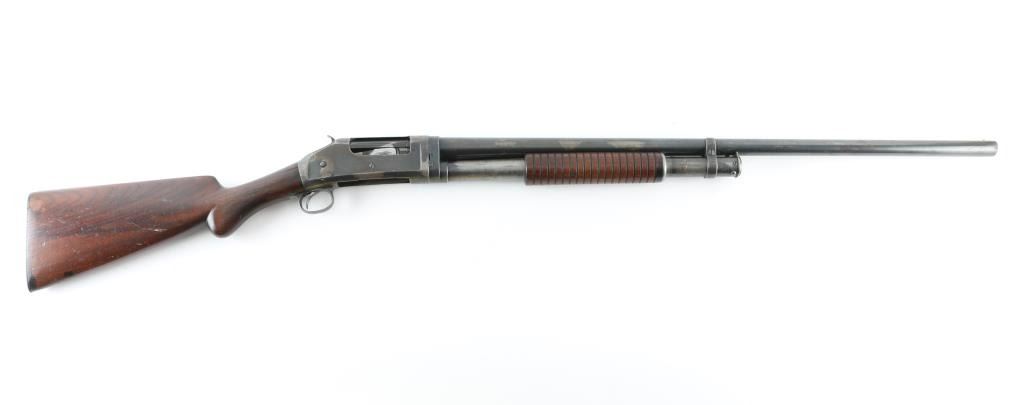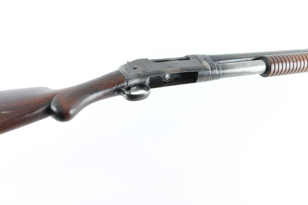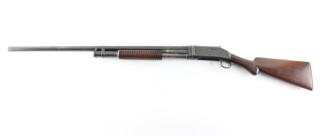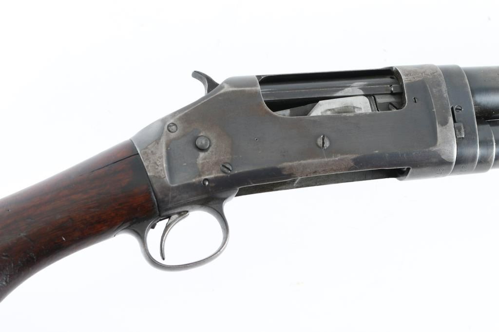 Take down pump action shotgun manufactured circa 1905. Features 30" plain barrel marked FULL choke with a brass front bead, half length magazine tube, smooth wood semi-pistol grip stock & grooved pump handle. It has a thin smooth trigger and a knurled metal butt plate. Metal finish is either fading, gone completely or turned to a patina. The wood forend looks good. The stock is cracked at the wrist on both sides where the wood meets the receiver and has a heavy scratch on the left side. Bore looks to have some pitting. LOP is 14". Condition is NRA Poor...due to pitting. *C&R Firearm*