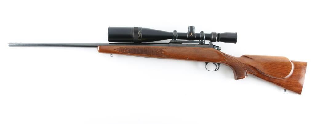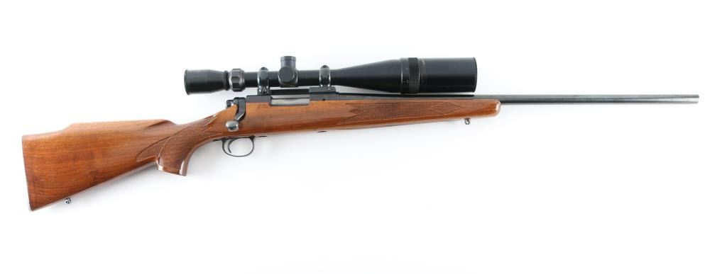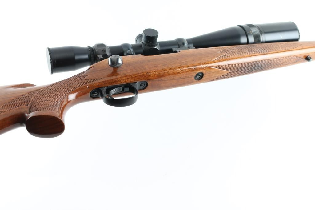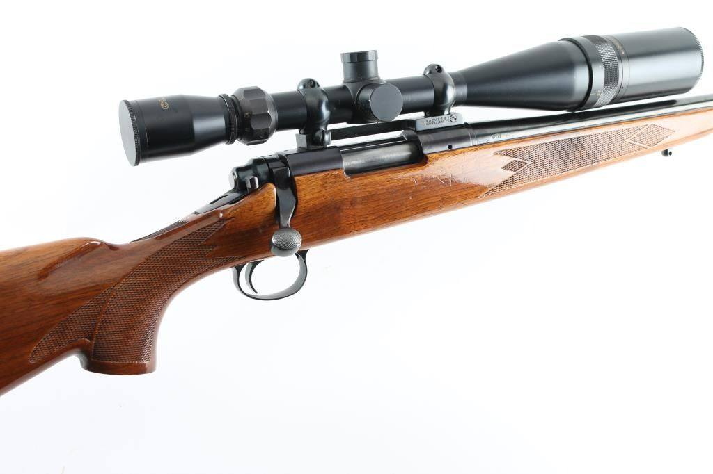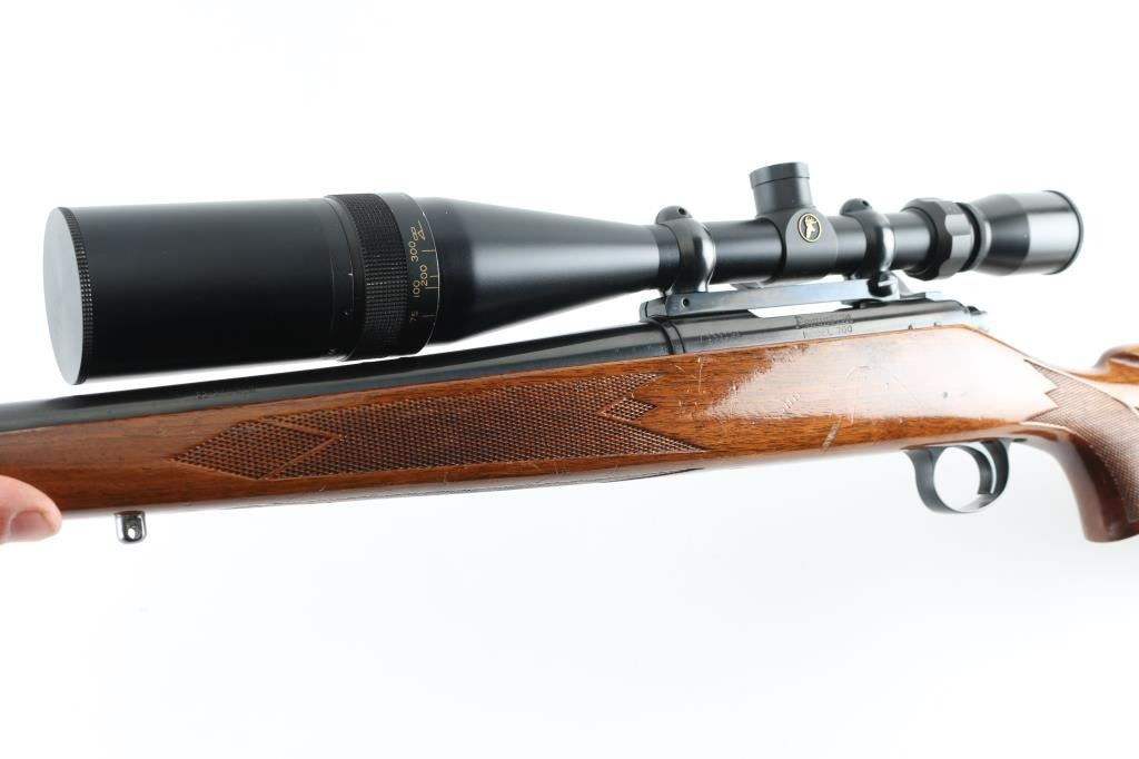 American made bolt action centerfire rifle chambered for 22-250 Rem circa 1965. It features a 24" blued barrel and receiver, no sights but drilled and tapped for both sights and scope bases. It has a serrated trigger, metal trigger guard and thumb safety on top right side of tang. It sits in a very nice Monte Carlo stock, checkered at the wrist and forearm with a cheek rest for right hand shooters. It has swivel studs attached and a knurled metal Remington butt plate. Metal finish looks good with very little sign of use. Wood stock looks good but do show some signs of use and handling. Bore looks good but needs cleaned. LOP is 13.75". Comes with a Tasco World Class 6-24x44 A/O scope with sunshade, rings and a Buehler base. Condition is NRA Very Good+ *Modern Firearm*