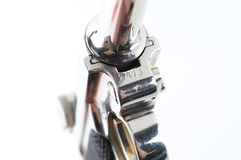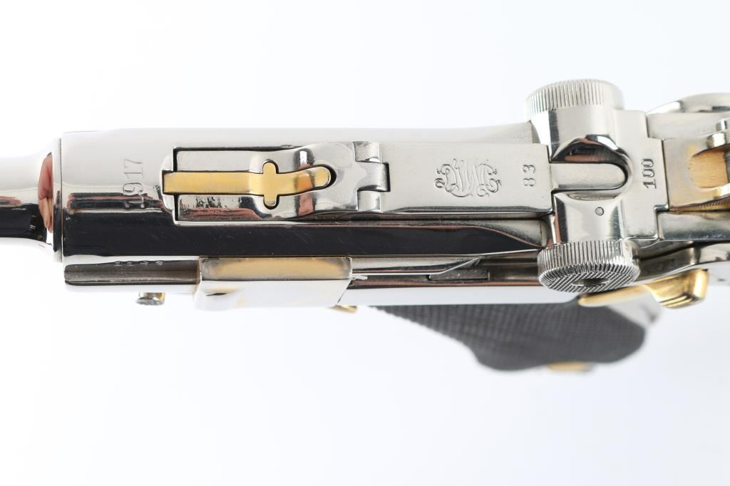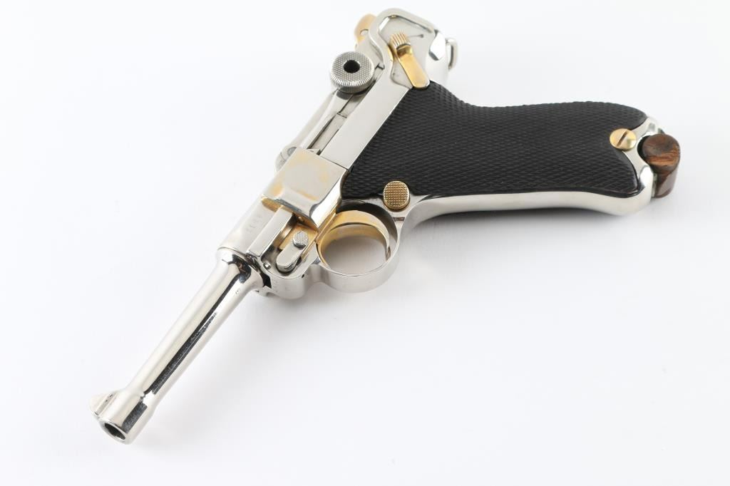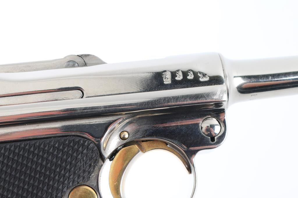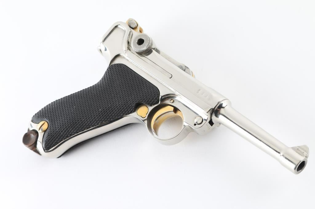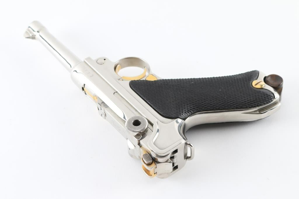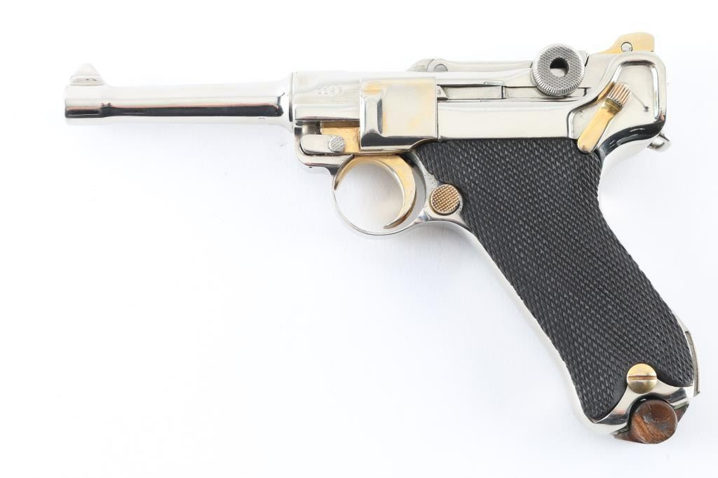 WWI era Luger, German military toggle locked recoil operated semi-automatic pistol chambered in 9x19mm Parabellum, manufactured circa 1917. Has been polished & refinished in nickel, with gold color accents on controls & grip screws, showing some loss of sharp edges from aggressive buffing. Features 4" barrel, dovetailed inverted 'V' front sight, Navy type rear sight, smooth crescent trigger, knurled charging knobs on the rear toggle link, manual safety of the left side of the frame, knurled push button magazine release, lanyard bar, checkered black plastic grips. All observed numbers are mismatched on this parts gun. Retains stock lug on frame. Bore is very good. Finish is very good condition with little discoloration, no observed peeling or flaking. Grips are very good. Magazine appears to be earlier manufacture, unmarked, with wood plug (chip missing from left side of plug). Condition is NRA Very Good (refinished - non matching) *** C&R Firearm ***