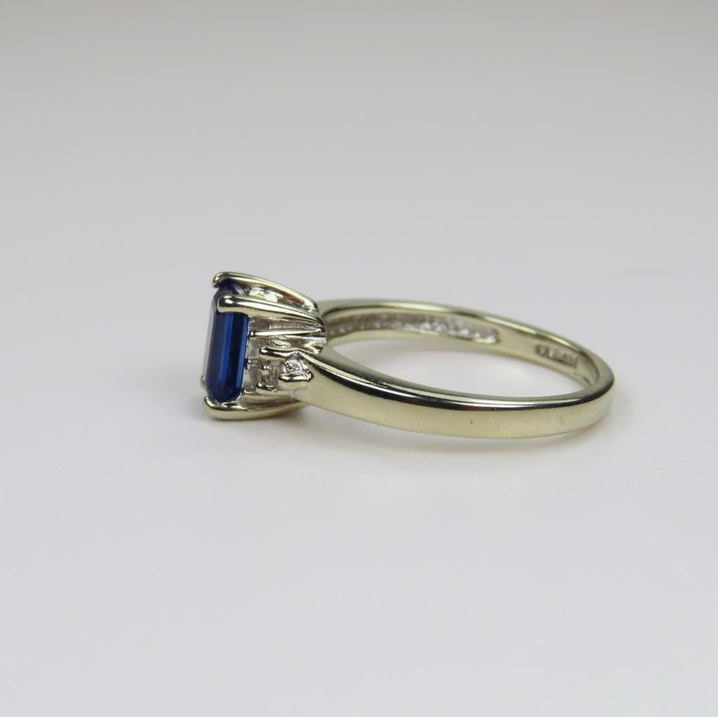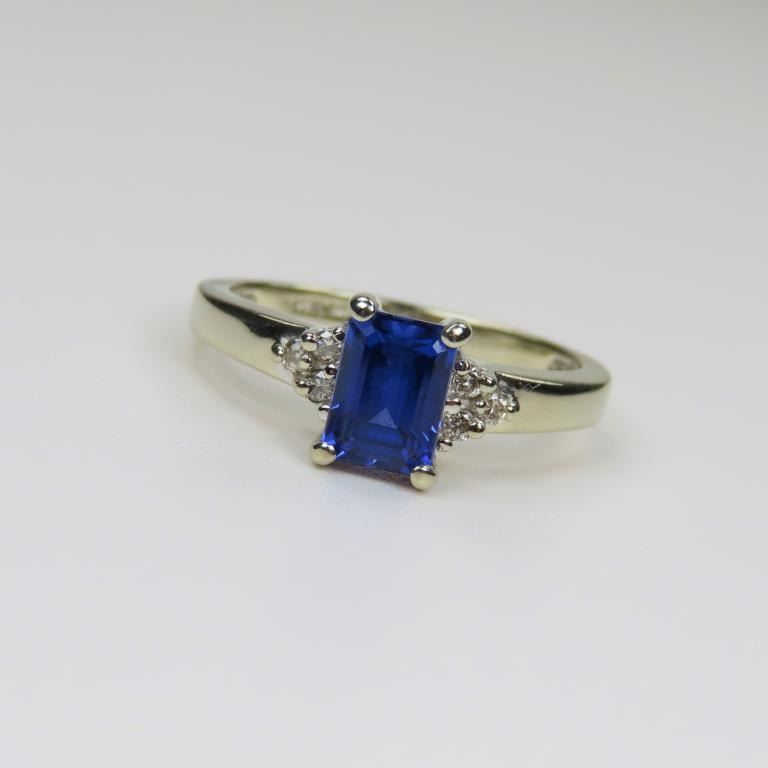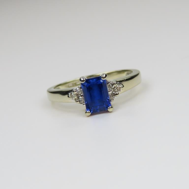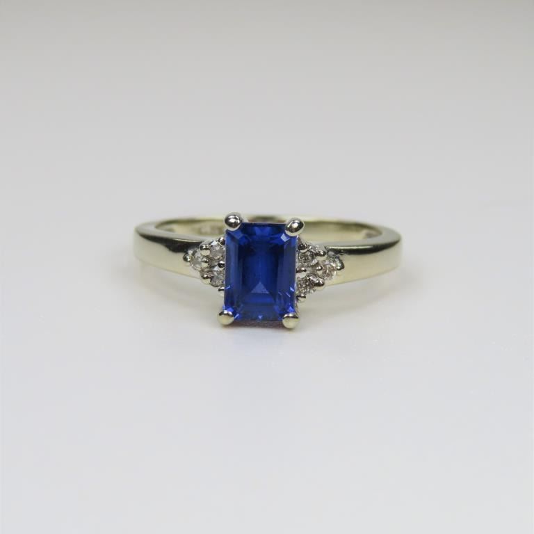 Ring featuring an emerald shaped Sapphire weighing approx. 1.00 carats with Vivid Cornflower Blue color with 6 round accent Diamonds weighing approx. 0.20 carats with F-G colors and VS clarity set in 14 karat white gold.