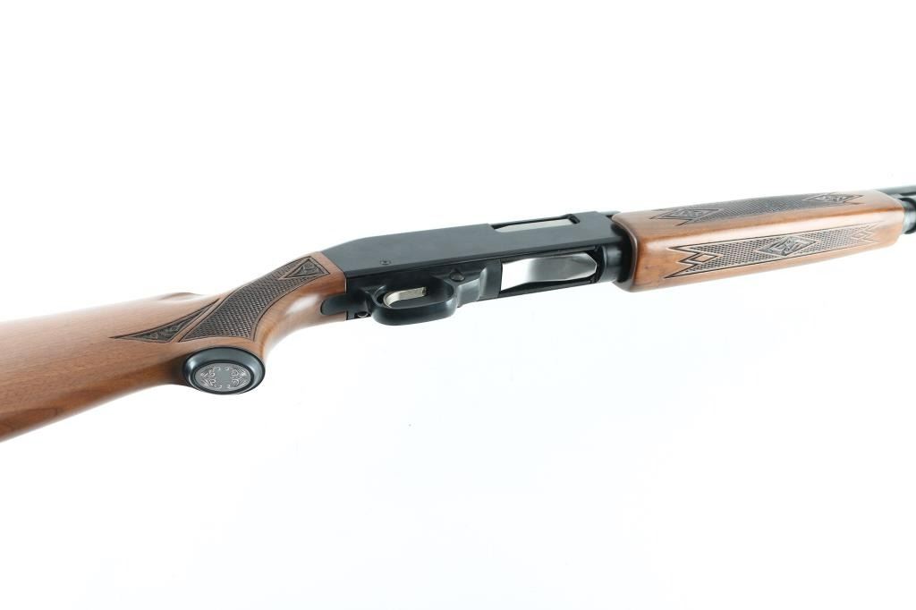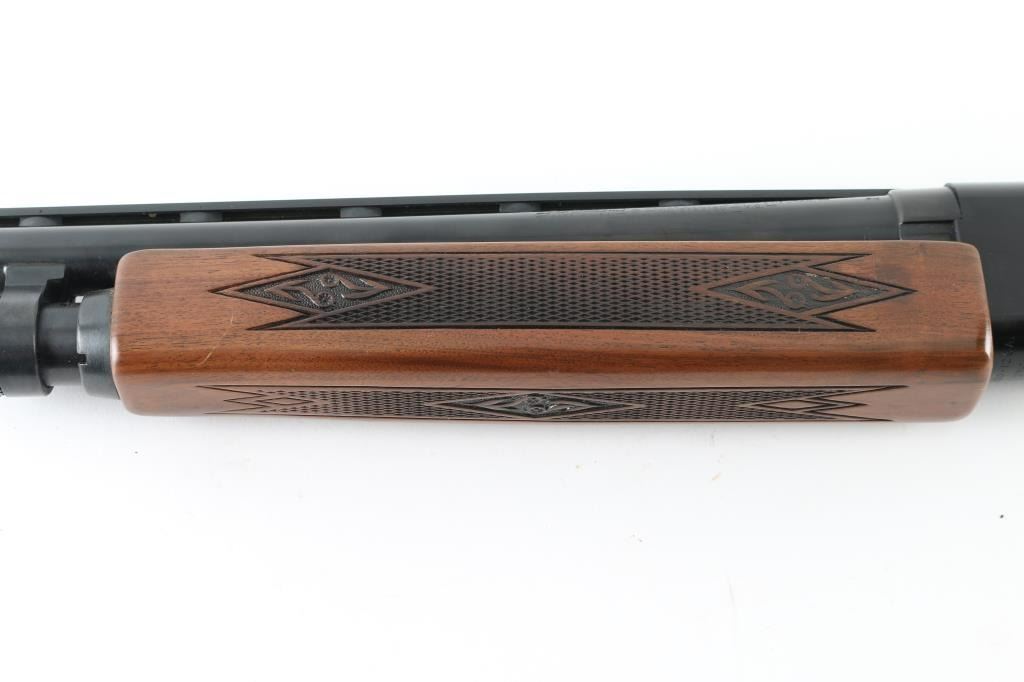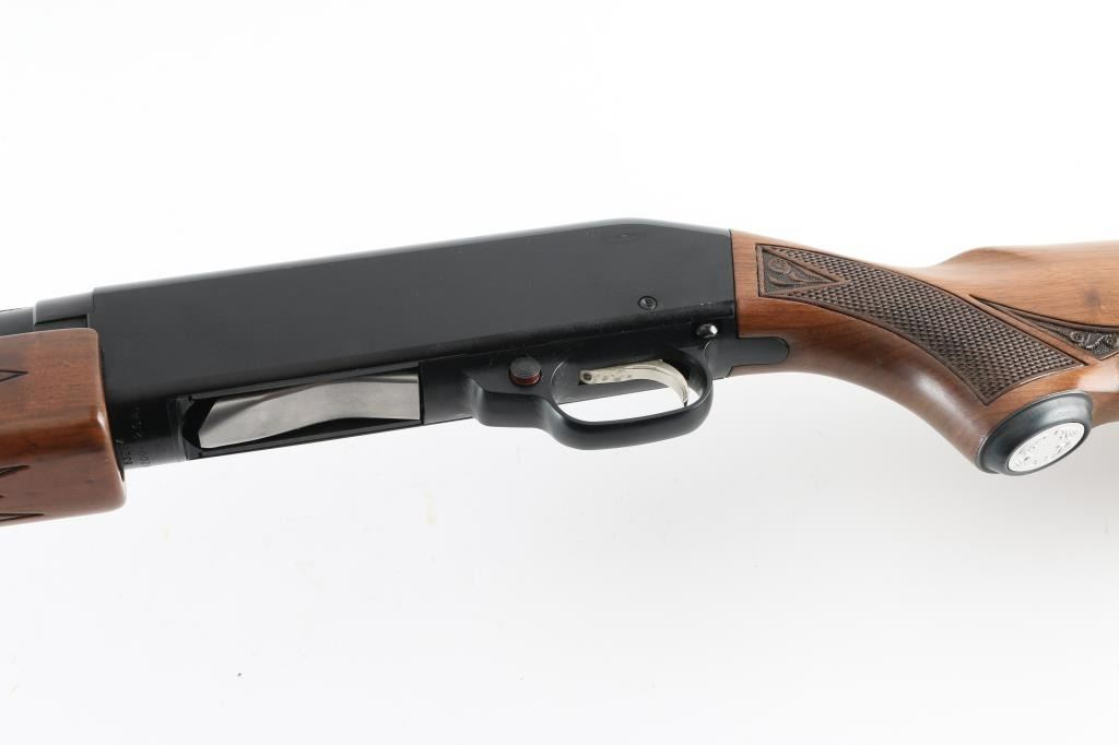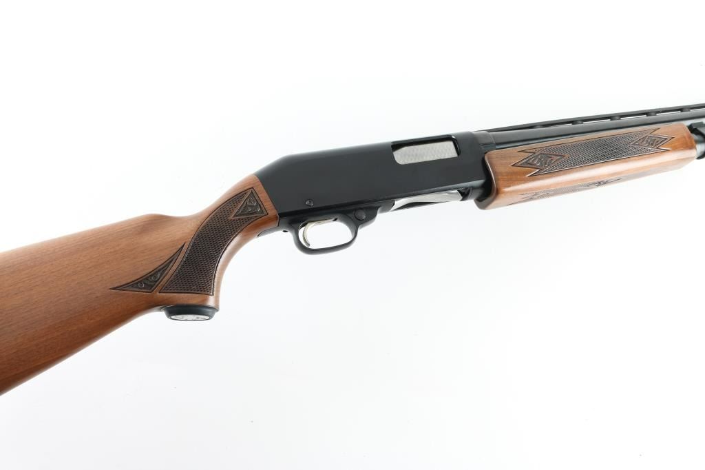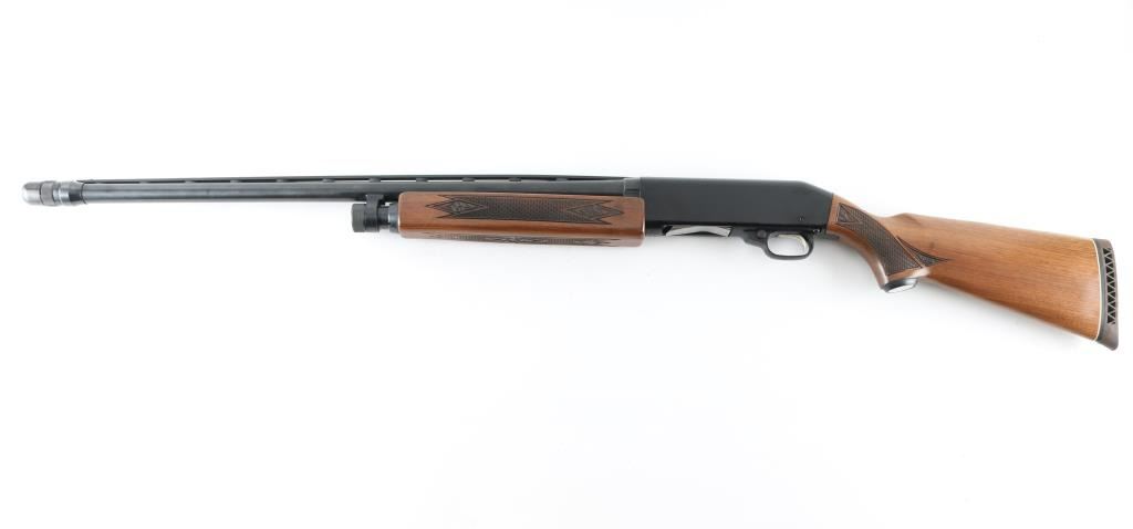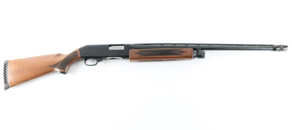 Trade name slide action repeating shotgun chambered for 2 3/4" 12 gauge shells, manufactured by Winchester as a slightly modified version of their Model 1200. Features a blued 26" barrel with ventilated sighting rib . external adjustable choke, half-length tube magazine, brass bead front sight, smooth trigger with beveled edges, push button safety, black finished alloy receiver, press checkered wood slide handle and pistol grip shoulder stock with metal grip cap, factory recoil pad & Shotgun retains approximately 98% of it's original finish showing very little wear. Action is smooth, the bore appears very good but dirty and the wood stocks are near fine. Condition is NRA Excellent. Modern Firearm.