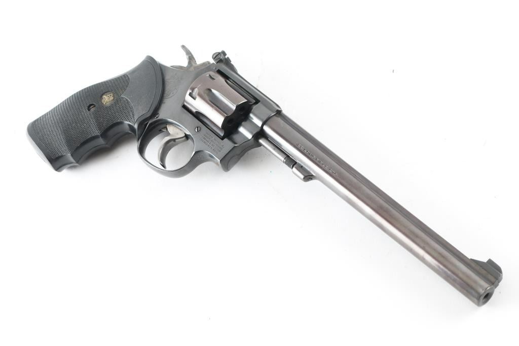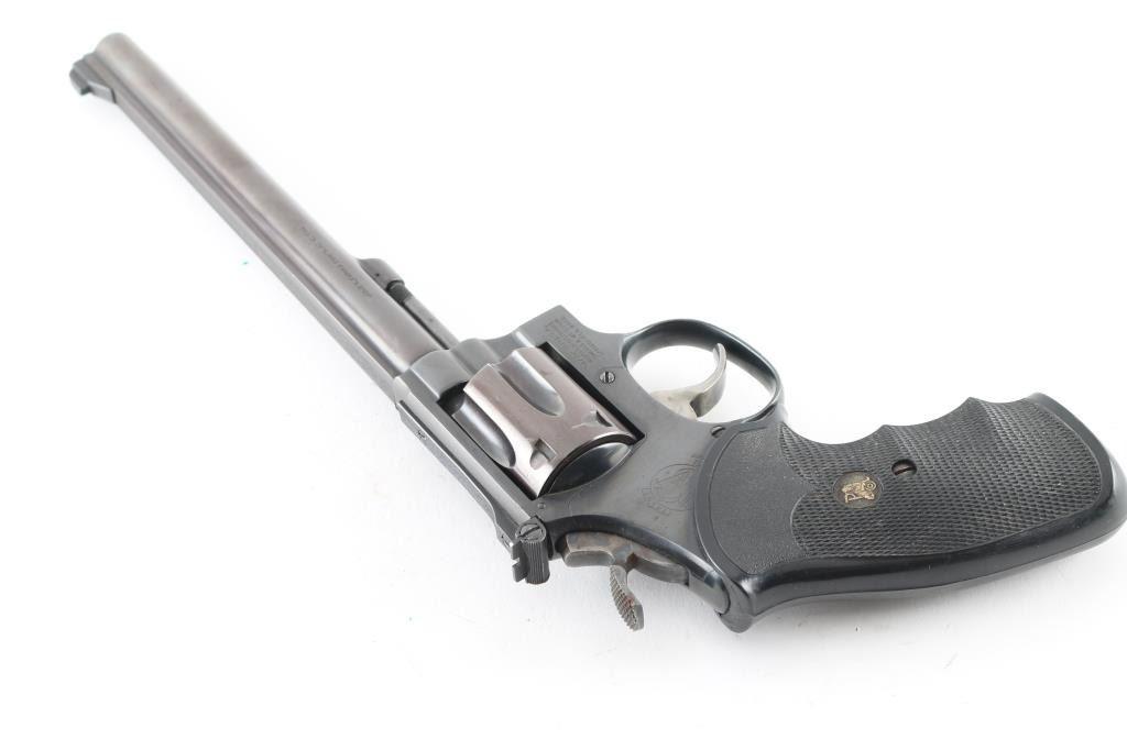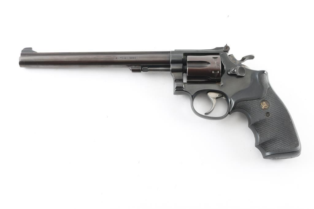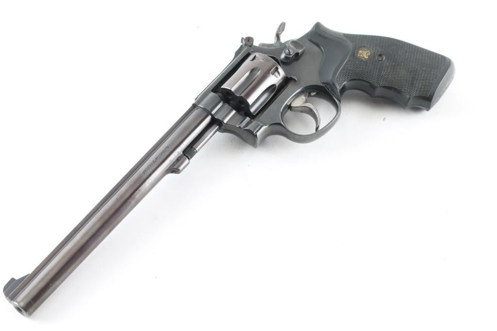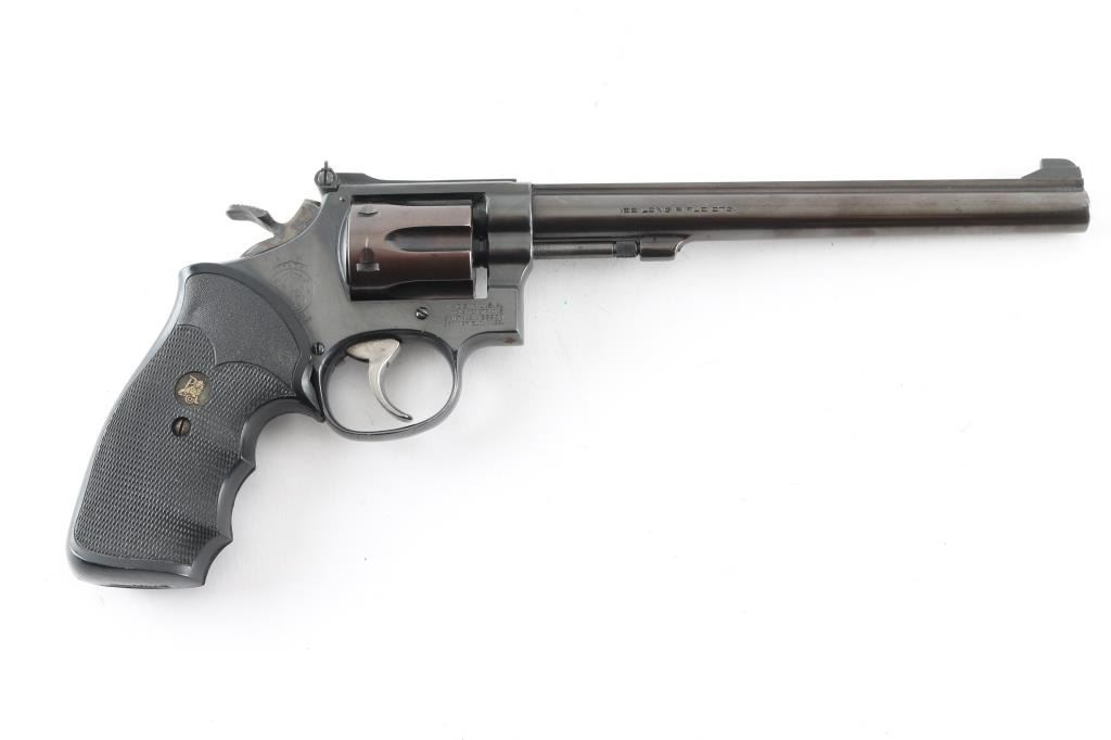 'The K-22 Masterpiece' Medium frame double action revolver chambered in .22 Long Rifle, manufactured circa 1981. Features re-blued finish, 8 3/8" barrel with serrated sighting rib, raised patridge front sight, adjustable micrometer click rear sight, fluted six-shot cylinder with counterbored chambers, non-shrouded ejector rod, smooth target trigger, knurled target hammer, three screw square butt K target frame with trigger stop & ten groove grip straps, Pachmayr "Gripper" checkered black rubber finger groove grip. Bore and charge holes are very good condition. Retains 85% re-finish, plum colored on barrel & cylinder, several areas have pitting under the re-finish, showing slight loss of detail and partial thinning of S&W frame emblem, edge losses, some small spots of light rust in several places, light rust on front strap. Trigger has been polished to bare metal. Grips are very good. Smooth action with tight lock-up. Condition is NRA Good++ (refinished) *** Modern Firearm ***