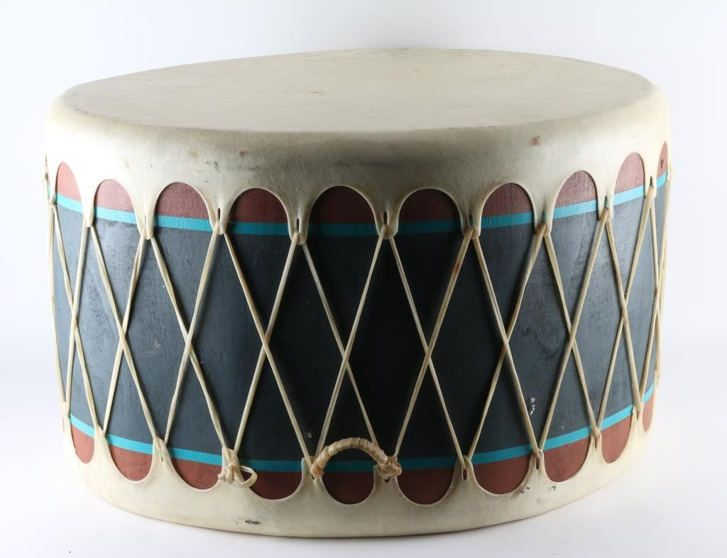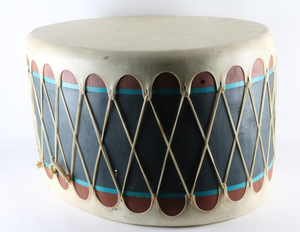 30"x18" Blue, teal, and red painted sides with hide covered drum with beater.