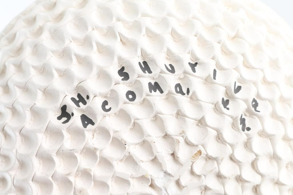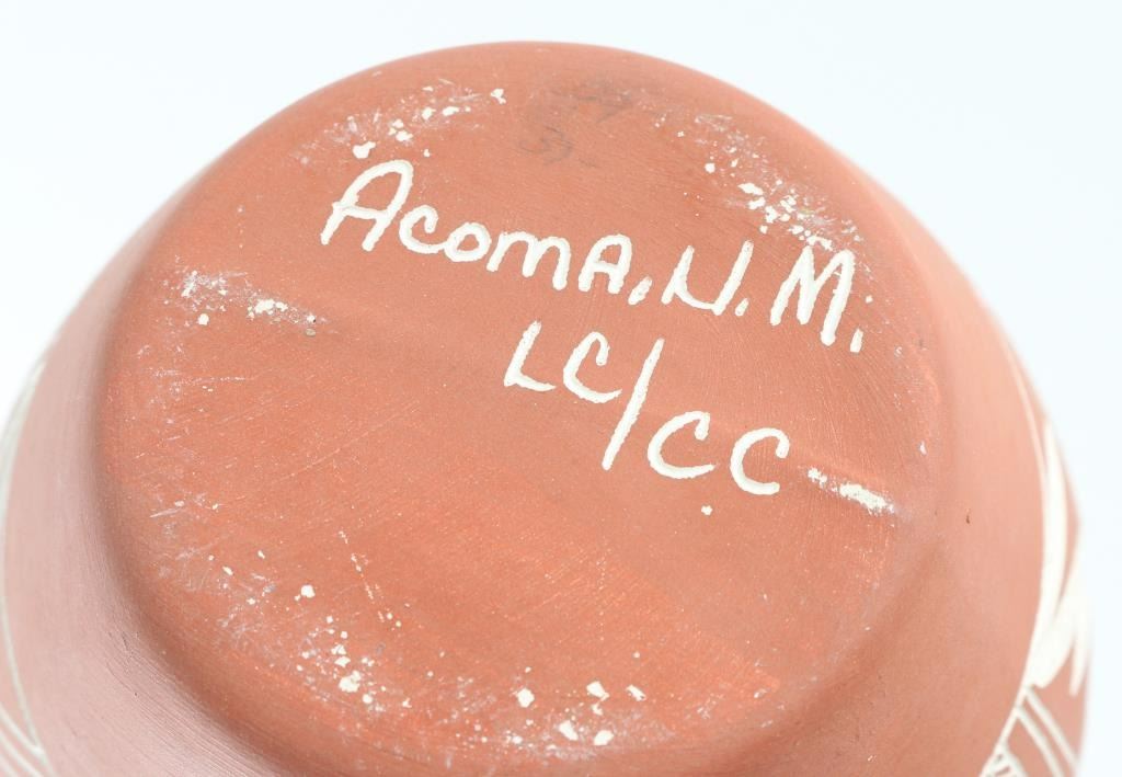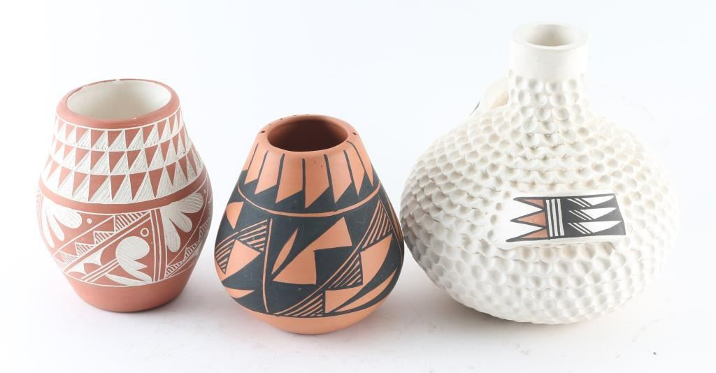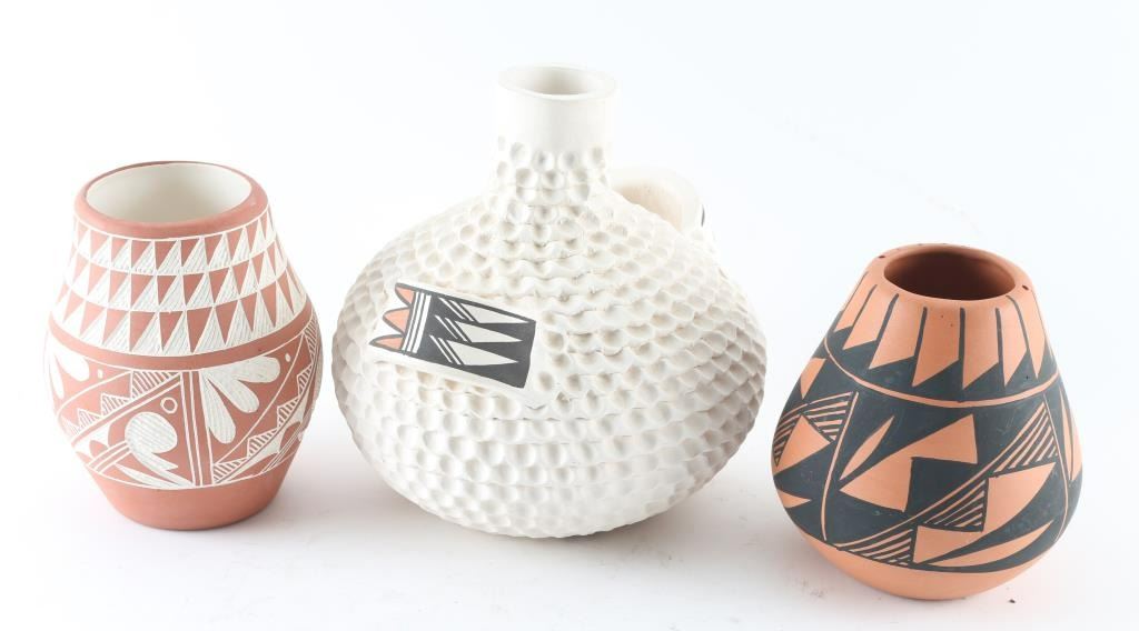 Including a geometric design pot signed "Counch" measuring 5x3, carved geometric pot signed, "LC/CC" measuring 5x5 and a handled pinch pot by "JH Shutiva" measuring 7.5