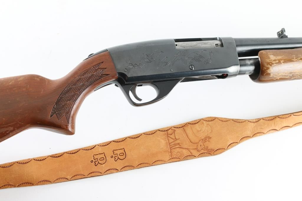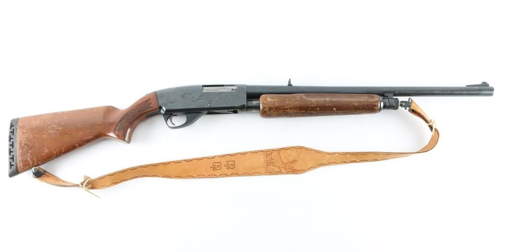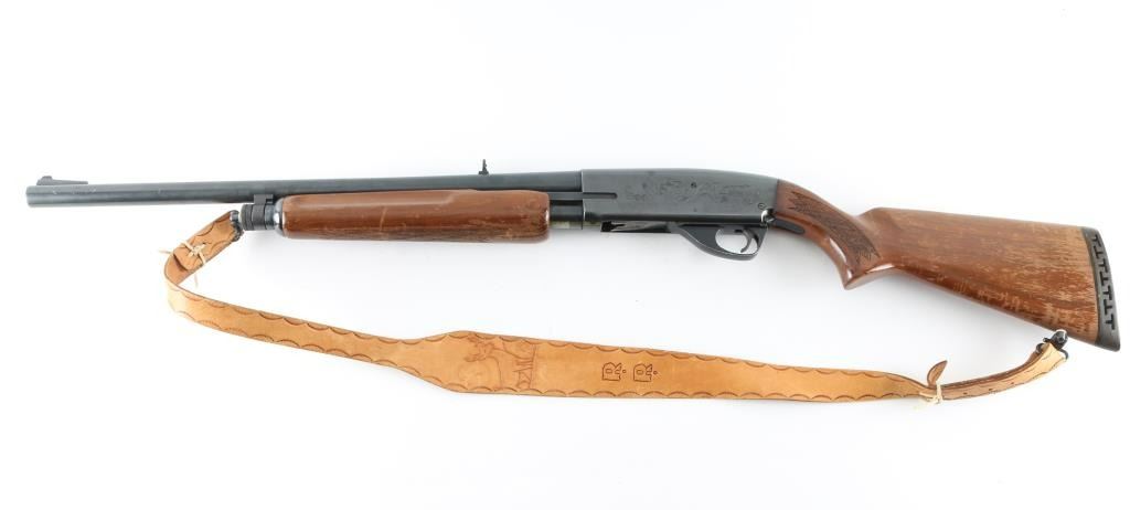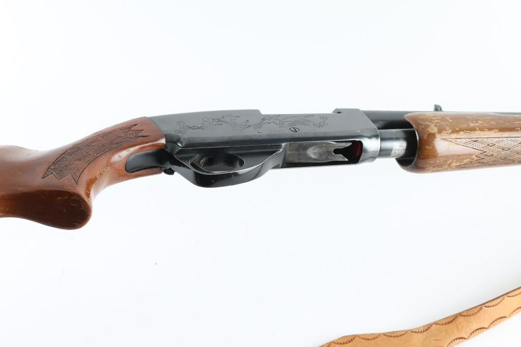 American made slide action repeating shotgun chambered for 2 3/4" & 3" 12 gauge shells, manufactured circa 1958-1978. Features a blued finish, 22" barrel with ramped post/bead front, and flip white triangle u-notch rear sights, half-length magazine tube, single slide arm, smooth trigger, alloy trigger guard, sliding tang safety, steel receiver with simple roll-stamped bird scenes, press checkered walnut slide handle with finger grooves and pistol grip shoulder stock with ventilated recoil pad. Shotgun exhibits approximately 85% of it's original blued finish showing some edge/friction wear, and minor scratches.. Action is smooth, the bore appears very good but a little dirty and the wood stocks are fair with numerous scratches with little finish retained. Brown leather sling attached. Condition is NRA Good. ***Modern Firearm***