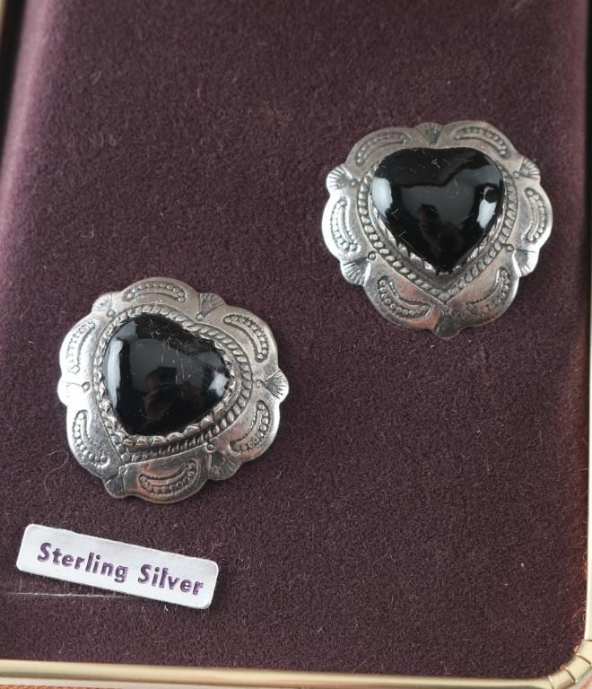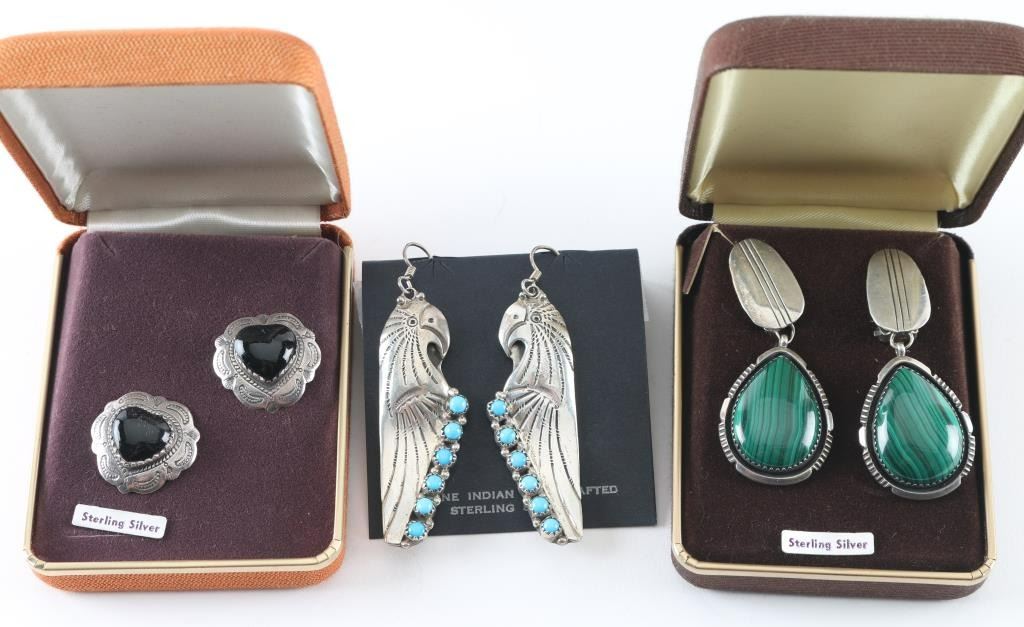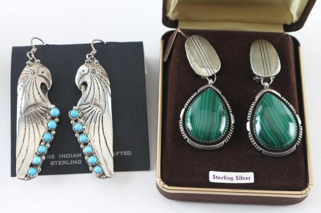 (1) Onyx and sterling heart shaped studs (1) Malachite and sterling earrings (1) Sterling and turquoise bird earrings