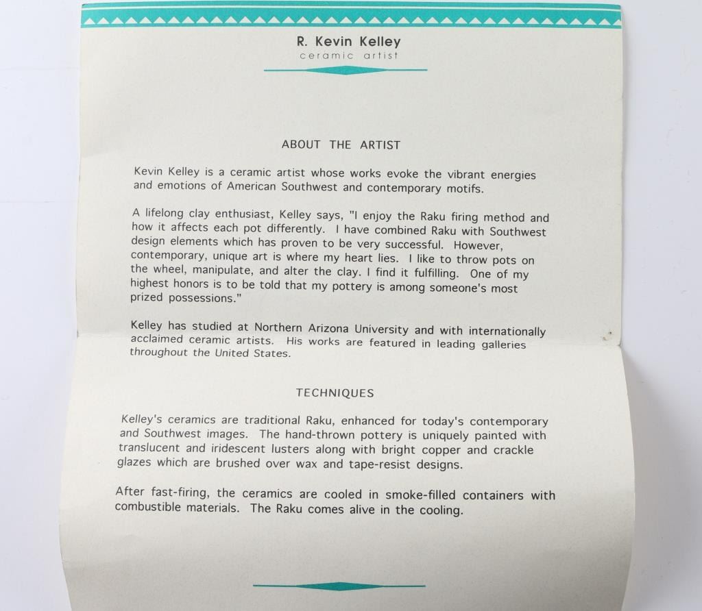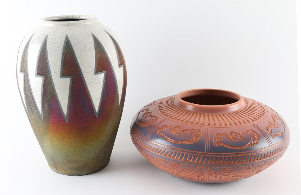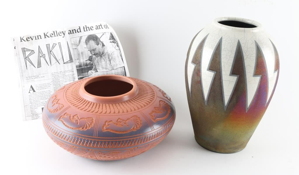 1.) Ceramic Pot, done by Kevin Kelley, with a unique, Raku, firing iridescent method and signed on base, and measuring 12x7 2.) Acoma Insized carved Pot, with Kokopeli and geometric design, and done by Jr. and Diana Aragon, measuring 13x5.
