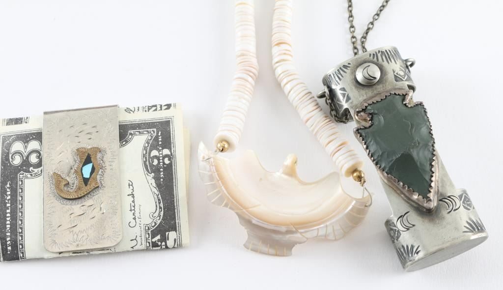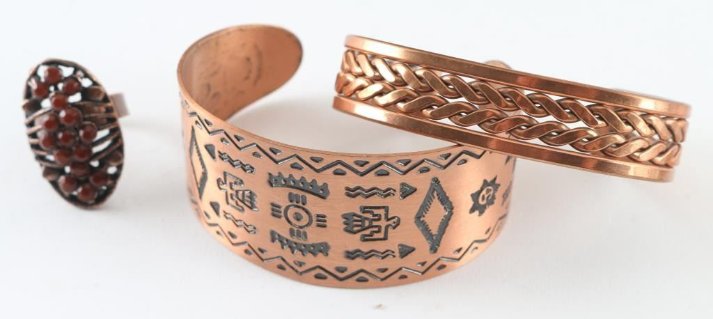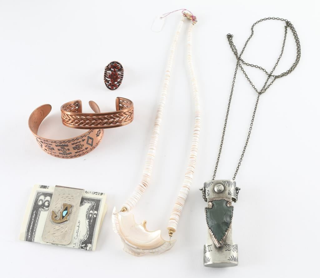 Including Two Copper Cuffs, Copper Ring, Nickeled Money Clip, Beaded Necklace, Lighter Holder Pendant.