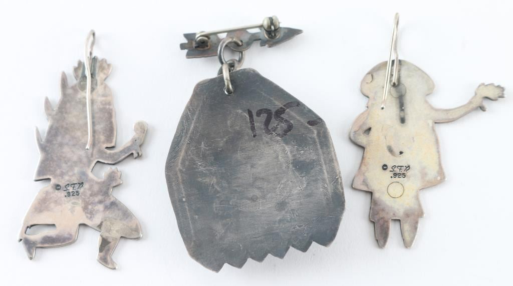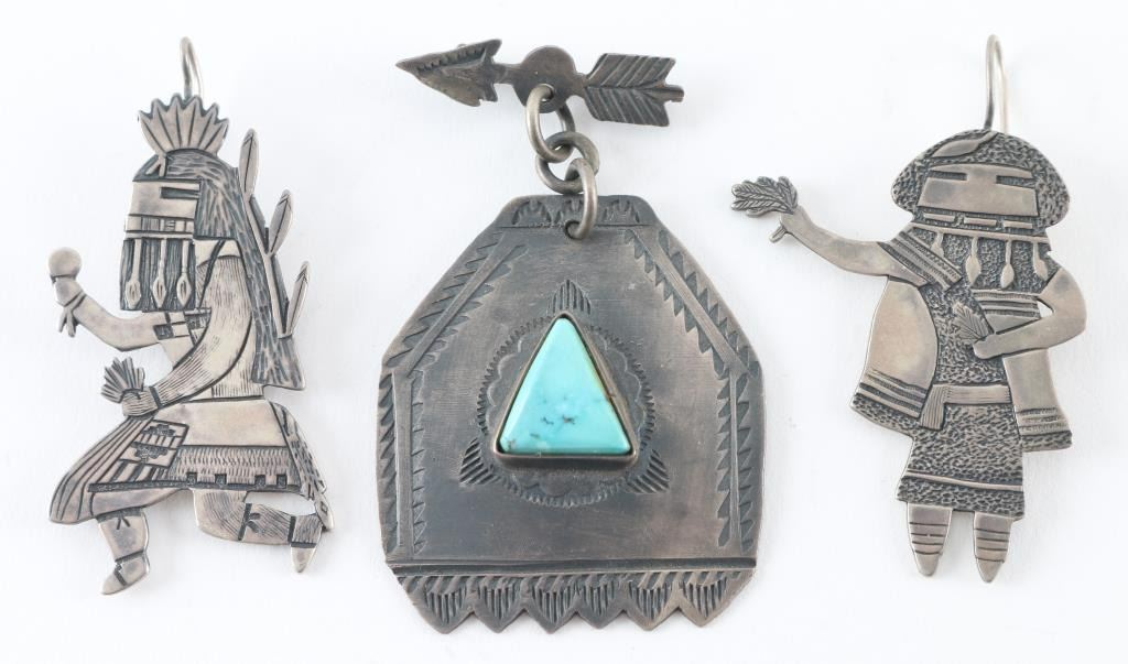 Hopi sterling Kachina earrings and Fred Harvey Style Pin with turquoise stone.