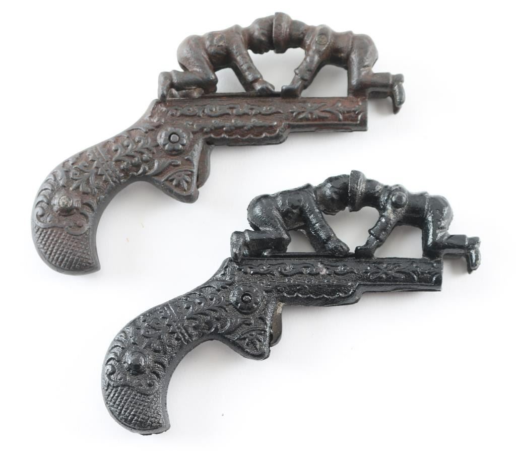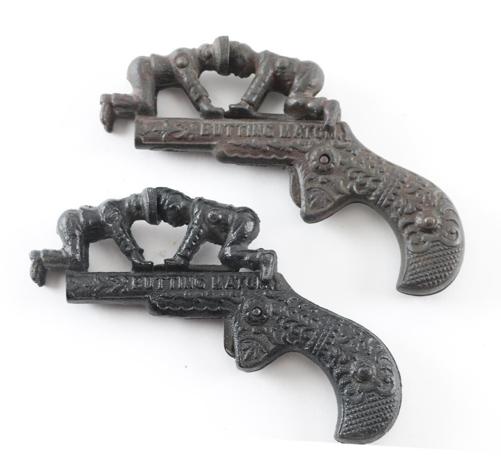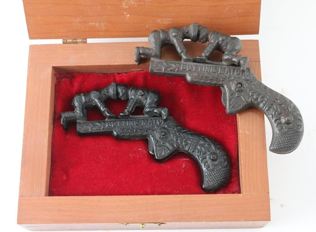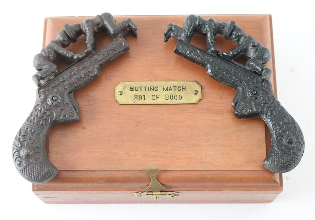 Made from Cast Iron children's toy cap gun (Entitled "Butting Heads") includes wooden box