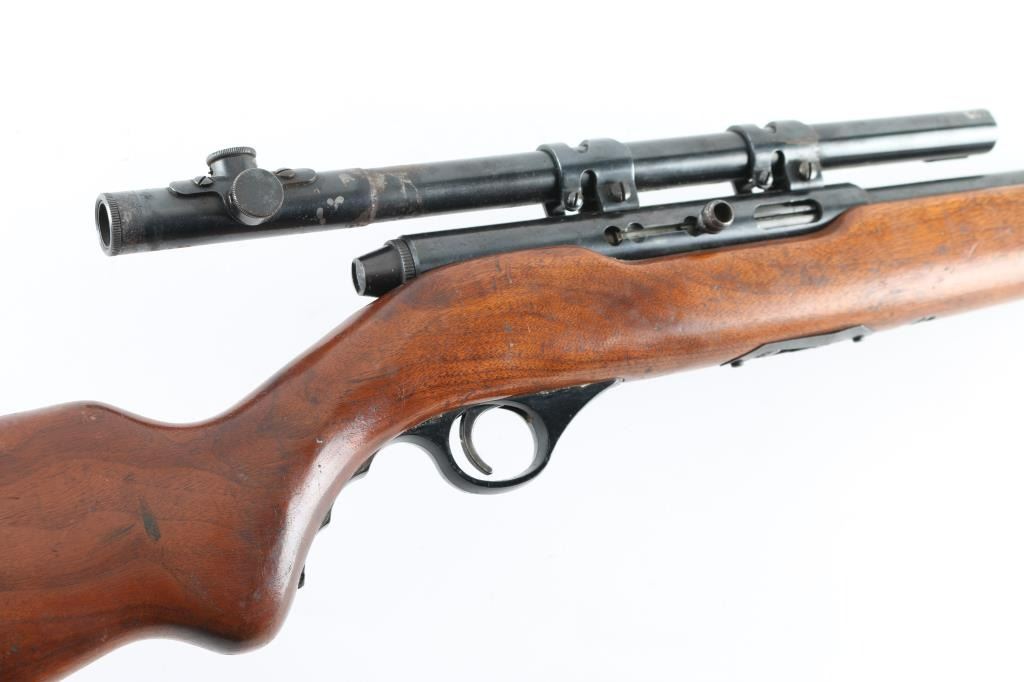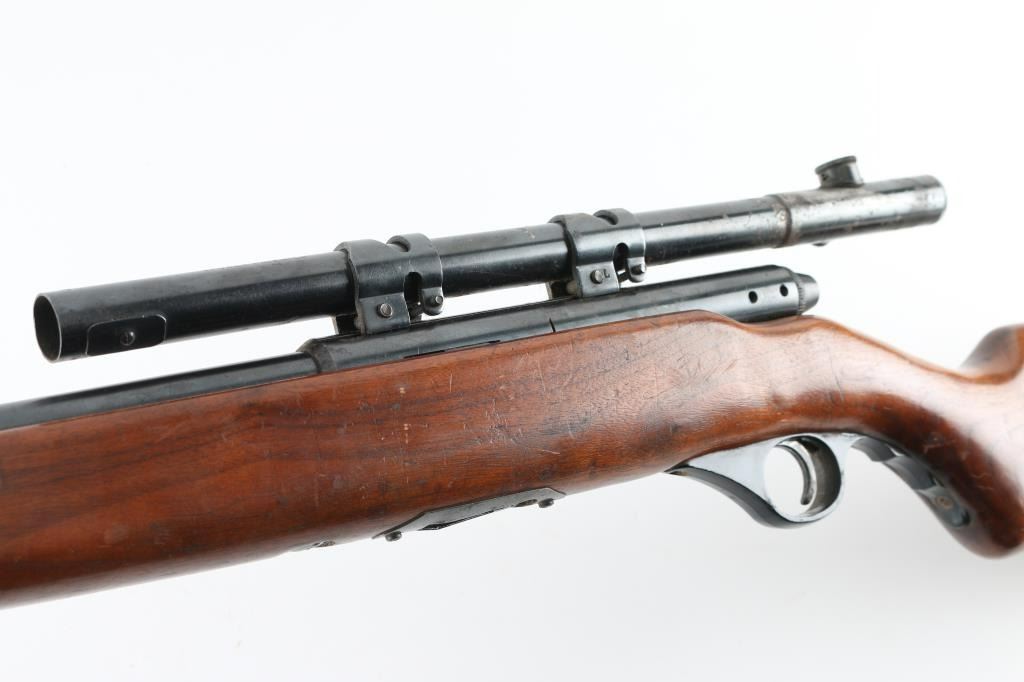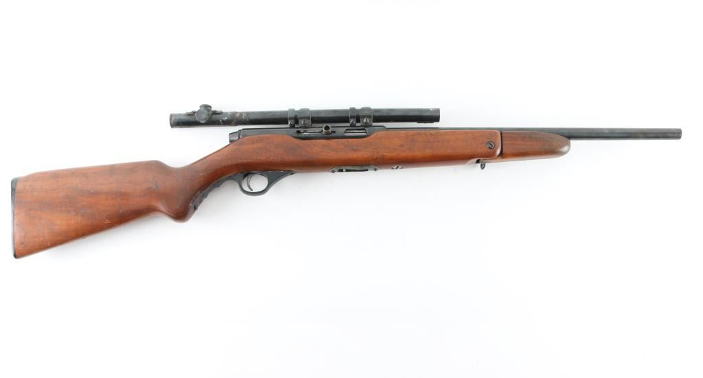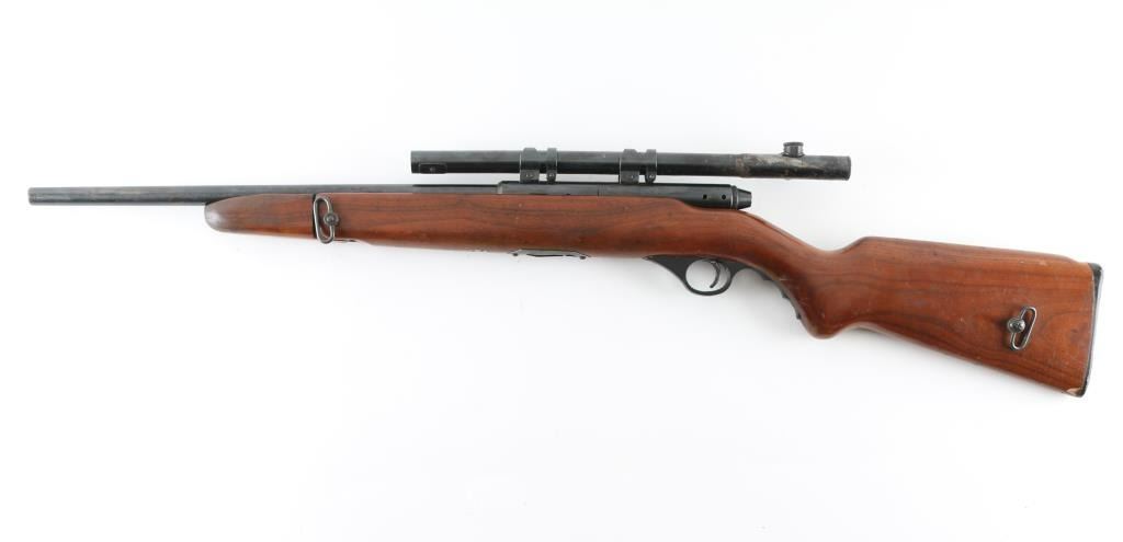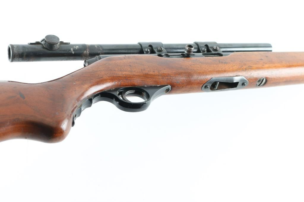 Vintage American made magazine fed semi-automatic sporting rifle chambered in .22 Long Rifle, manufactured circa 1948-1952. Features a blued finish, 16.50” barrel, no sights, smooth case hardened trigger, black plastic finger groove triggerguard, push in charging handle with slots for safe & bolt-hold-open and smooth walnut semi-pistol grip shoulder stock with fold-down forend used as grip, side mounted sling swivels & serrated black plastic buttplate Mounted with a Mossberg No. M4c 4x scope, clear optics, Rifle retains approximately 75% of its original blued finish showing scattered scratches and light surface rust, some spots of minor pitting. Action is sound, the bore is very good, and the wood stock is good with minor scratches/dings, there is a small chip on the left buttstock where it meets the buttplate. No magazine. NRA Condition-Good C&R Firearm