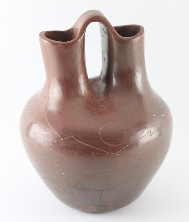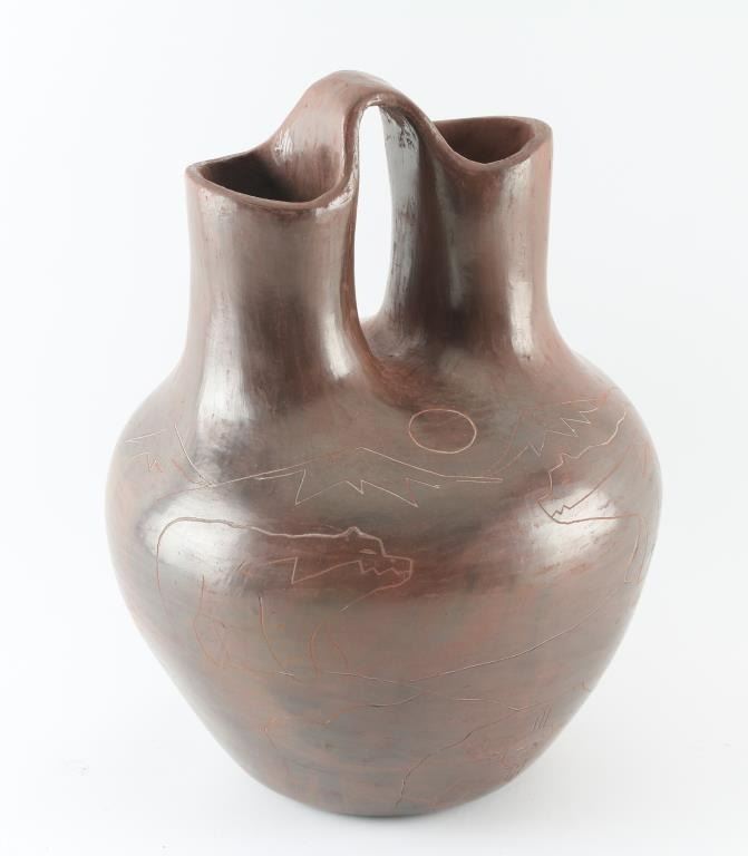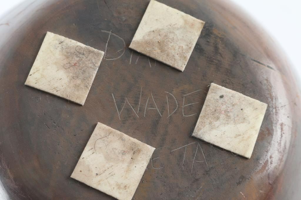 Terracotta pot with an incised carved bear design signed Diane Wade on base, measures 13"x9".
