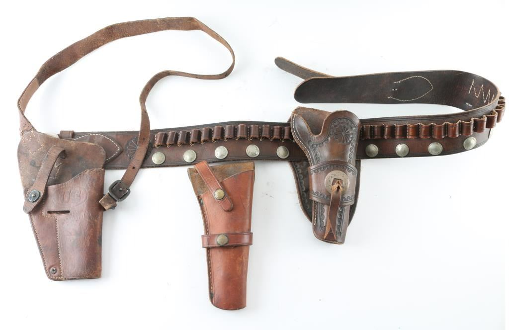 Includes a single holster rig, maker stamped "R.D.Gang" with indian head conchos. A "U.S" marked shoulder holster, and leather revolver holster maker marked "Beaver Brother Manufacturing".