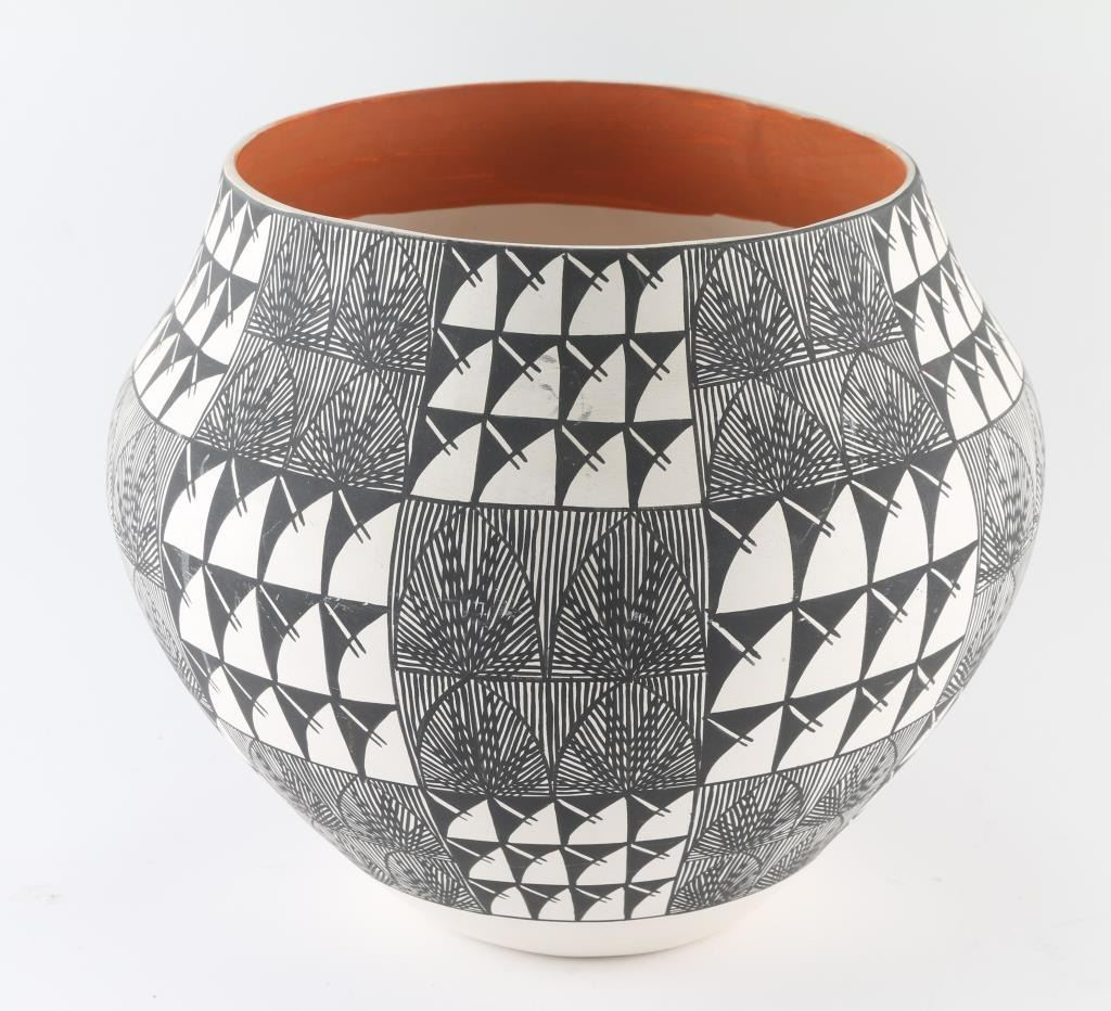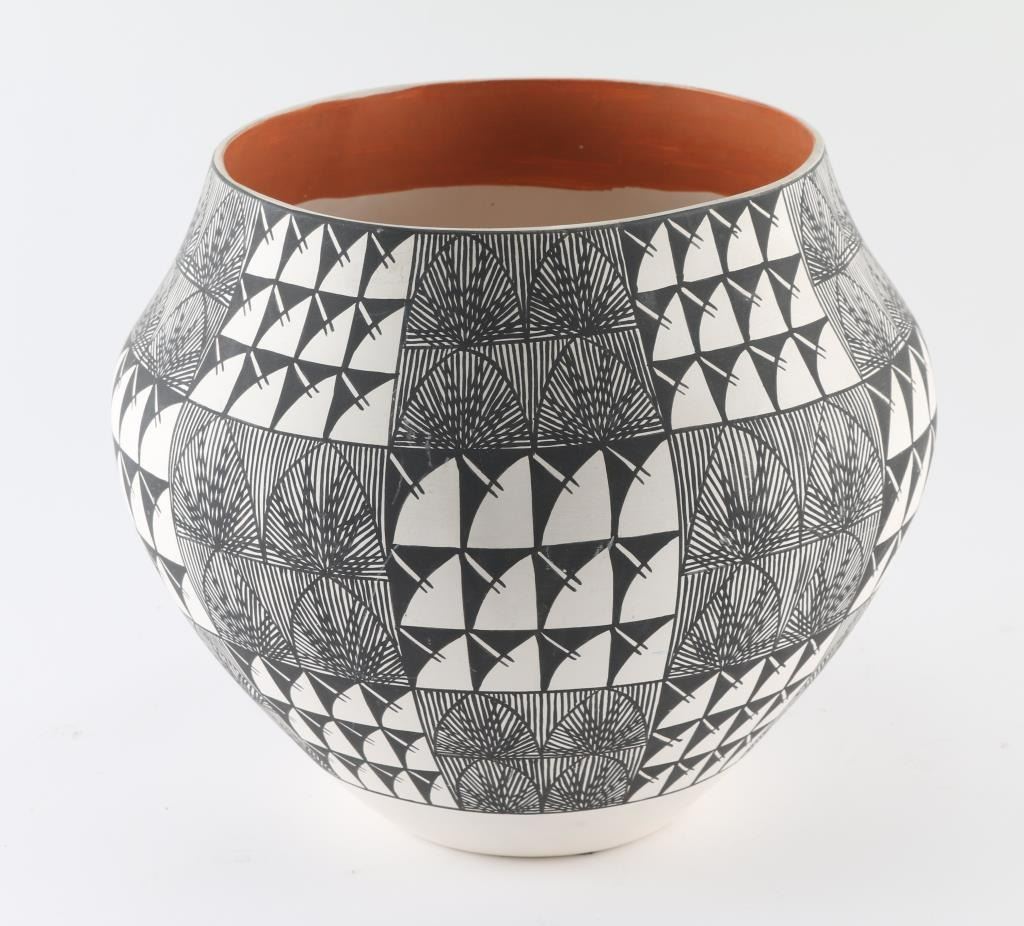 with white and black geometric design signed on base IRM with a rain cloud, measures 10"x11" approx. In very good condition.