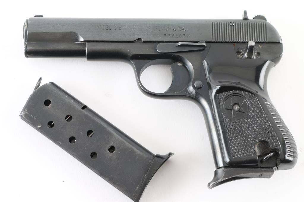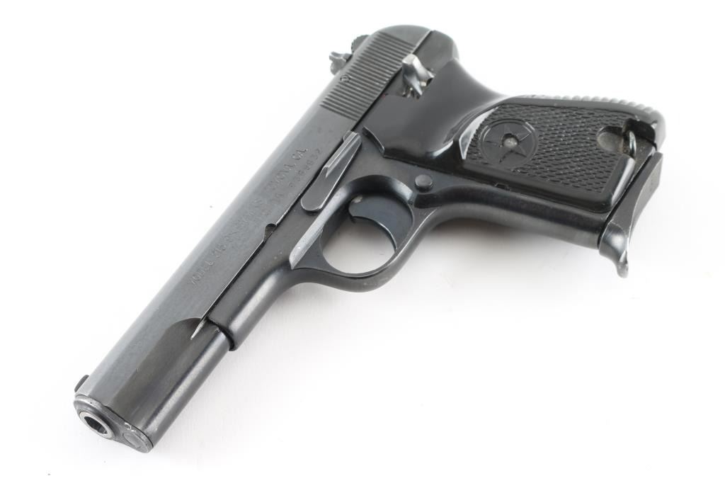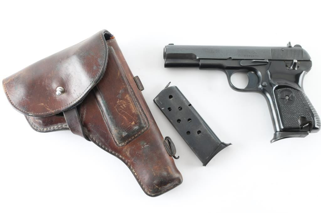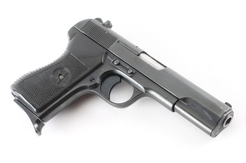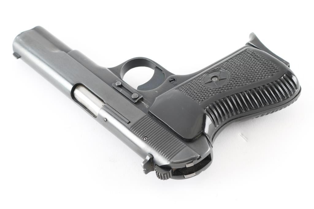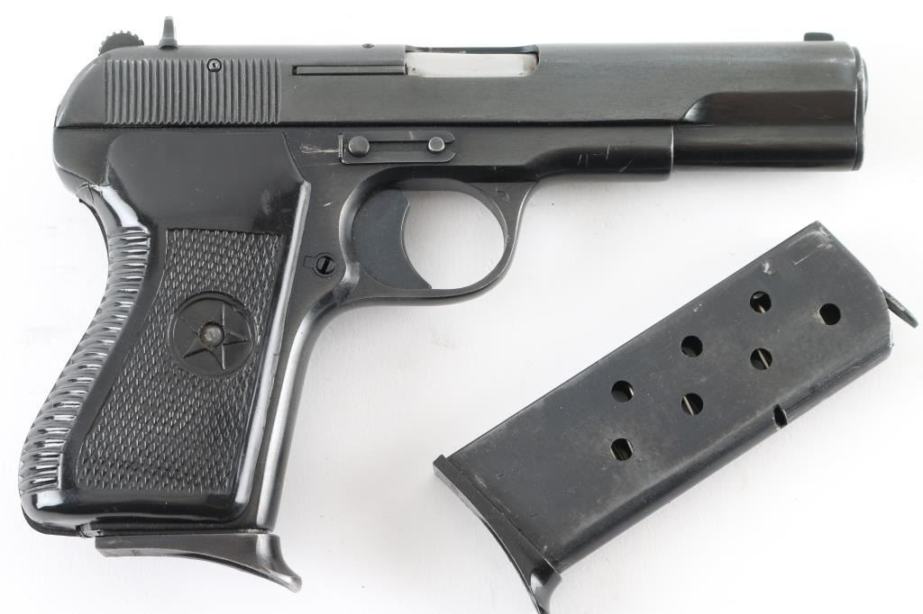 Chinese made semiautomatic pistol imported by KSI, Pomona CA. A slightly modified Tokarev pistol, features 4.4" barrel, fixed sights, single action, frame mounted manual safety, lanyard loop on frame, pushbutton mag release, blued finish, checkered black plastic grips with heel hump & embossed star emblem. This model appears to use standard Tokarev magazines, as opposed to some model 213 pistols that use a narrow magazine and have a narrow spacer pinned into the mag well. The safety does not 'click' positively into either position. Bore is very good. Retains 85% dark black finish, with light patina scattered throughout. Grips are very good. Serial number matches on slide. Two magazines provided, both with pinky rest bases, numbered but not matching. Includes a Fair/Good leather full flap holster, dark brown with pouch for the spare mag, slots for cleaning rod (no rod provided), interior is dark blue corduroy textured cloth. Condition is NRA Very Good *** Modern Firearm ***